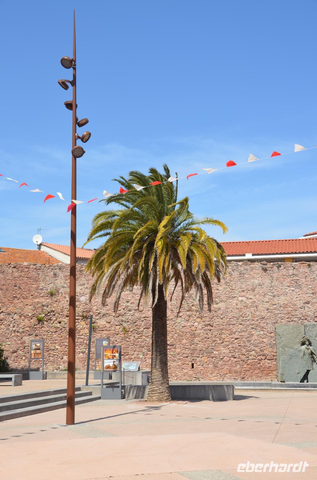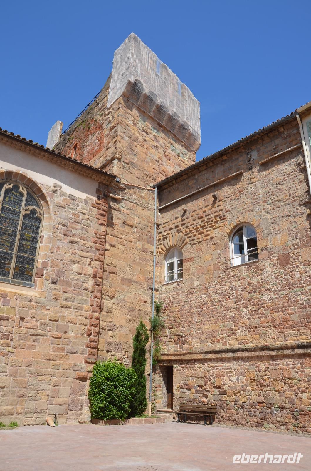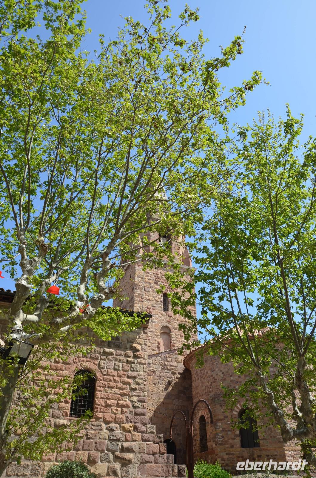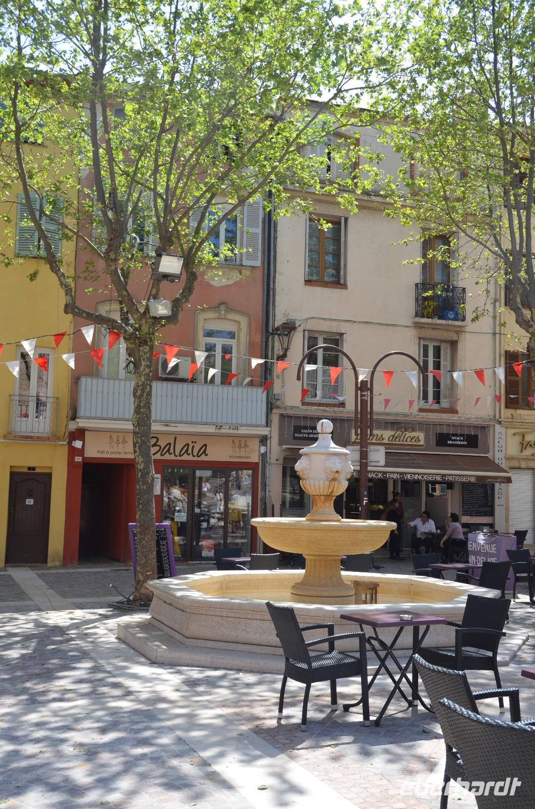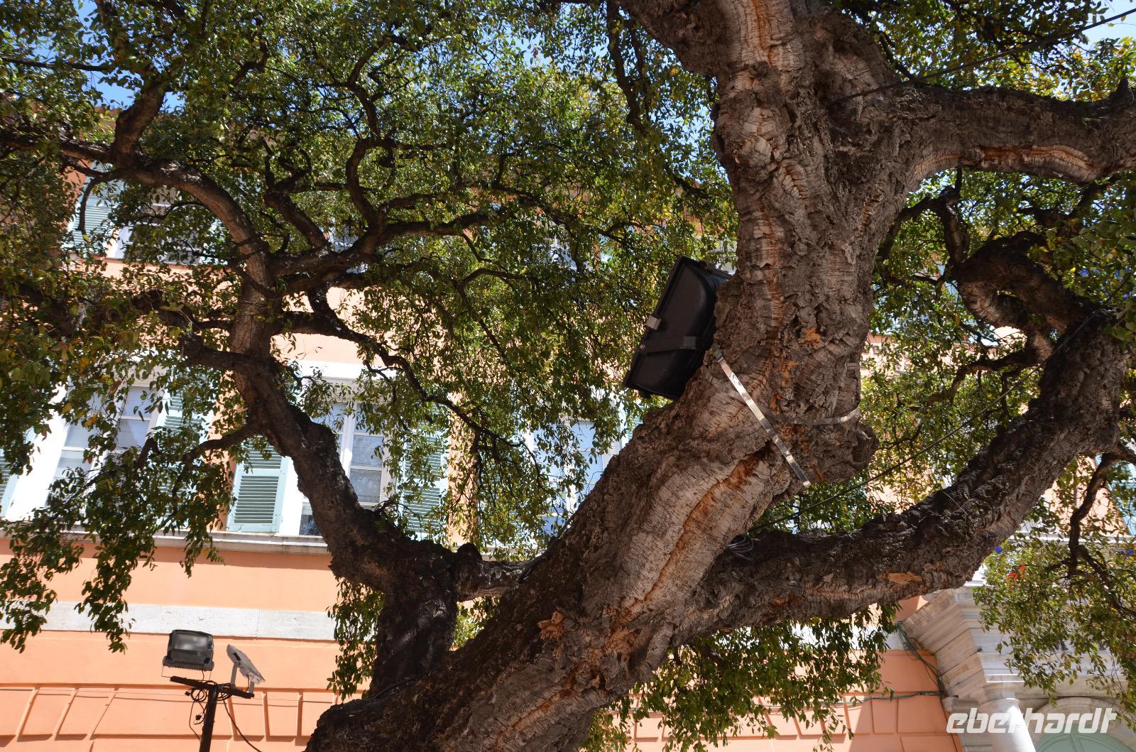 Um die Stadt herum wurde im 16. Jahrhundert eine Mauer errichtet, vor allem wegen der Religionskriege. Bei einem Rundgang durch die Ortschaft, erreichten wir als erstes die Kathedrale mit ihrem Glockenturm. Bereits Anfang des 5. Jahrhunderts stand hier eine Taufkapelle, welche heute noch erhalten ist. Wir hatten das Glück durch ein Tor in die 2. älteste Taufkapelle Frankreichs zu blicken. Bei unserem Spaziergang fielen uns vor allem die vielen bunten Wimpel auf, die vor den cremefarbenen Häuserfassaden einen schönen Kontrast und ein tolles Fotomotiv darstellten. Auf dem zentralen Platz von Fréjus wurde zum Ende des Krieges am 11.11.1918 eine Korkeiche gepflanzt. So hatten wir die Möglichkeit diesen interessanten Baum auch aus der Nähe zu betrachten und die Rinde zu berühren. Weiter in der Stadtmitte, zwischen den Häusern entdeckten wir einen alten Olivenbaum, der wohl aus dem 11. Jahrhundert stammen soll.