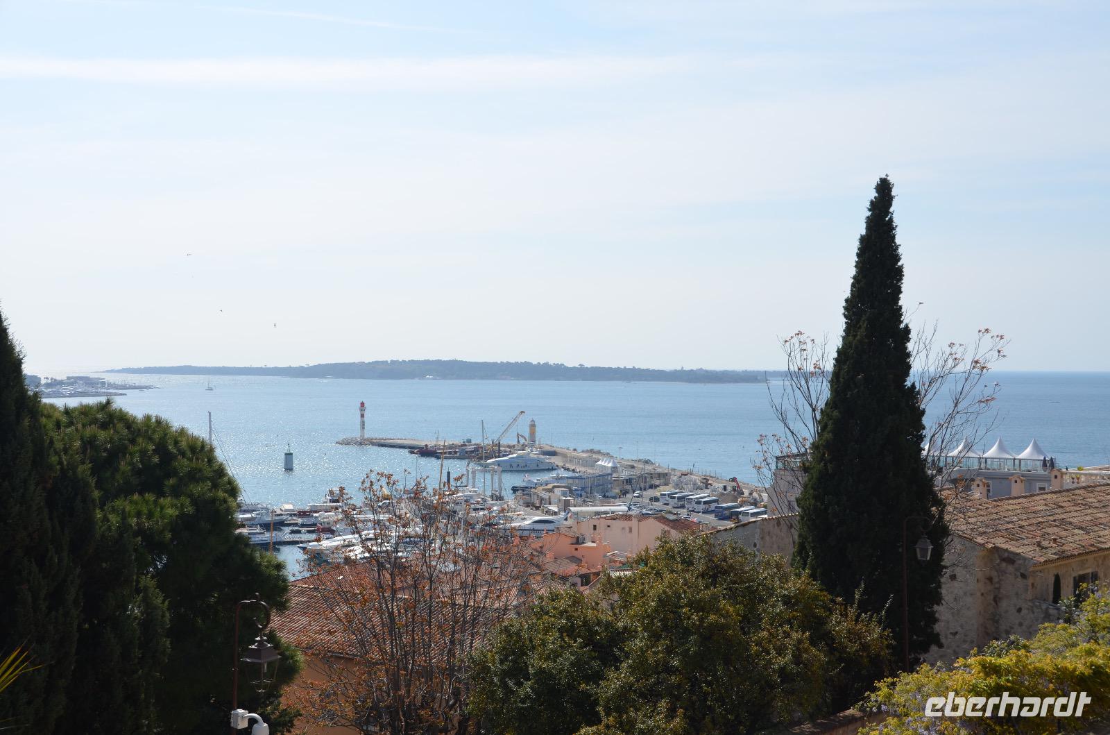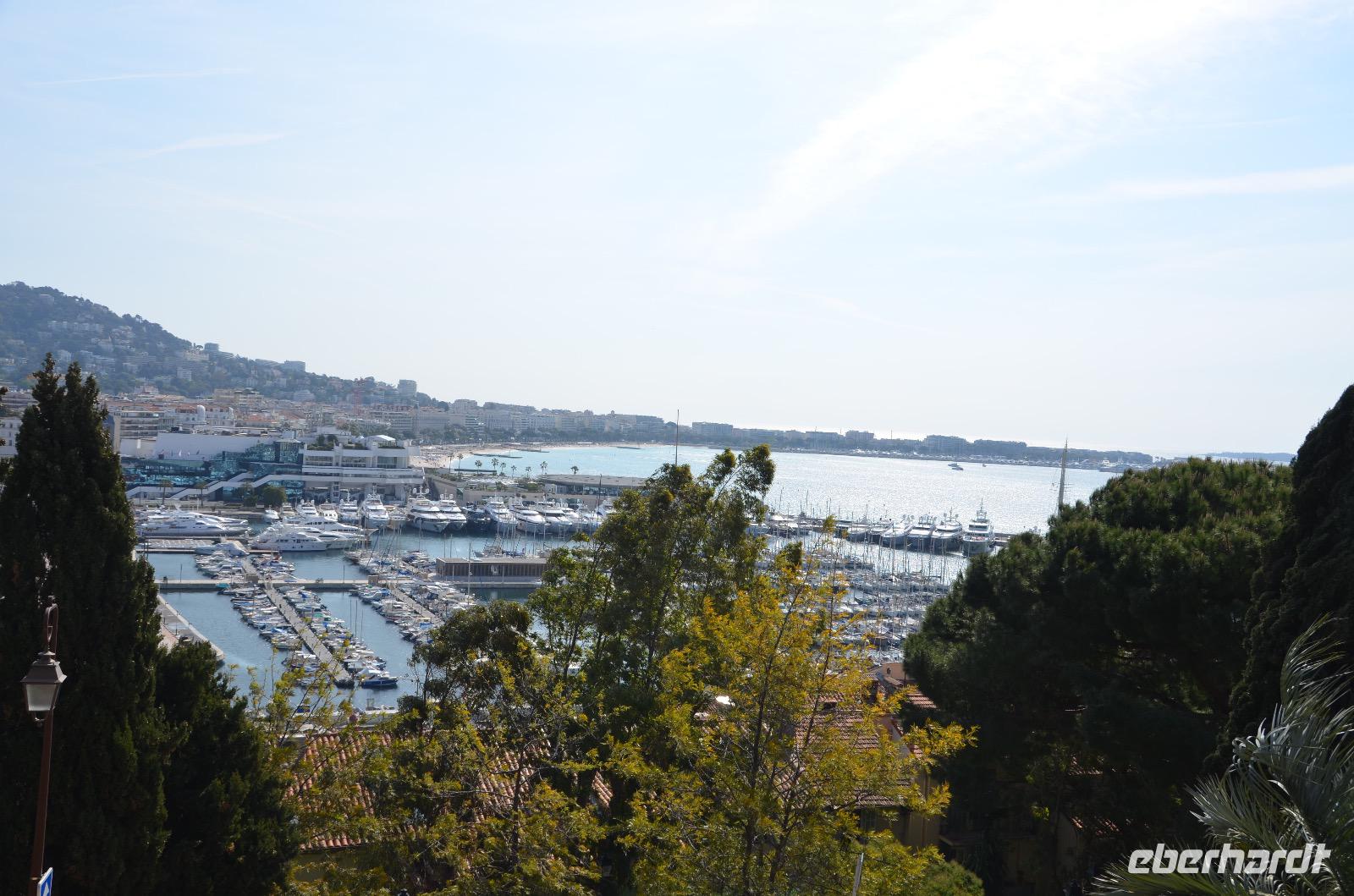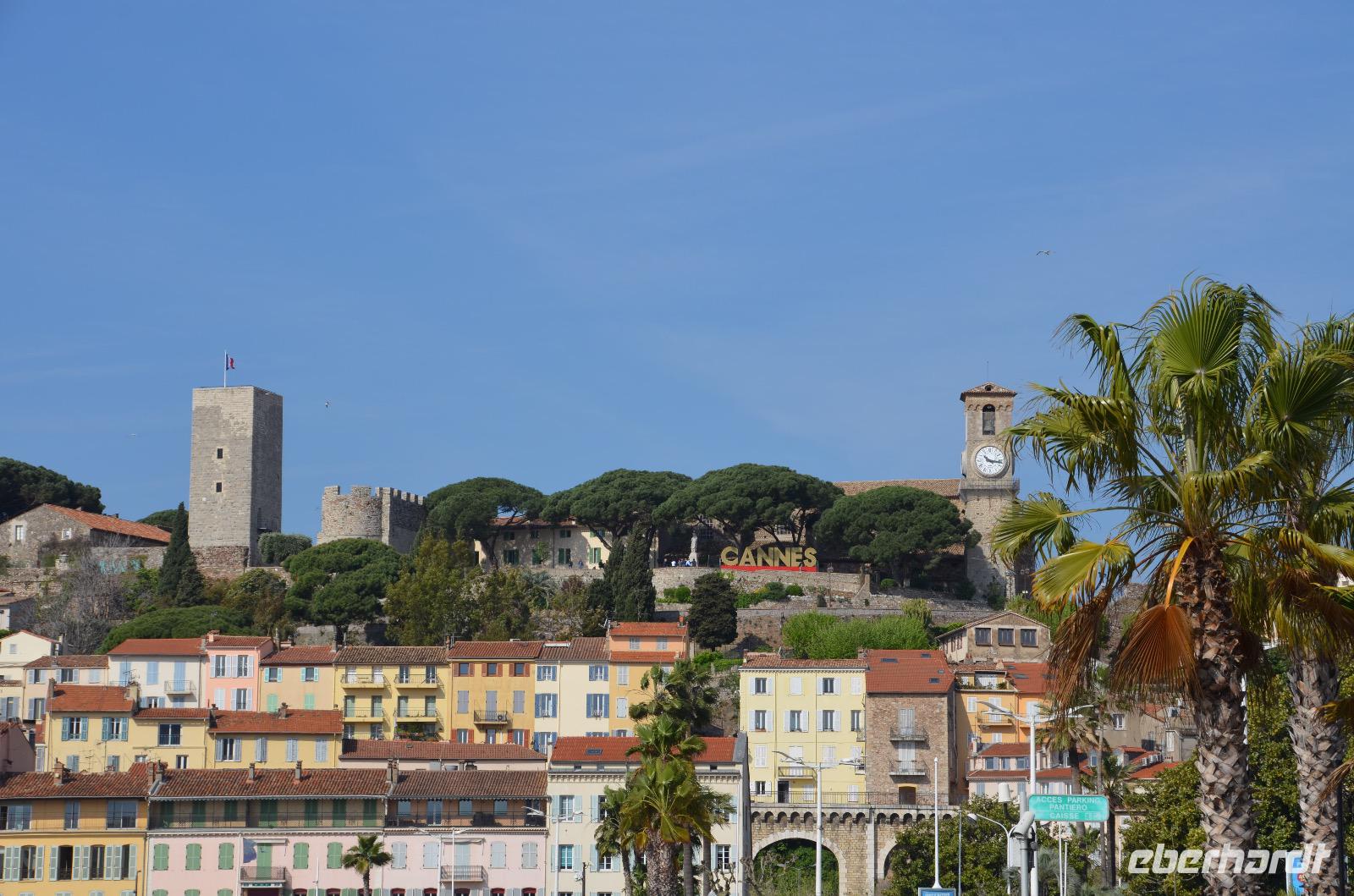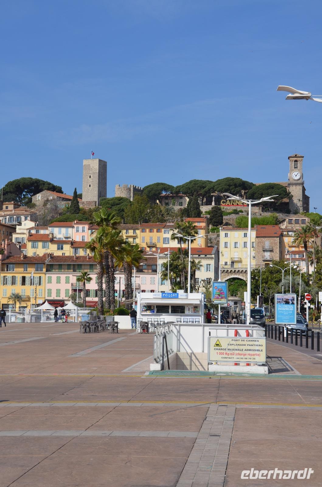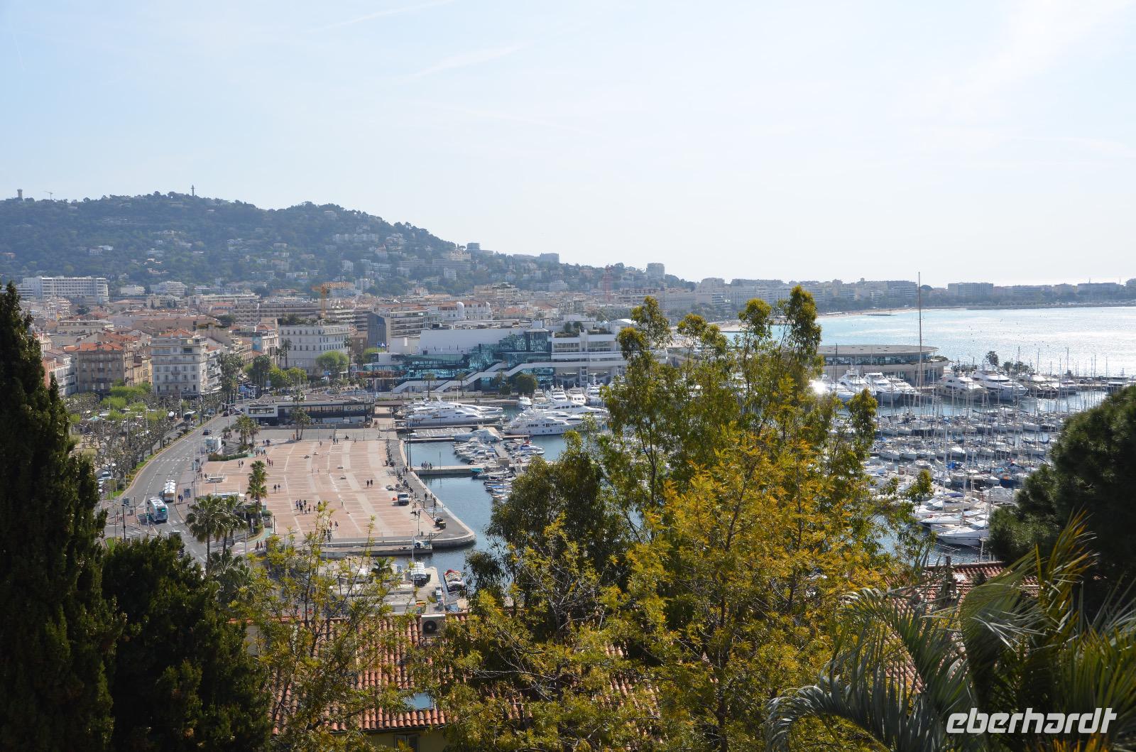 Hier angekommen, stiegen wir am alten Hafen aus dem Bus. Auch hier lag wieder eine Yacht, nach der anderen. Als erstes Fotomotiv bot sich uns der Gare Routière, dessen Fassade mit vielen Berühmtheiten der Filmgeschichte bemalt ist. Wir stiegen hinauf in die Altstadt Le Suquet. Oben auf dem Berg befindet sich unter anderem ein Wachturm aus dem 11. Jahrhundert, mit dem Schloss und seiner Kapelle. Man hat aber außerdem eine unglaubliche Sicht auf die zu Füßen liegende Stadt mit Hafen und Filmpalast. Zurück durch die schmalen Gassen mit den bepflanzten, schmiedeeisernen Balkonen, ging es Richtung Hafen. Bei der anschließenden Freizeit, nutzten viele von uns die Gelegenheit ein Bild auf dem roten Teppich zu ergattern, der auf der Treppe des Filmpalasts liegt. Um das Casino und den Saal herum befindet sich außerdem der Boulevard der Stars mit den Handabdrücken und Unterschriften vieler Filmstars.