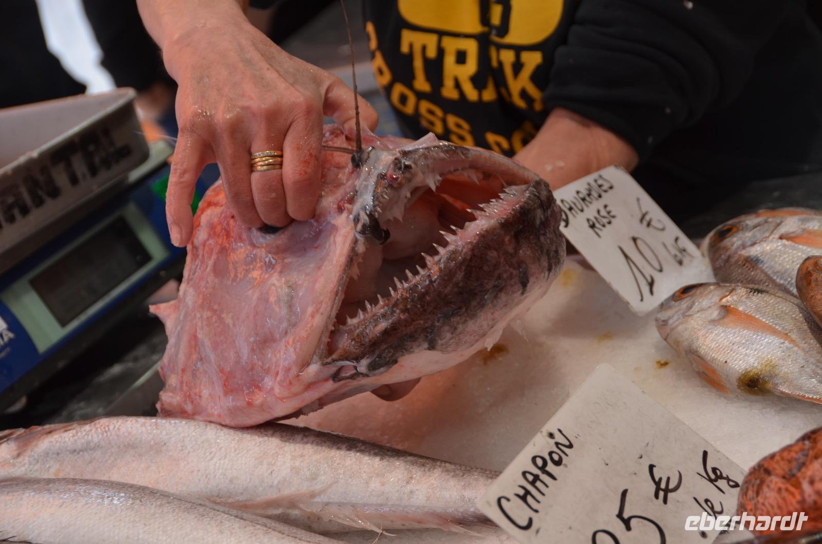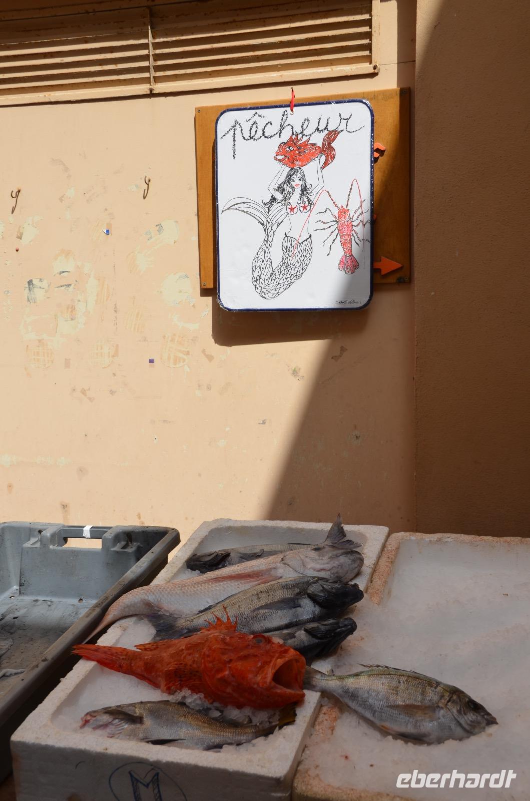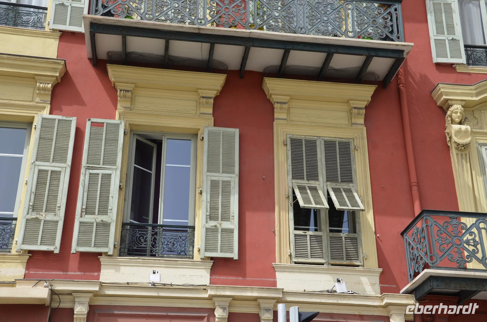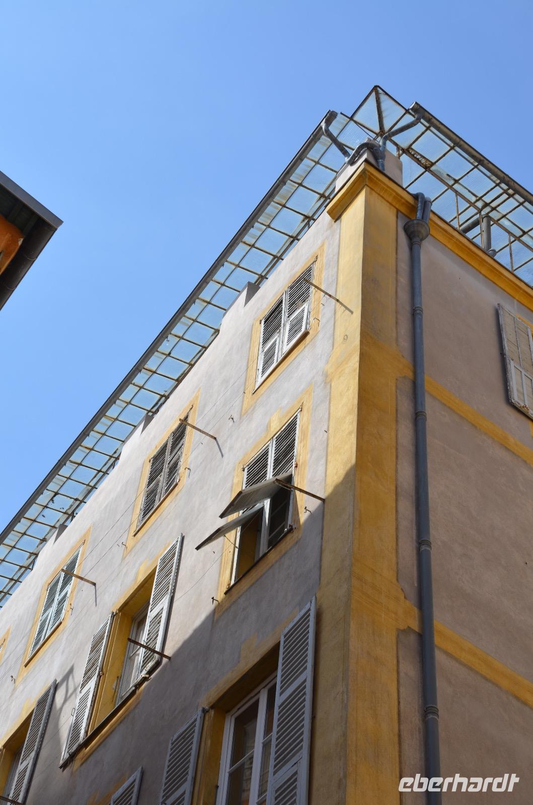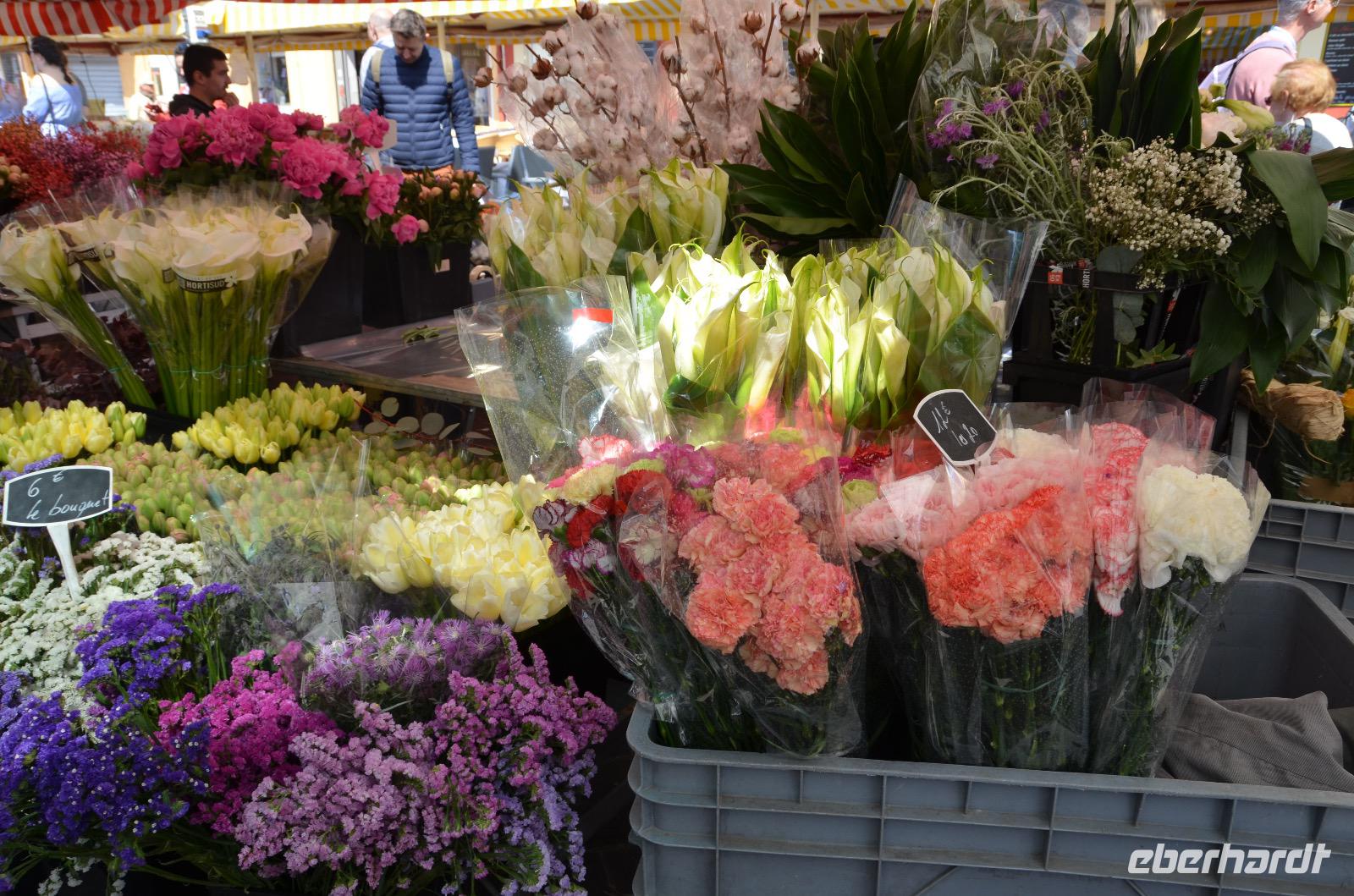 In der Altstadt angekommen, liefen wir durch die schmalen Gassen. Wir waren überrascht, dass sich hier noch die Autos durchdrängelten. Vorbei an der Rue Droite, der ehemaligen Hauptstraße Nizzas, ging es für uns zum Place Rossetti sowie Place Viellle. Uns viel auf, dass einige Wohnhäuser nur Attrappen von Fenstern haben, die an die Häuserwand gemalt sind. Diese Malereien sind mit den Schattierungen so raffiniert gemacht, dass es einem erst beim zweiten Mal hinschauen auffällt. Die echten Fenster haben ganz spezielle Fensterläden, welche teilweise kippbar sind, sodass zwar das Tageslicht in den Raum fällt, jedoch nicht die ganze Hitze eindringen kann. Bevor es Richtung Blumenmarkt ging, besichtigten wir die Jesukirche aus dem 16./17. Jahrhundert. Wir waren beeindruckt von dem prunkvollen barocken Stil in der kleinen Kirche. Im Inneren sind bis zu 120 verschiedene Engelsfiguren zu finden. Unsere Mittagspause verbrachten wir auf dem Markt, nur die Saleyas, die Häuser für die damalige Salzlagerung, trennen die Marktstände von der Strandpromenade. Wir schlenderten über den Marché aux Fleurs, wo es nicht nur Blumen, sondern auch zahlreiche, lokale Lebensmittel zu erwerben gibt.