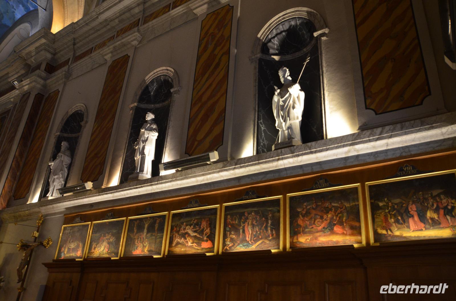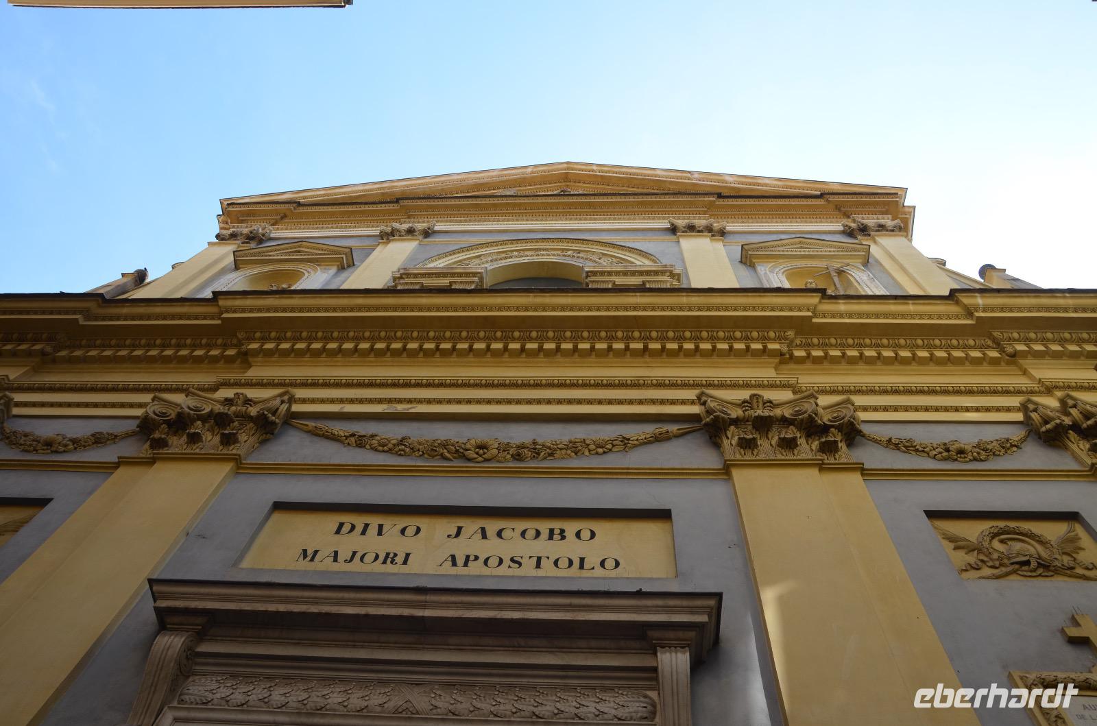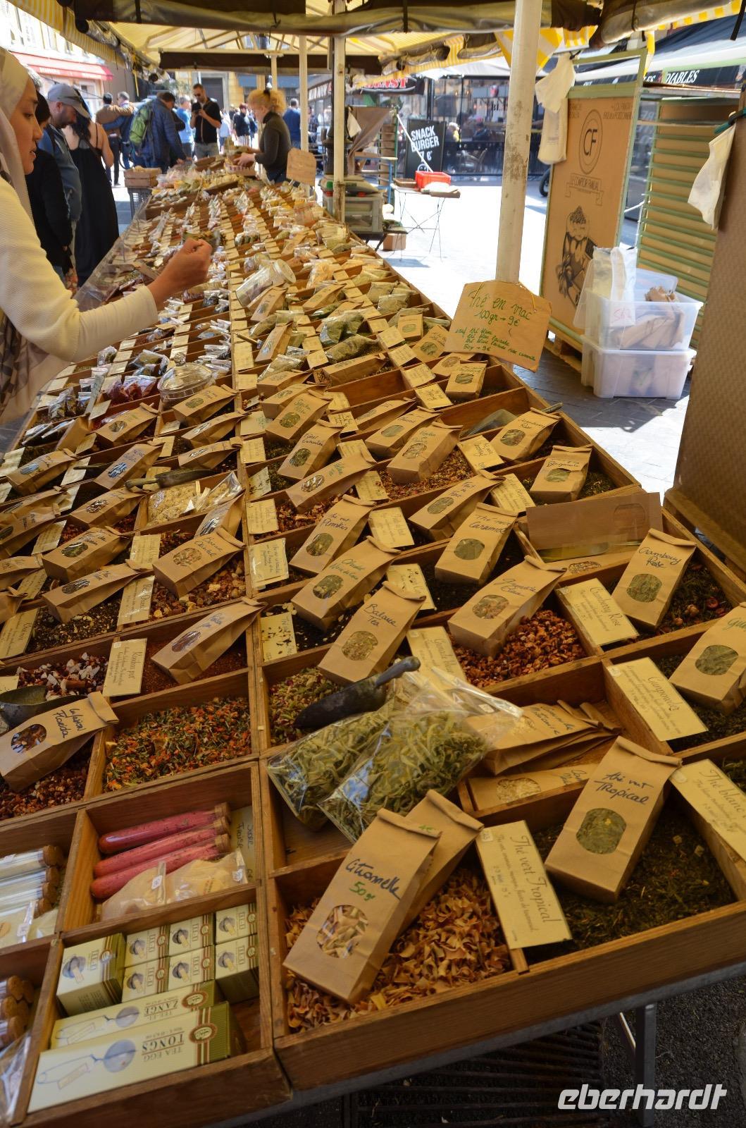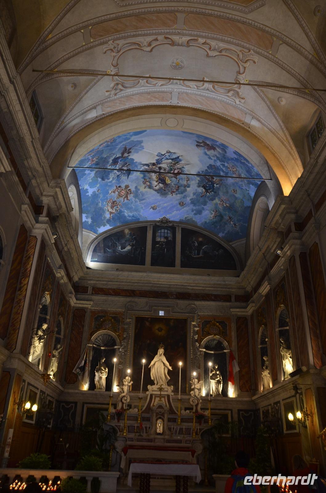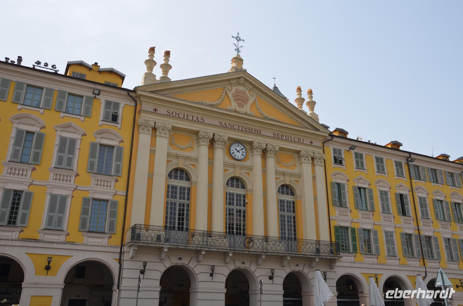 In der Altstadt angekommen, liefen wir durch die schmalen Gassen. Wir waren überrascht, dass sich hier noch die Autos durchdrängelten. Vorbei an der Rue Droite, der ehemaligen Hauptstraße Nizzas, ging es für uns zum Place Rossetti sowie Place Viellle. Uns viel auf, dass einige Wohnhäuser nur Attrappen von Fenstern haben, die an die Häuserwand gemalt sind. Diese Malereien sind mit den Schattierungen so raffiniert gemacht, dass es einem erst beim zweiten Mal hinschauen auffällt. Die echten Fenster haben ganz spezielle Fensterläden, welche teilweise kippbar sind, sodass zwar das Tageslicht in den Raum fällt, jedoch nicht die ganze Hitze eindringen kann. Bevor es Richtung Blumenmarkt ging, besichtigten wir die Jesukirche aus dem 16./17. Jahrhundert. Wir waren beeindruckt von dem prunkvollen barocken Stil in der kleinen Kirche. Im Inneren sind bis zu 120 verschiedene Engelsfiguren zu finden. Unsere Mittagspause verbrachten wir auf dem Markt, nur die Saleyas, die Häuser für die damalige Salzlagerung, trennen die Marktstände von der Strandpromenade. Wir schlenderten über den Marché aux Fleurs, wo es nicht nur Blumen, sondern auch zahlreiche, lokale Lebensmittel zu erwerben gibt.
