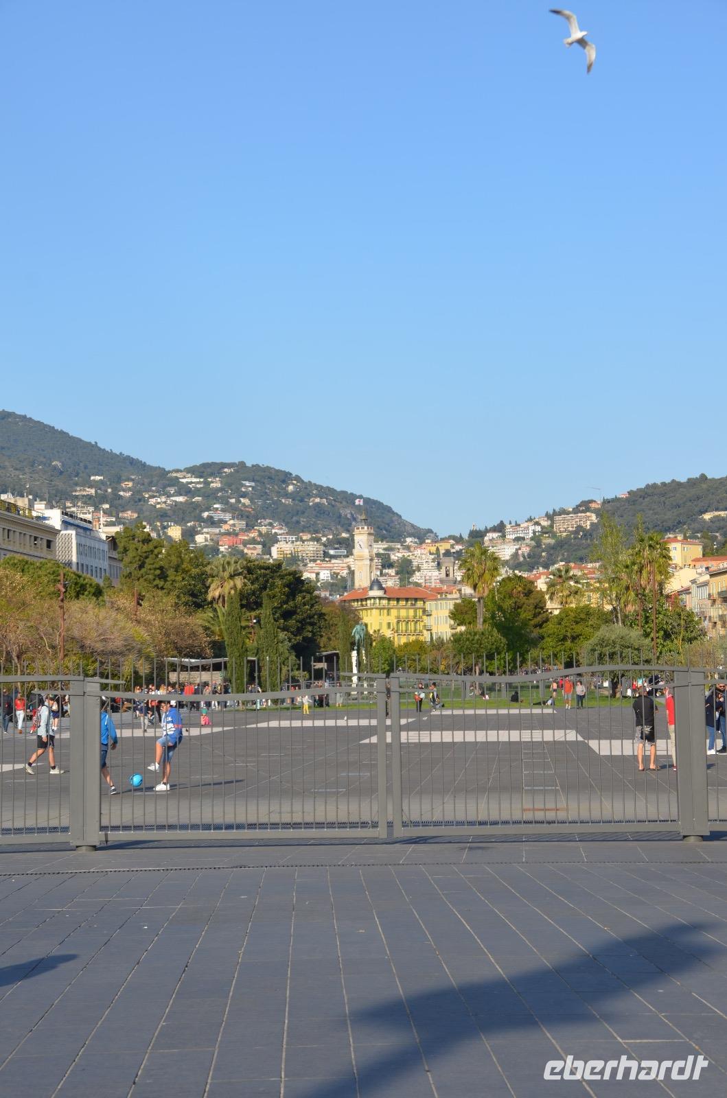 Die meisten von uns flogen erst am Abend Richtung Heimat und hatten so noch einmal Zeit, um Nizza zu genießen. Wir ließen uns ein letztes französisches Frühstück schmecken und verabschiedeten die ersten Mitreisenden aus unserer Gruppe, bevor wir uns zu einem Spaziergang durch die Stadt aufmachten. Unser Ziel war der Aussichtspunkt auf dem Colline du Château. Als wir hier ankamen, mussten wir leider feststellen, dass aufgrund des angekündigten Sturms alle Parks von Nizza geschlossen wurden. Den für die Küste typischen, starken Wind, den Mistralle, kannten wir von den vergangenen Tagen ganz gut.