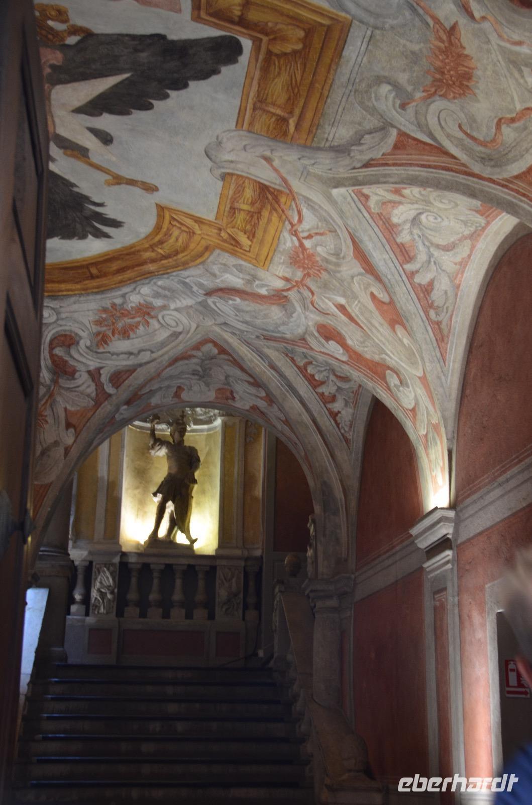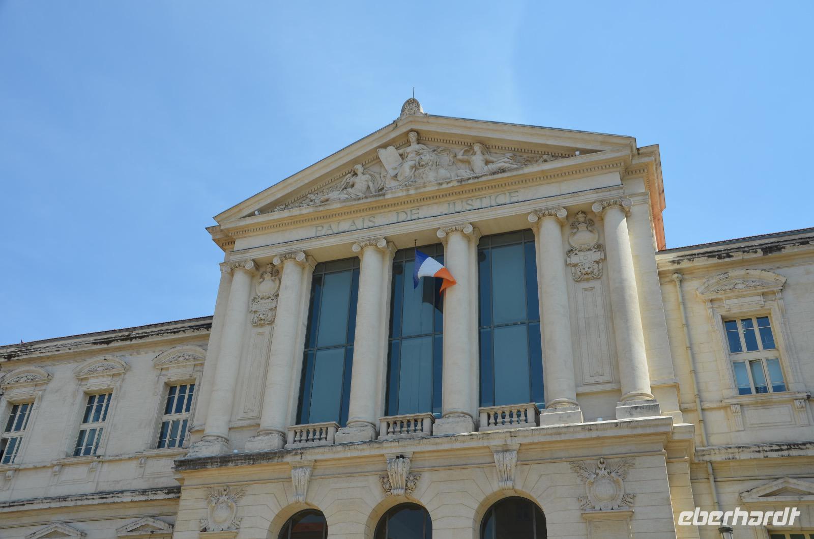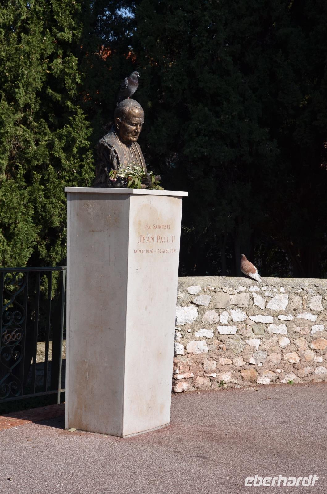 Für uns ging es weiter in die Altstadt aus dem 19. Jahrhundert. Monaco versprühte sofort einen multikulturellen und lebendigen Charme, was bei 150 verschiedenen Staatsangehörigkeiten, die hier leben, kein Wunder ist. Unser Bus ließ uns in der Nähe des ozeanographischen Museums raus. Wir waren mächtig beeindruckt von dem prächtigen Bau. Gegenüber steht die erste öffentliche Schule Monacos. Wir liefen durch den exotischen Garten des Fürstentums zu einem Aussichtspunkt. Hier konnte man gut sehen, wie durch Aufschüttung Land für das neue Viertel gewonnen wurde. Das hat ungefähr 7-8 Jahre lang gedauert. Man konnte auch das Fußballstadion entdecken, indem bis zu 20.000 Zuschauer Platz haben. Vorbei an der Kathedrale und dem Gerichtspalast aus den 30er-Jahren, liefen wir Richtung Grimaldipalast. Uns fiel auf, dass die Straßenschilder alle zweisprachig beschriftet waren. Oberhalb Französisch und unterhalb Monegassisch. Zwischen den Straßen, wo sich die Touristen drängten, konnte man auch immer wieder überdachte Gassen finden. Diese dienten früher dem Zusammentreffen der Leute. Hier waren Sie vor Wind und Wetter geschützt und konnten sich trotzdem über die aktuellen Neuigkeiten austauschen. Auf dem Place du Palais steht eine Statue von Francois Grimaldi. Er schlich sich als Mönch verkleidet im Jahr 1297 in die Festung und besetzte sie mit Soldaten.