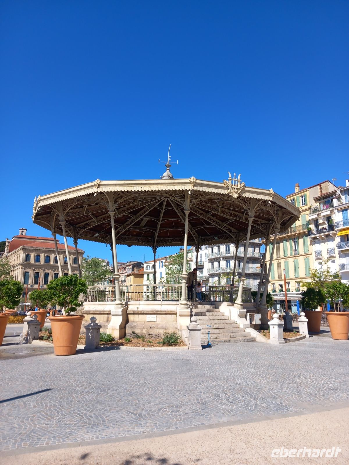 Wo es schön ist, da fahren alle hin. Das zumindest war unverkennbar auf dem Weg entlang der Küste über das Cap d´Antibes nach Cannes. Wir schafften es dennoch halbwegs pünktlich nach Cannes. Und zu unserer großen Freude, der rote Teppich vor dem Festspielhaus lag noch oder schon bereit. Aber dazu später. Denn Richard führte zunächst über die beiden Märkte entlang hoch zur Notre Dame de l´Esperance. So viel Hoffnung brauchten wir gar nicht, das Wetter ermöglichte uns einen atemberaubenden Blick über den Hafen von Cannes, die davor gelagerten Inseln und die Hotels an der Croisette.