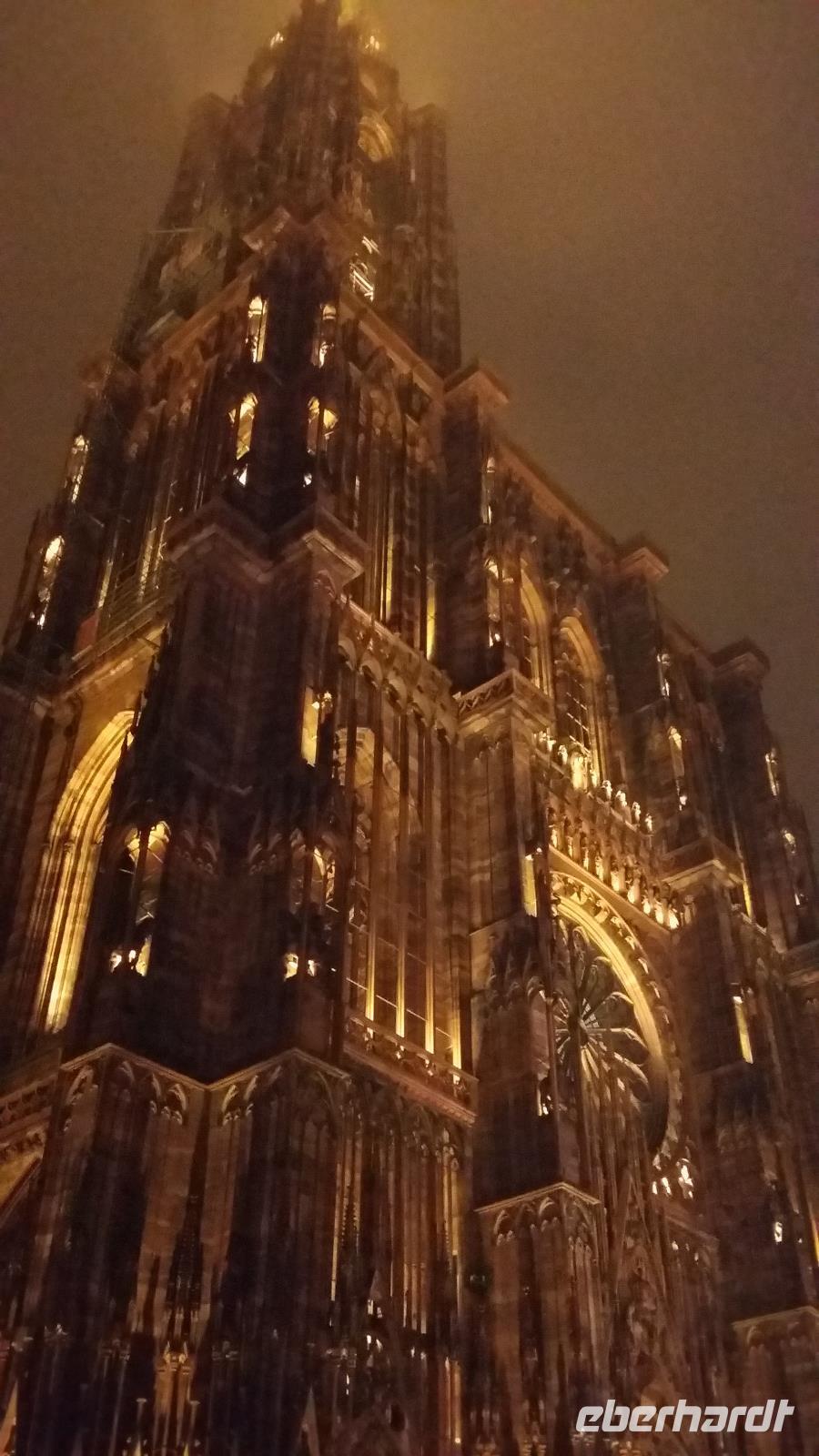 Der Blick aus dem Fenster heute Morgen zeigt wieder Nebel. Am Neujahrsmorgen lassen wir uns Zeit mit der Abfahrt zur Stadtrundfahrt. Erwartungsvoll starten wir elf Uhr mit Sophie Hof, unserer örtlichen Reiseleiterin, in den Tag zur Erkundung in Straßburg. Die einstündige Stadtrundfahrt u. a. mit dem Europaviertel, dem Blick auf die Störche im Park der Orangerie und die alten und neueren Gebäude und Brücken der Stadt. Bei kalten Temperaturen und etwas Wind sind wir im Anschluss zu Fuß unterwegs, wir laufen über die gedeckten Brücken, durch das Gerberviertel „Petite France" bis hin zum Stadtzentrum mit dem Wahrzeichen Straßburgs, dem Münster. Der 142m hohe Turm ist mit Raureif überzogen und heute hebt er sich heraus aus dem Nebel. Überall in den Gassen und an den Fachwerkhäusern ist eine herrliche Weihnachtsdekoration zu sehen, ganz anders wird im Elsass geschmückt, fast jede Fassade trägt einen anderen Festschmuck und am Abend erstrahlen die Häuser im Lichterglanz und vermitteln ein besonderes Flair. Sophie hat uns fantastisch durch Straßburg geführt, ohne sie gehen wir im Anschluss ins Münster, Erklärungen zu den Sehenswürdigkeiten im Inneren gab sie uns vor der Kathedrale.