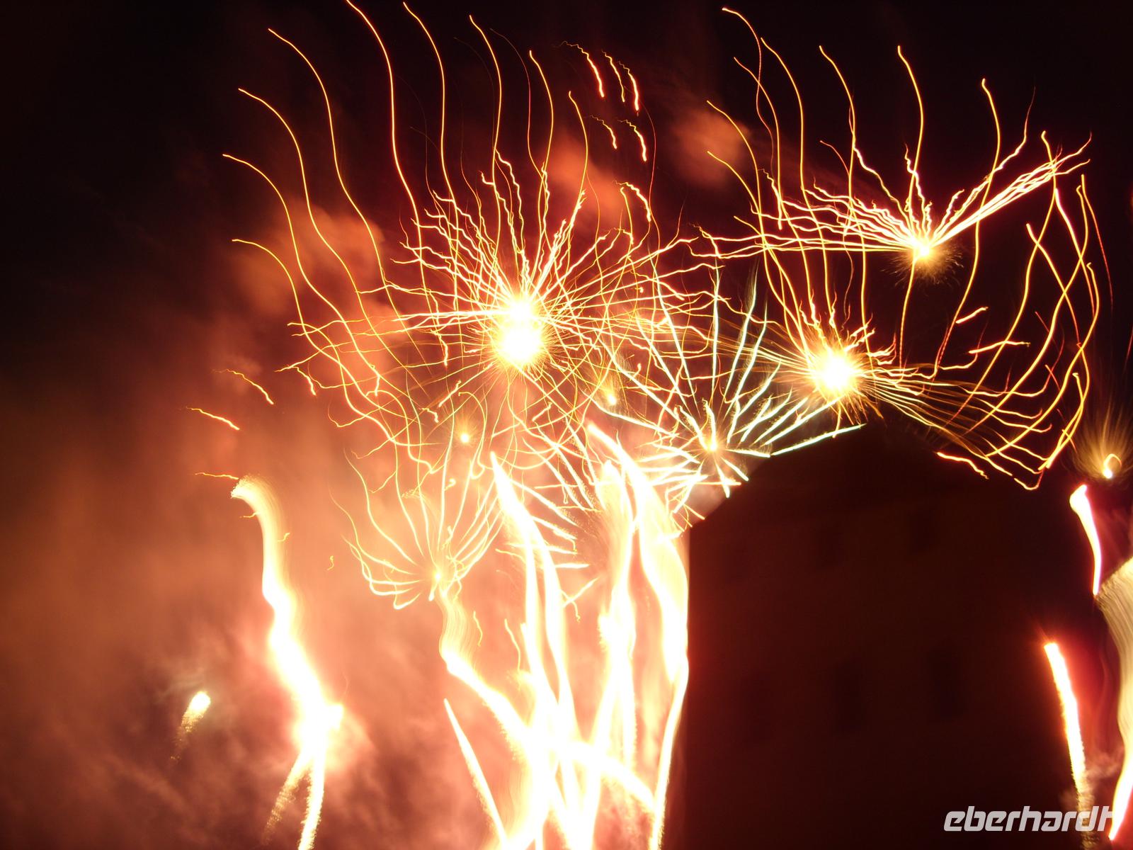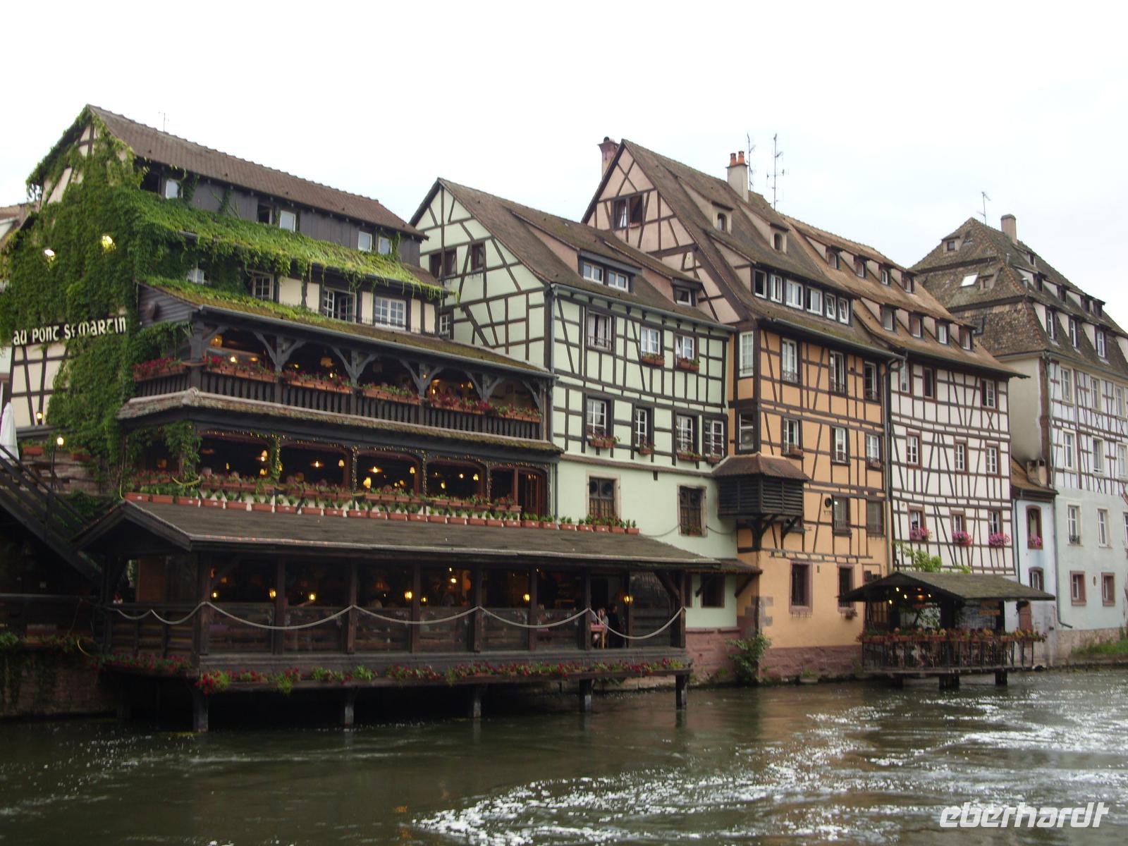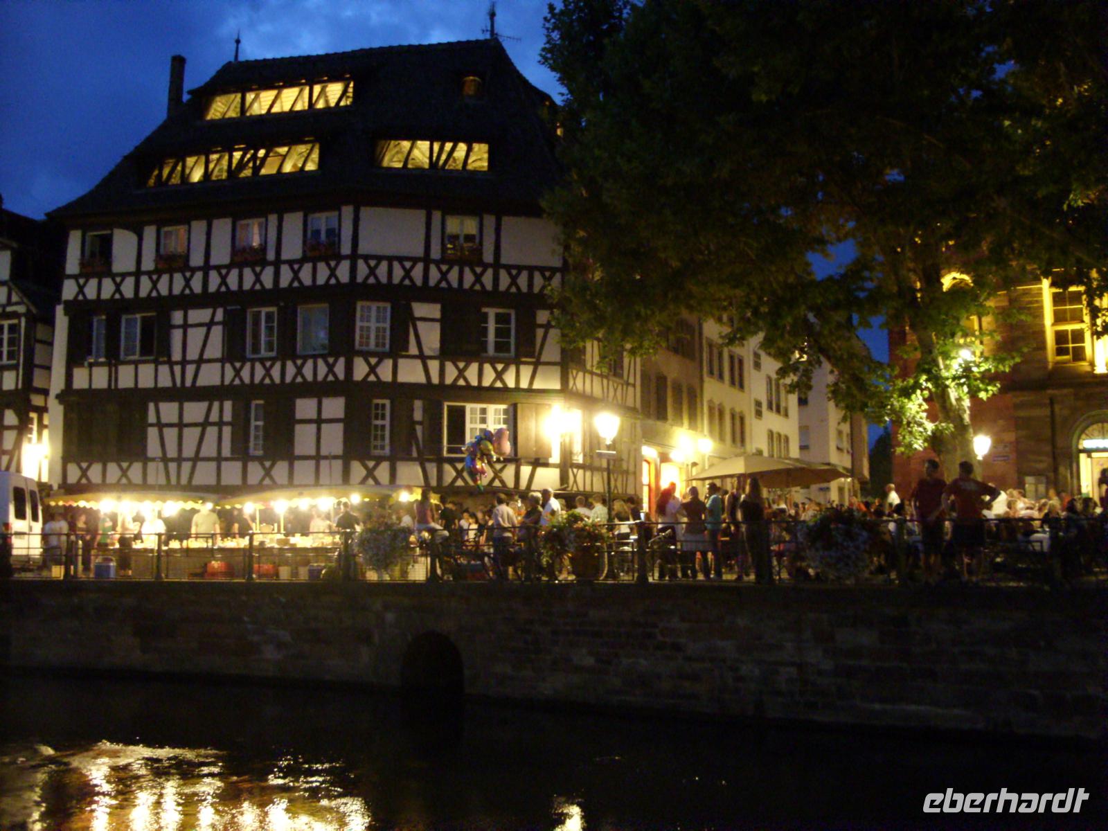 Aufgrund der Hitze von erneuten 35°C legten wir nachmittags im Hotel eine kleine Ruhepause ein. Frisch ausgeruht fuhren wir abends zurück in die Innenstadt, wo der Trubel des französischen Nationalfeiertags im Gegensatz zu den Morgenstunden nun deutlich zu spüren war. Nach dem Abendessen im beliebten Restaurant „La Chaîne d'Or" entschlossen sich fünf Gäste den Feierlichkeiten zum 14. Juli beizuwohnen und spätabends mit mir zusammen die Tram zurück zum Hotel zu nehmen. Diese Entscheidung lohnte sich! Erst wurde auf dem Place Kléber das Tanzbein geschwungen und anschließend wartete Petite France auf uns, von wo aus man das Feuerwerk am besten sehen konnte. Pünktlich 22.30 Uhr erlöschte das Licht und mit einem lauten Knall begann der Höhepunkt des Nationalfeiertags. Es war definitiv ein atemberaubend schönes Feuerwerk!