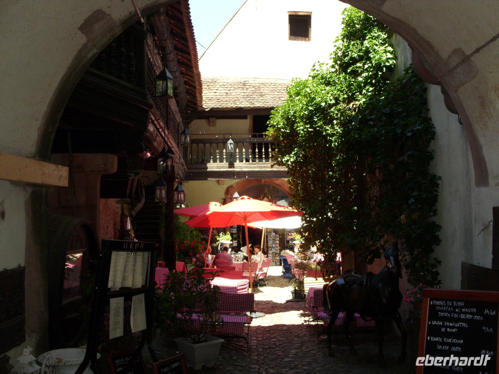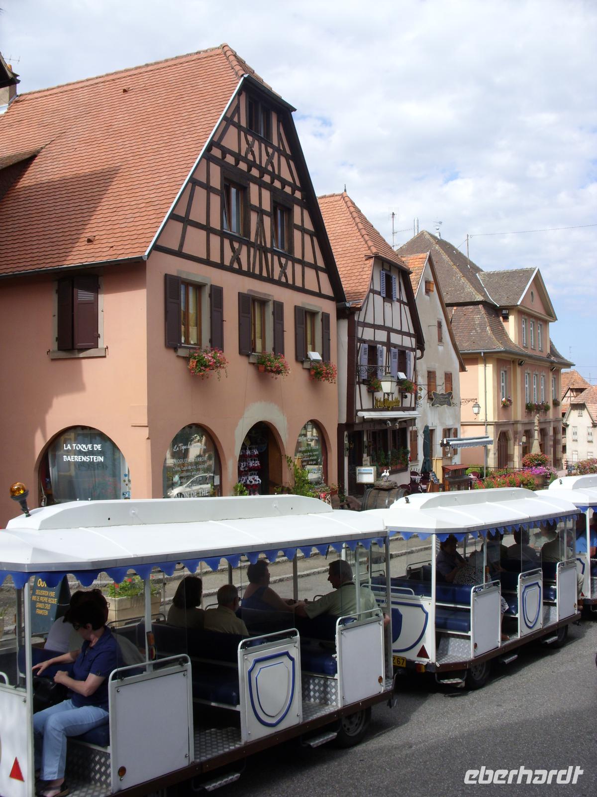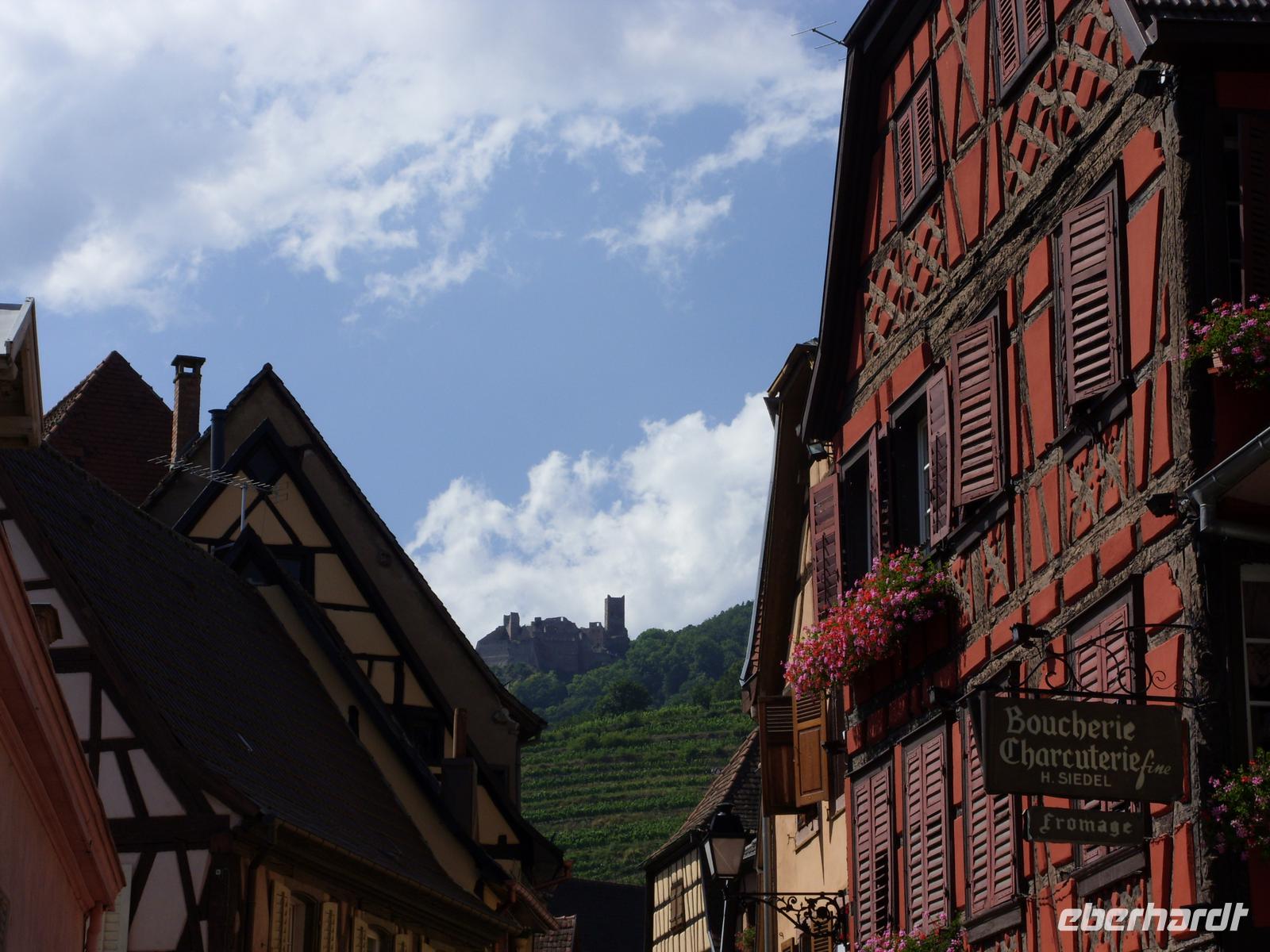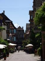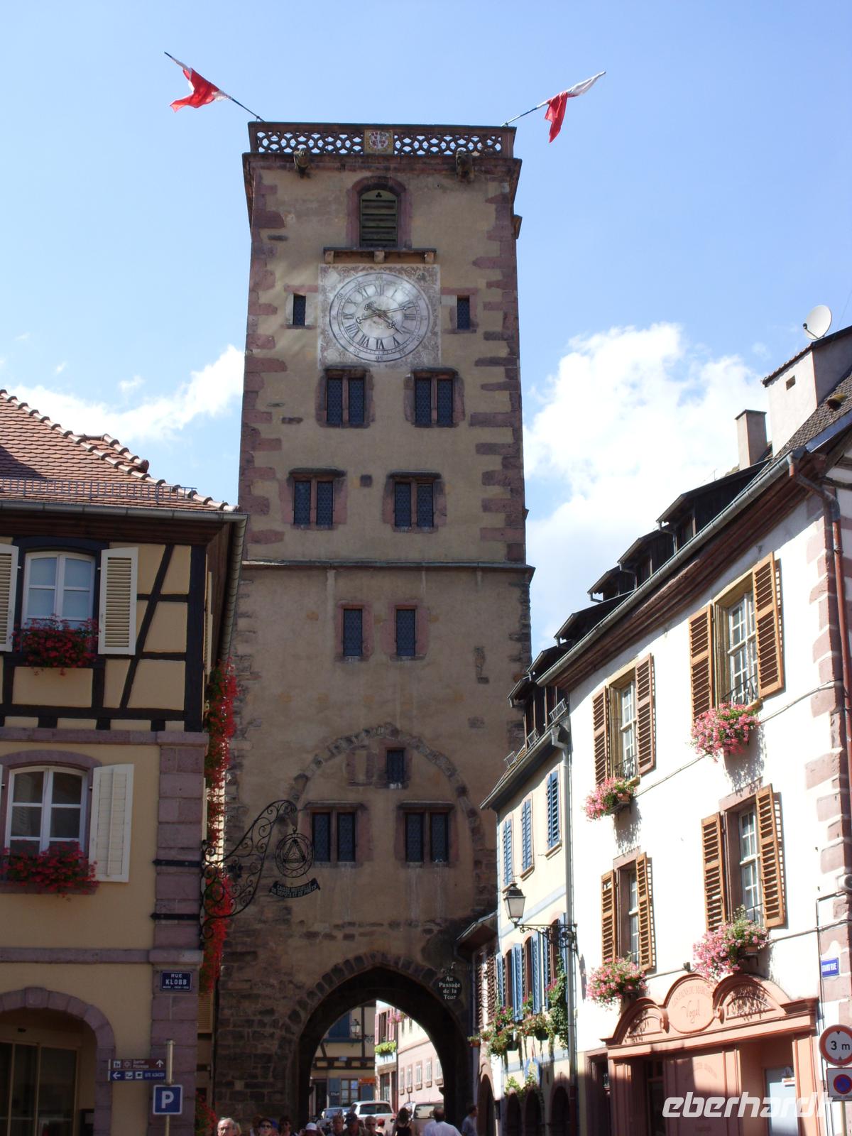 Nach einer ausführlichen Erkundung Colmars fuhren wir entlang der elsässischen Weinstraße zu den beiden Weindörfer Riquewihr und Ribeauvillé. In Riquewihr erwartetete uns zunächst ein kleiner beschaulicher Ort, der umgeben ist von einer doppelten Umfassungsmauer. Innerhalb fanden wir dann zahlreiche typische Winstub, mit Blumen umrankte Fachwerkhäuser wie auch das höchste des Elsasses mit 6 Etagen und eine ganz eigenartige Atmosphäre - elsässische Beschaulichkeit vermischt mit touristischer Hektik - vor. Im folgenden Ort Ribeauvillé führte ich dann die nun schon meist fußlahmen Gäste zum Wahrzeichen der Stadt, dem so genannten Metzgerturm. Dieser trennte einst Mittel- und Oberstadt und wird auch heute noch von der Grand Rue durchzogen. Einmal hoch, einmal runter ging wir die Grand Rue und sahen dabei alle sehenswerten Fachwerkhäuser, die oftmals ein Zeichen der Zunft der Gaukler und Spieler an ihrer Fassade hatten. Einfach traumhaft schön!