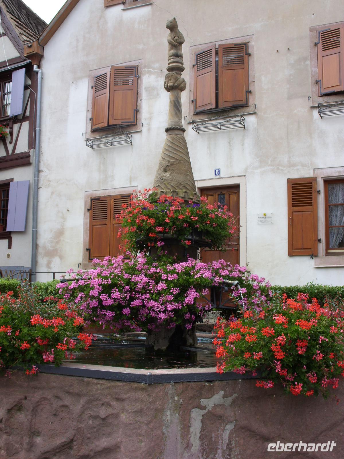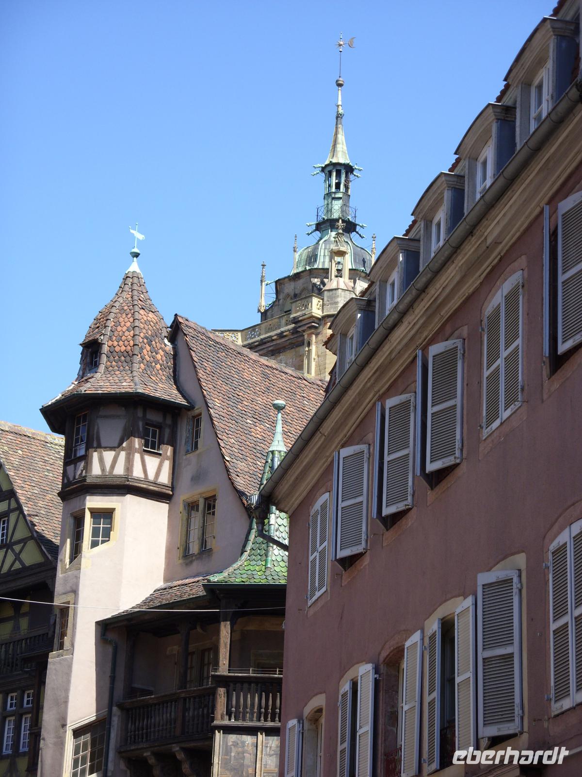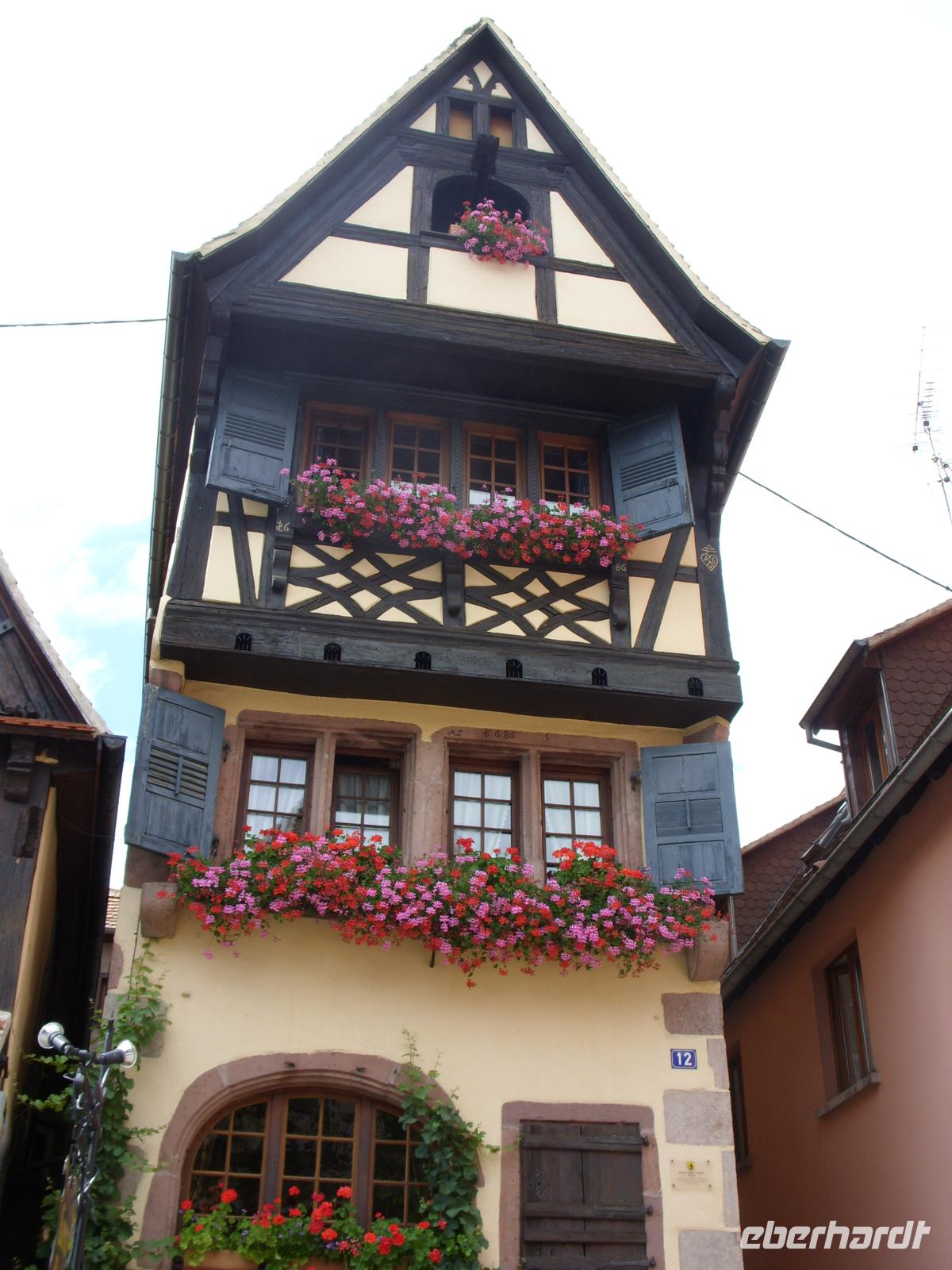 Nach einer ausführlichen Erkundung Colmars fuhren wir entlang der elsässischen Weinstraße zu den beiden Weindörfer Riquewihr und Ribeauvillé. In Riquewihr erwartetete uns zunächst ein kleiner beschaulicher Ort, der umgeben ist von einer doppelten Umfassungsmauer. Innerhalb fanden wir dann zahlreiche typische Winstub, mit Blumen umrankte Fachwerkhäuser wie auch das höchste des Elsasses mit 6 Etagen und eine ganz eigenartige Atmosphäre - elsässische Beschaulichkeit vermischt mit touristischer Hektik - vor. Im folgenden Ort Ribeauvillé führte ich dann die nun schon meist fußlahmen Gäste zum Wahrzeichen der Stadt, dem so genannten Metzgerturm. Dieser trennte einst Mittel- und Oberstadt und wird auch heute noch von der Grand Rue durchzogen. Einmal hoch, einmal runter ging wir die Grand Rue und sahen dabei alle sehenswerten Fachwerkhäuser, die oftmals ein Zeichen der Zunft der Gaukler und Spieler an ihrer Fassade hatten. Einfach traumhaft schön!