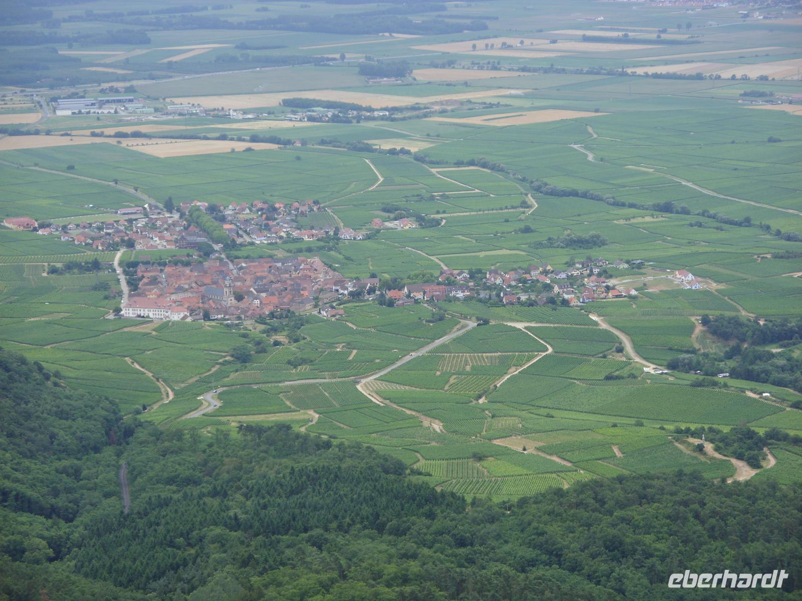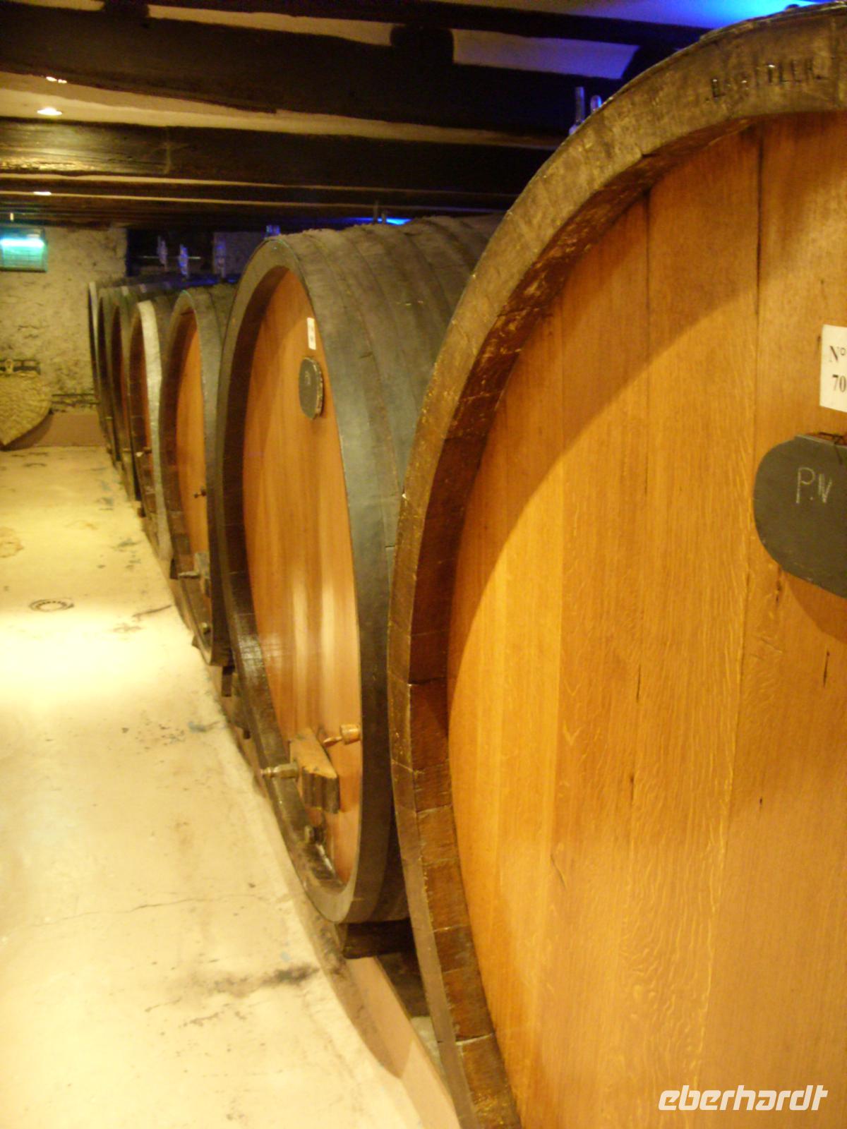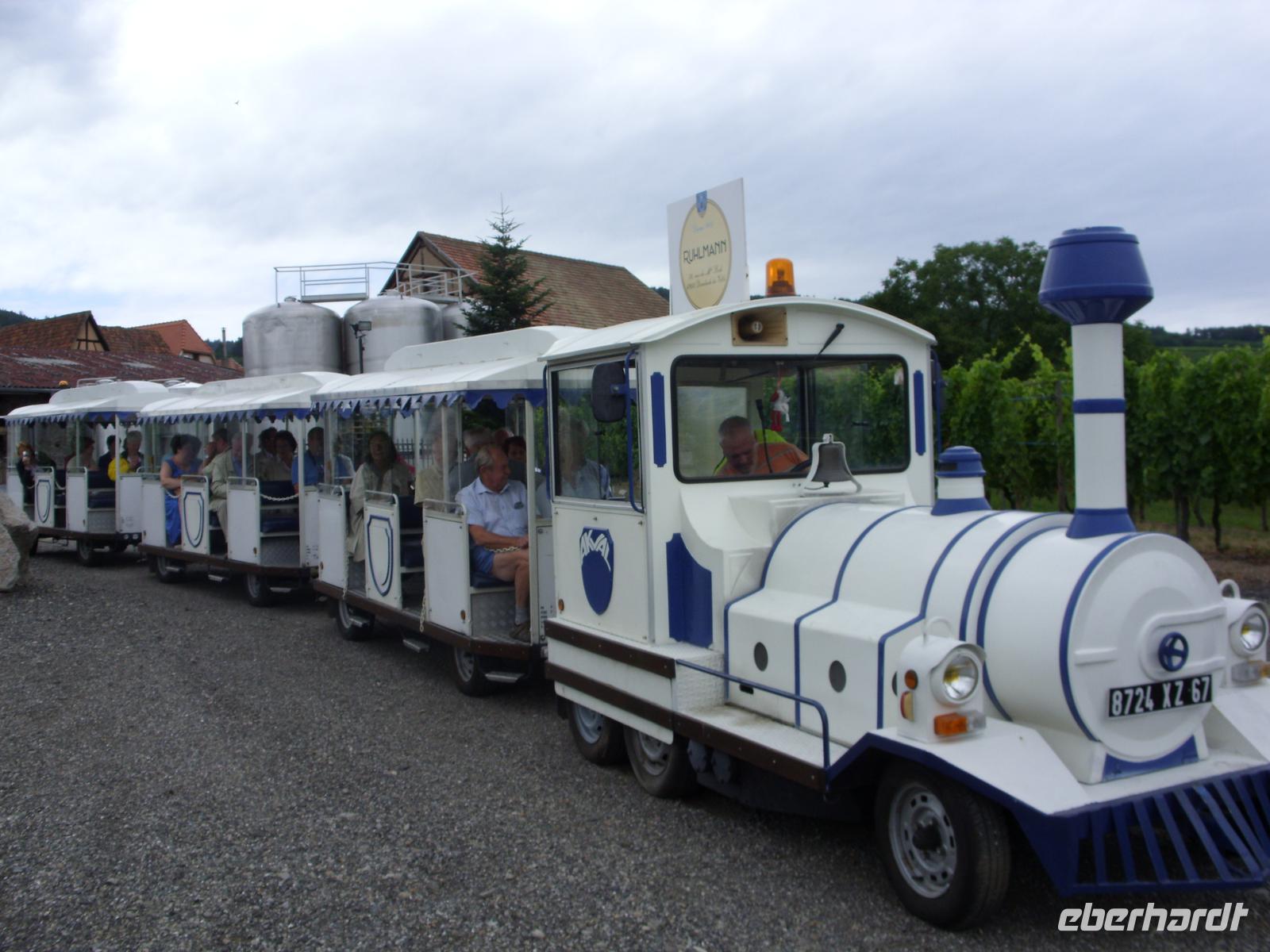 Nach einer kleinen nächtlichen Abkühlung führte uns am dritten Tag die Reiseroute zum Odilienberg. Am Fusse dieses 763 m hohen Berges statteten wir jedoch zunächst dem Örtchen Obernai einen kurzen Besuch ab. Hier war wie jeden Donnerstag großer Markt, der sich fast durch die ganze Innenstadt zog. Auf diese Art war es zwar etwas schwierig die verschiedenen Sehenswürdigkeiten ruhig in Augenschein zu nehmen aber einen typisch französischen Markt mit all seinem frischen Obst, Gemüse, Gewürzen, Backwaren, Käse und Fleisch zu durchqueren macht man ja schließlich auch nicht alle Tage! Nach diesem kurzen Aufenthalt fuhren wir die zahlreichen Kurven zum Odilienberg hinauf. Unterwegs hörten wir von der Legende um die heilige Odilia, deren Vater die erste Klosterlage auf dem Berg in Auftrag gab. Wahrscheinlich überzeugte damals wie heute der herrliche Blick über die Elsässische Ebene bis hin zum Rhein, dem Schwarzwald und den Vogesen sowie zu den zahlreichen elsässischen Dörfern unter uns. Eins dieser Weindörfer war unser nächstes Ziel: Dambach-la-Ville. Dort erwartetet uns bereits Emil vom Weingut Ruhlmann-Schütz. Die nächsten drei Stunden standen nun ganz im Zeichen des elsässischen Weins. Emil führte uns auf humorvolle Art und Weise durch den historischen und modernen Lagerraum sowie an der Abfüllanlage vorbei. Anschließend zeigte uns Emil im Petit Train den Winzerort Dambach-la-Ville sowie die umliegenden Weinberge.