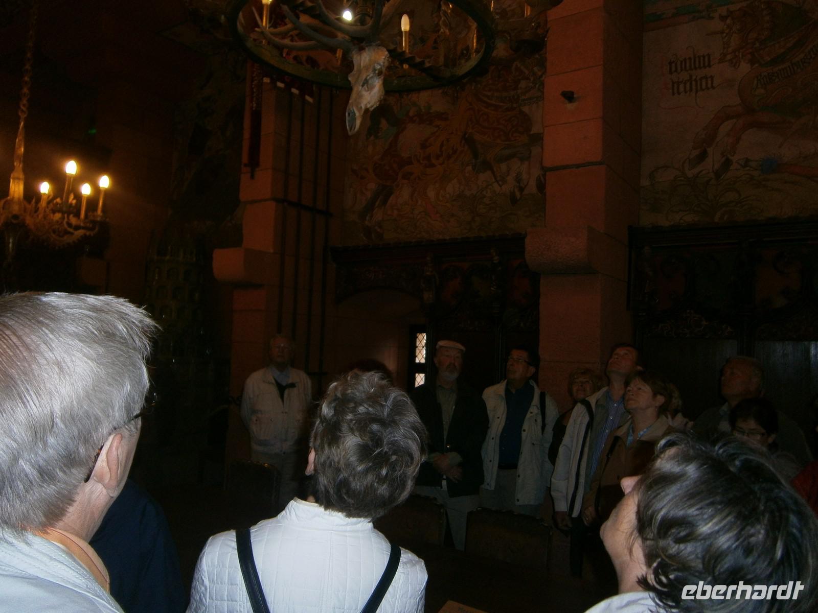 Ein weiterer Höhepunkt erwartete die Mitglieder der Reisegruppe am nächsten Tag. Die Fahrt führte zuerst zur Hochkönigsburg. Die gewaltigen Mauern und Türme ragen 755 Meter hoch auf einem östlichen Ausläufer der Vogesen empor. In einer Führung erfuhren die Gäste, dass die Burg, die1147 errichtet, 1633 durch die Schweden eingeäschert wurde. Die Ruine kam in den Besitz der Stadt Selestat, die sie 1899 Kaiser Wilhelm II schenkte. Der ließ sie, trotz heftiger Prodeste, im Stil einer Ritterburg des späten 15.Jh. wieder aufbauen. Unter Leitung des Architekten Bodo Ebhardt erfolgte die Restaurierung von1900 bis 1908. Der Kaiser wollte daraus keine Ritterburg machen, es sollte ein Museum des Mittelalters werden. Er wollte sie auch zum Symbol des wiederhergestellten Kaiserreichs und der germanischen Vergangenheit des Elsaß machen.