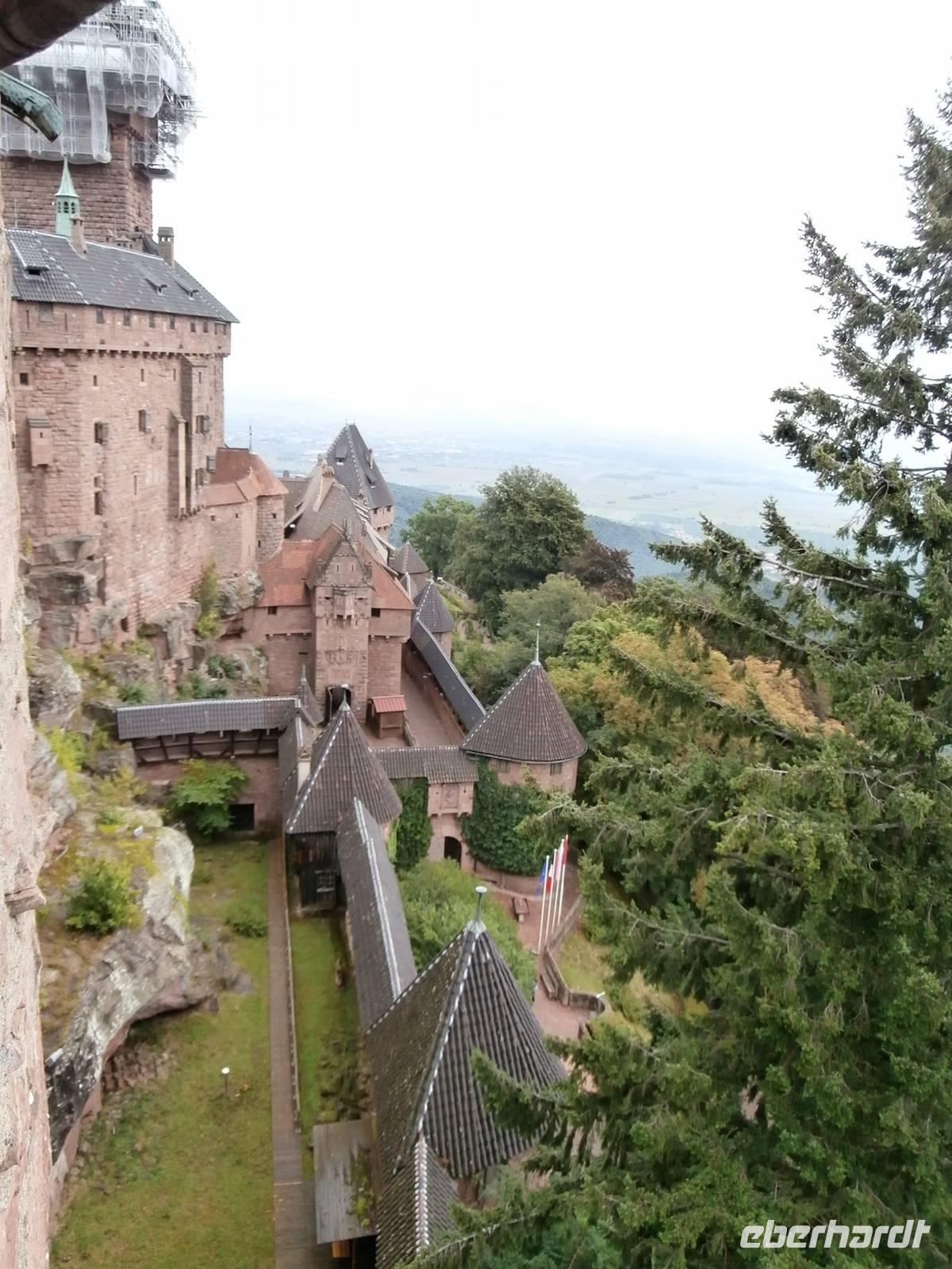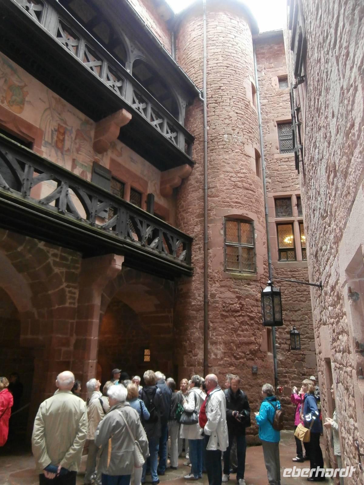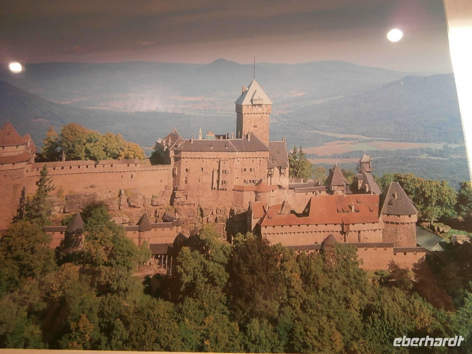 Dicke graue Wolken und Regenschauer begleiten uns zur Abfahrt der heutigen Tour. Unser erstes Ziel am heutigen Tag, ein Samstag, ist die Hochkönigsburg, sie ist so zusagen des Kaisers Liebling. Der Kaiser Wilhelm der II. hat sie einst als Burgruine geschenkt bekommen. Er hat dafür gesorgt, dass sie den historisch getreuen Aufbau bekommt, viel Geld hat er investiert und sie am Ende kaum genutzt. Wir sind beim Rundgang durch diese Burg fasziniert vom Ergebnis, die herrlichen Einrichtungsgegenstände und besonders die schönen Öfen fallen auf. Den erhofften schönen Vogesenblick gönnt uns heute wohl keiner, aber es bleibt trocken. Auf dem ersten Pass, dem Col de Bagenelles, legen wir unsere Mittagspause mit Versorgung aus dem Bus ein. Die nächsten Pässe laden ebenfalls nicht zum Stoppen ein, zu schlecht ist die Sicht in die Täler der Vogesen. Höhepunkt des Nachmittages ist der Besuch der Käserei, die wir auf einem Rundgang mit Erklärung durch den Chef des Hauses und das Vorlesen der einzelnen Arbeitsschritte durch Ingrid, unsere Reiseleiterin, kennenlernen. Der berühmte Münsterkäse ist rund, wohlschmeckend und von sehr intensivem Geruch. Wir verkosten die verschiedenen Käsesorten und dazu gibt es vom Veranstalter Eberhardt Travel ein Gläschen Gewürztraminer ausgegeben, eine leckere Kombination. Wir kaufen reichlich vom Käse ein, er wird im großen Karton zum Bus gefahren und Roy, unser Buschauffeur, bittet uns, den Käse im Hotel zu lagern wegen des intensiven Geruches. In Strasbourg werden wir mit Regen empfangen, nur gut das wir außerhalb unterwegs waren. Am Abend bringt uns Roy wieder zum Essen in die Stadt, ein schöner Tag geht zu ende.