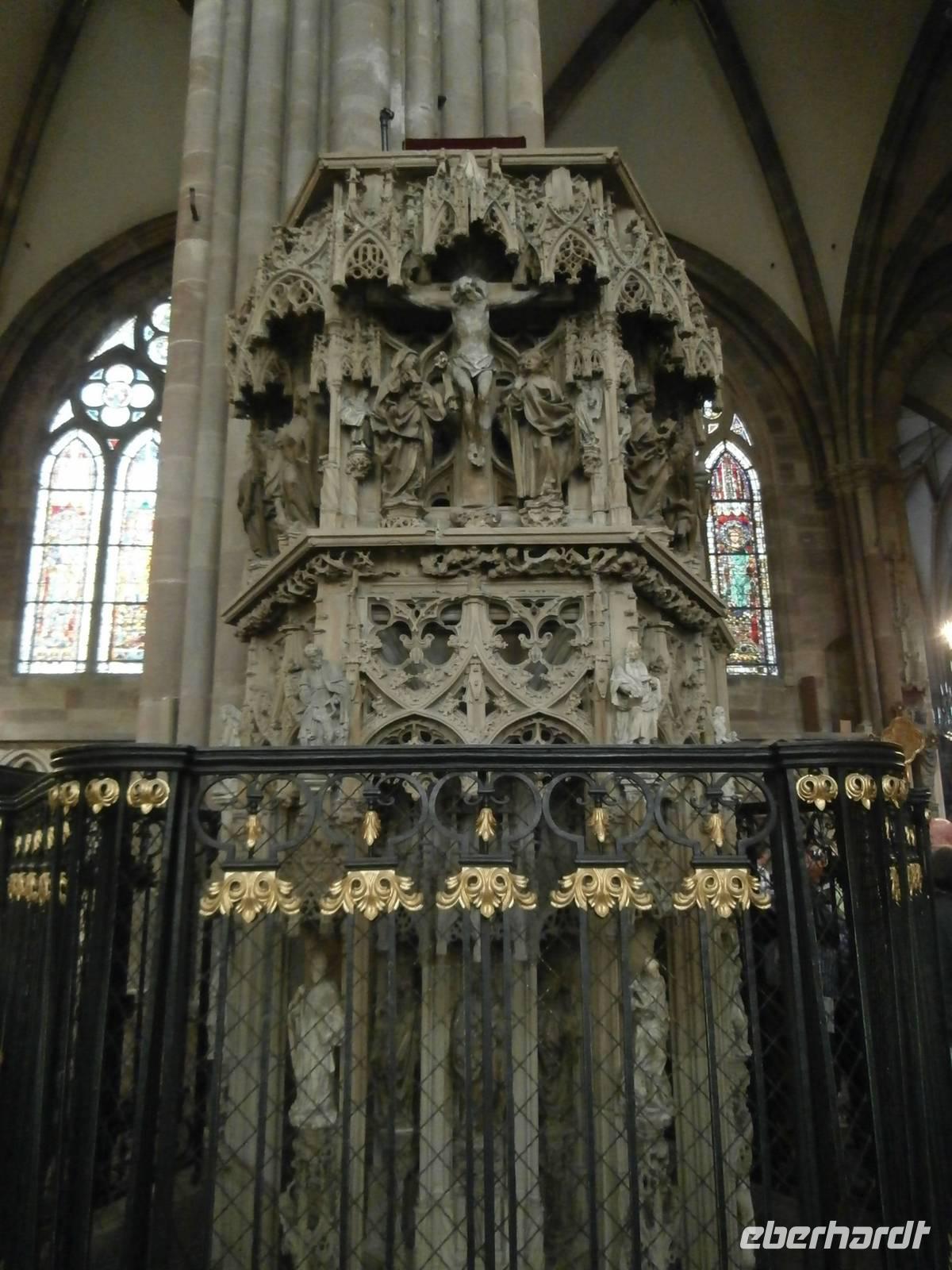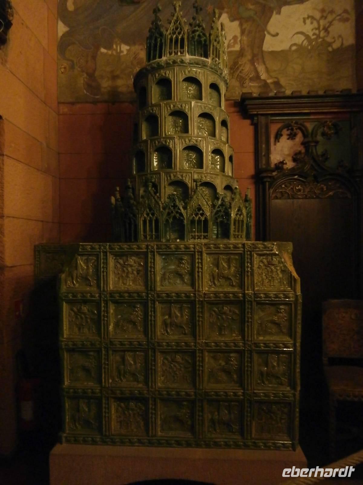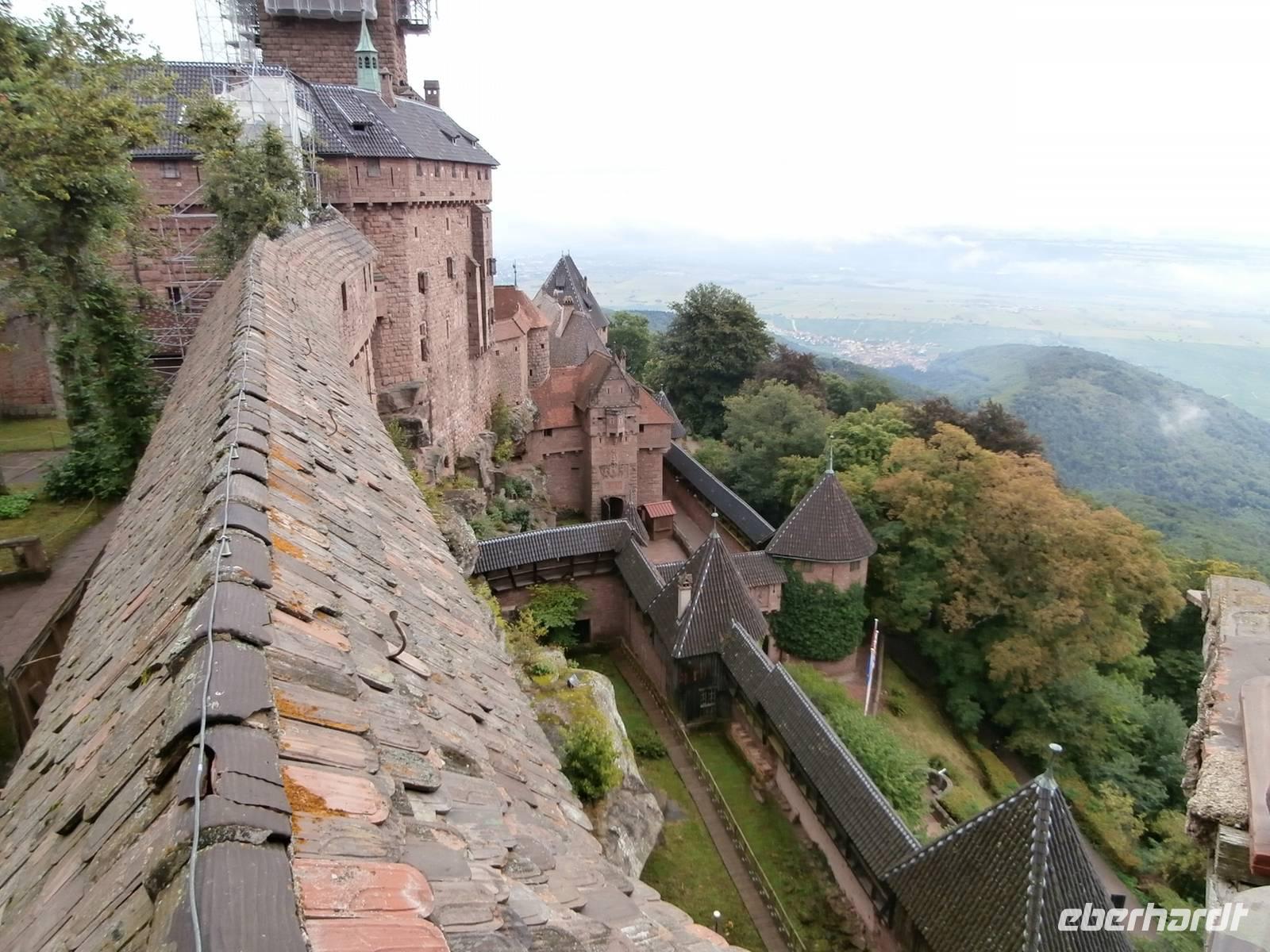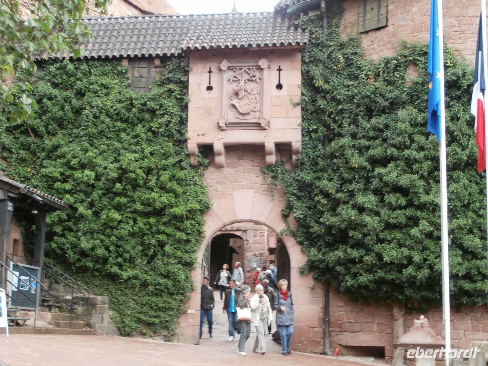Dicke graue Wolken und Regenschauer begleiten uns zur Abfahrt der heutigen Tour. Unser erstes Ziel am heutigen Tag, ein Samstag, ist die Hochkönigsburg, sie ist so zusagen des Kaisers Liebling. Der Kaiser Wilhelm der II. hat sie einst als Burgruine geschenkt bekommen. Er hat dafür gesorgt, dass sie den historisch getreuen Aufbau bekommt, viel Geld hat er investiert und sie am Ende kaum genutzt. Wir sind beim Rundgang durch diese Burg fasziniert vom Ergebnis, die herrlichen Einrichtungsgegenstände und besonders die schönen Öfen fallen auf. Den erhofften schönen Vogesenblick gönnt uns heute wohl keiner, aber es bleibt trocken. Auf dem ersten Pass, dem Col de Bagenelles, legen wir unsere Mittagspause mit Versorgung aus dem Bus ein. Die nächsten Pässe laden ebenfalls nicht zum Stoppen ein, zu schlecht ist die Sicht in die Täler der Vogesen. Höhepunkt des Nachmittages ist der Besuch der Käserei, die wir auf einem Rundgang mit Erklärung durch den Chef des Hauses und das Vorlesen der einzelnen Arbeitsschritte durch Ingrid, unsere Reiseleiterin, kennenlernen. Der berühmte Münsterkäse ist rund, wohlschmeckend und von sehr intensivem Geruch. Wir verkosten die verschiedenen Käsesorten und dazu gibt es vom Veranstalter Eberhardt Travel ein Gläschen Gewürztraminer ausgegeben, eine leckere Kombination. Wir kaufen reichlich vom Käse ein, er wird im großen Karton zum Bus gefahren und Roy, unser Buschauffeur, bittet uns, den Käse im Hotel zu lagern wegen des intensiven Geruches. In Strasbourg werden wir mit Regen empfangen, nur gut das wir außerhalb unterwegs waren. Am Abend bringt uns Roy wieder zum Essen in die Stadt, ein schöner Tag geht zu ende.