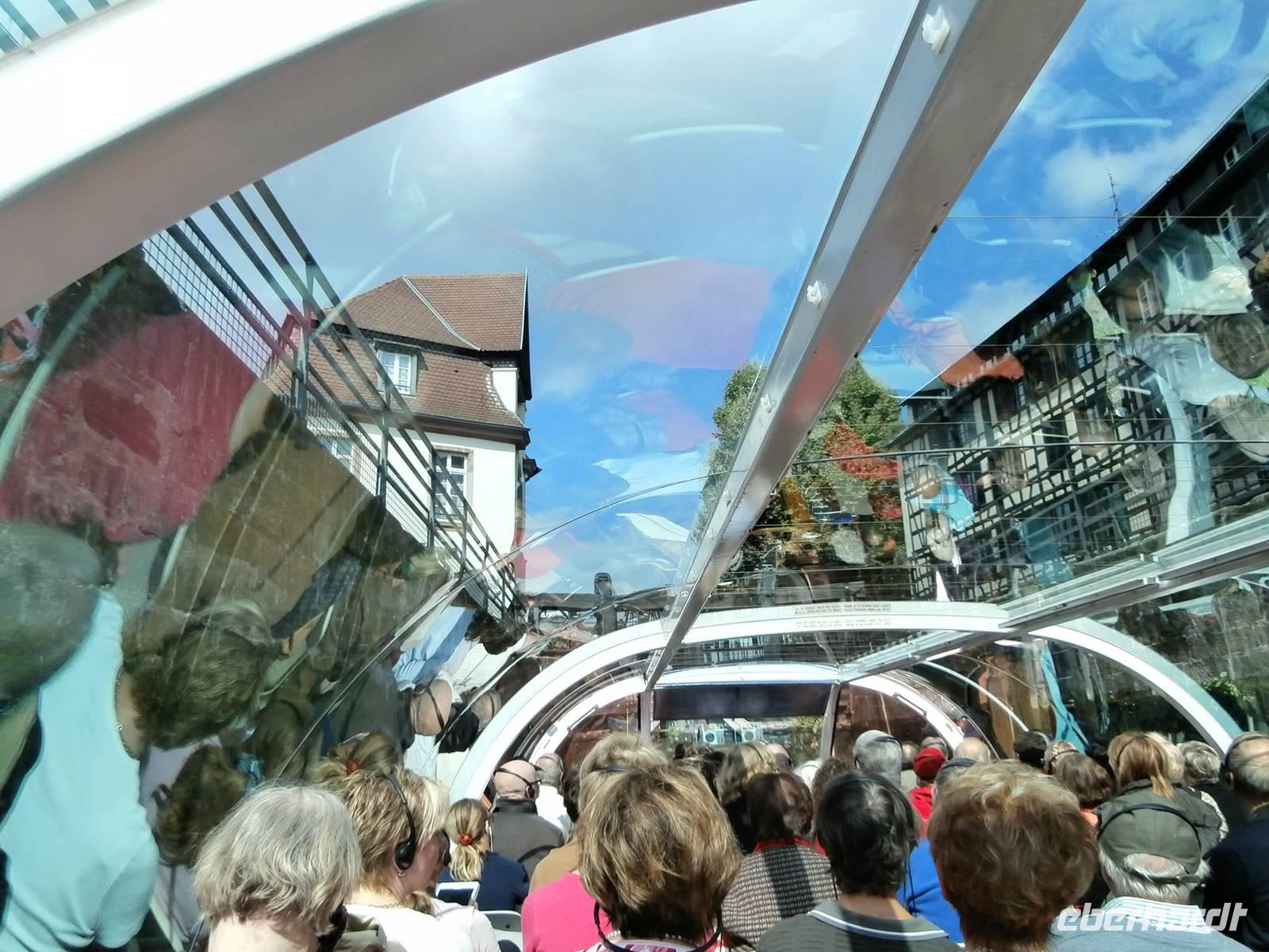 Der Blick aus dem Fenster heute Morgen lässt uns erwartungsvoll in den Tag starten. Sonne mit einem wolkenbehangenen Himmel mit etwas blau und trocken, na so kann es auf Erkundung in Strasbourg gehen. Wir fahren bis zum vereinbarten Treffpunkt, wo wir unseren örtlichen Reiseleiter, Herrn Michel Zin-Cuder aufnehmen. Mit ihm starten wir zur einstündigen Stadtrundfahrt u. a. mit dem Europaviertel, dem Blick auf die Störche im Park der Orangerie und die alten und neueren Gebäude und Brücken der Stadt. Bei Sonnenschein und fast blauen Himmel sind wir im Anschluss zu Fuß unterwegs, laufen über die gedeckten Brücken, durch das Gerberviertel „Petit France" bis hin zum Stadtzentrum mit dem Wahrzeichen Straßburgs, dem Münster. Mit Erklärungen zur Astronomischen Uhr und dem Erlebnis, 11 Uhr ihre Funktion life zu erleben, verabschieden wir uns von den 2 örtlichen Führern. In der Mittagsstunde begeben wir uns ans Ufer der Ill, um auf ihr eine fantastische Bootsfahrt zu erleben mit Erklärung in deutscher Sprache über Kopfhörer. Die anschließende Freizeit wird ausgiebig zum Bummeln und Genießen genutzt. Am Abend treffen wir uns zum Essen im Restaurant in der Stadt und später werden wir von Roy, unserem Buschauffeur, wieder mit dem Bus abgeholt. Er kam leider nicht zum Essen, wo soll er auch den Bus abstellen?
