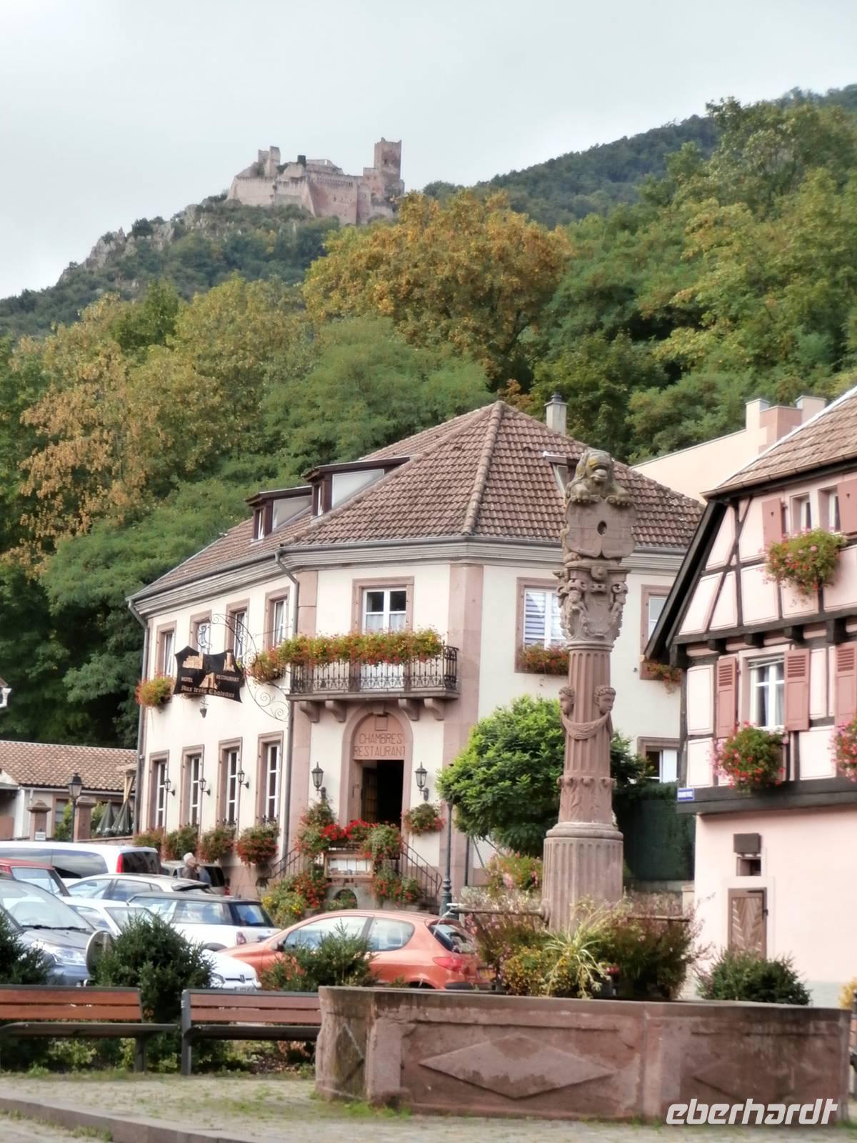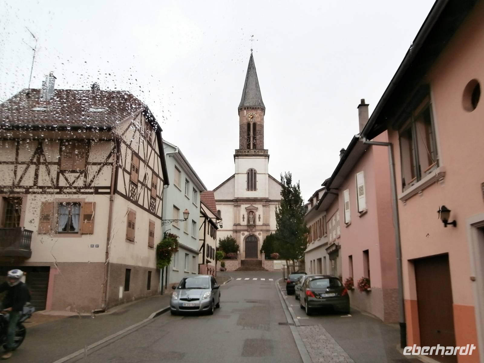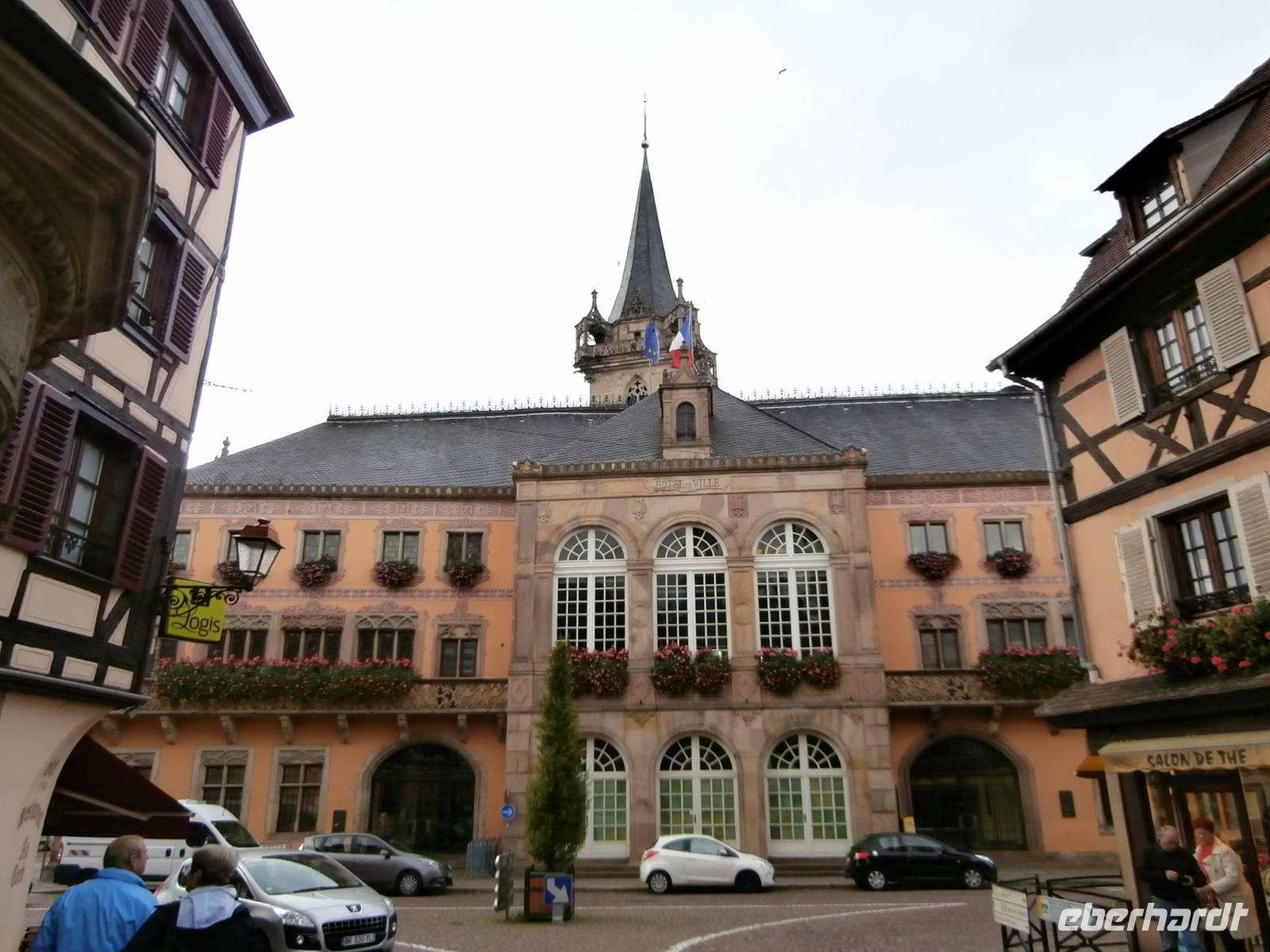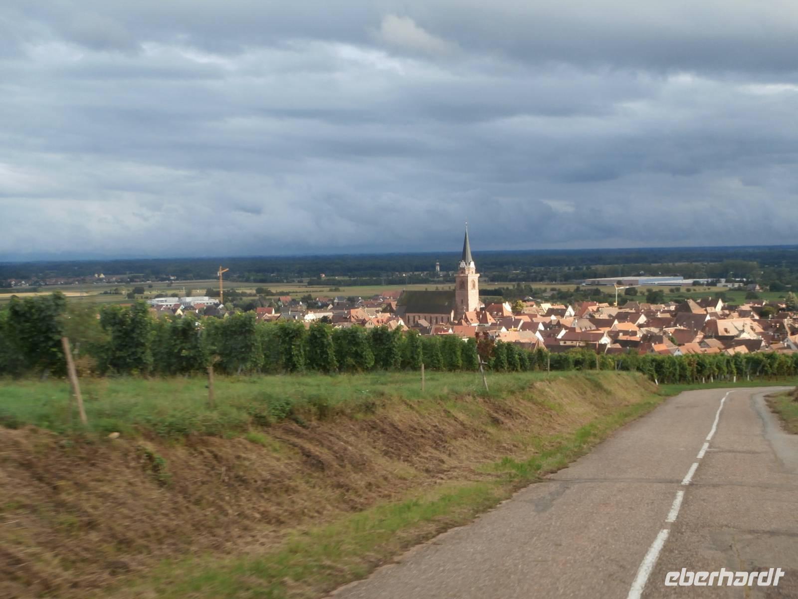 Obernai, an der Elsässischen Weinstraße gelegen, besuchen wir am Vormittag. Durch ein kleines Stadttor gelangen wir in die Stadt vorbei an der alten Synagoge, bis hin zum Marktplatz. Wir sehen das fantastische Rathaus, wir nehmen gleich hier unser obligatorisches Gruppenfoto auf. Am Platze steht auch der Odilienbrunnen, die Heilige Odilie ist die Schutzpatronin des Elsaß und sie wurde in Obernai geboren. Vorbei am Sechs-Eimer-Brunnen, der im Renaissancestil errichtet wurde, gelangen wir zur Pfarrkirche St. Peter und Paul, sie ist nach dem Münster in Straßburg, die größte Kirche im Elsass, gebaut in neugotischen Stil. Weiter geht es auf unserer Tour hinauf zum Kloster auf dem Odilienberg, hier ist ja die Abtei der Heiligen Odilie. Ein sehr gut erhaltenes Anwesen mit 2 wunderschönen Kapellen besichtigen wir gemeinsam. Das Wetter meint es auch heute wieder gut mit uns, es läßt uns einen schönen Blick zu in die Elsässische Ebene und auch das Gebiet der Vogesen erkennt man von hier oben. Der anschließende Aufenthalt beim Winzer Ruhlmann in Dambach La Ville ist mit der Fahrt in der kleinen Bahn durch die Weinberge und den Ort ein besonderes Erlebnis. Krönung des Ganzen ist unsere gemeinsame Weinprobe, sieben Sorten davon eine Rotwein, verkosten wir. Ein dazu gereichter Kougelhopf rundet das Erlebnis ab. Emil macht einen guten Job, mit Witz, Charme und Humor ist er ein perfekter Unterhalter und Führer hier bei unserem Weinseminar.