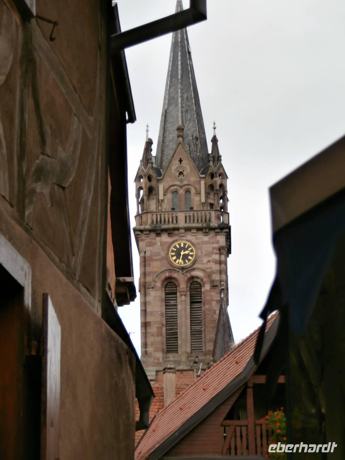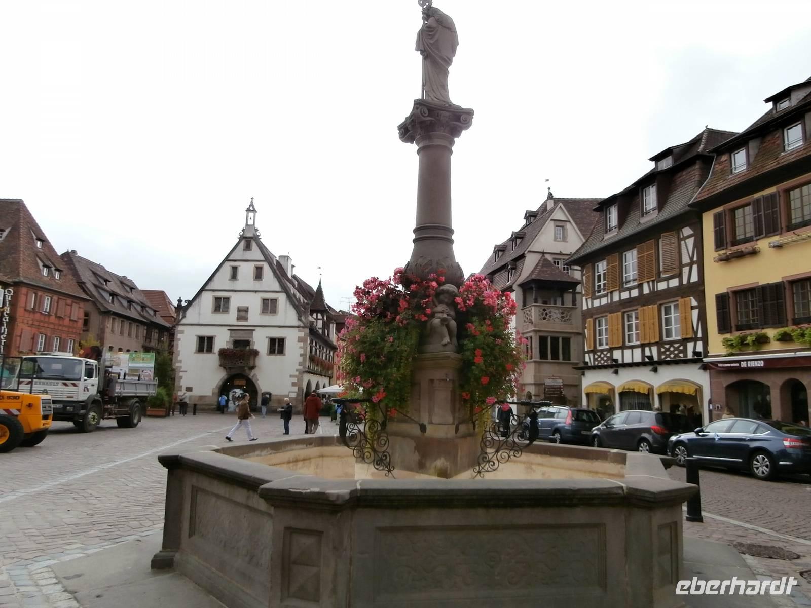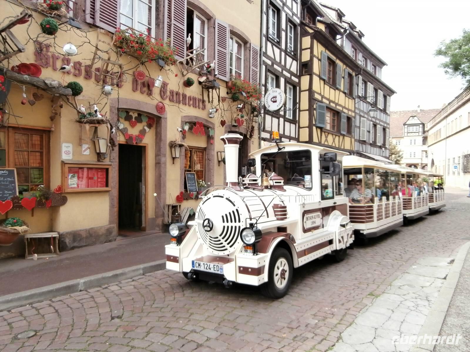 Obernai, an der Elsässischen Weinstraße gelegen, besuchen wir am Vormittag. Durch ein kleines Stadttor gelangen wir in die Stadt vorbei an der alten Synagoge, bis hin zum Marktplatz. Wir sehen das fantastische Rathaus, wir nehmen gleich hier unser obligatorisches Gruppenfoto auf. Am Platze steht auch der Odilienbrunnen, die Heilige Odilie ist die Schutzpatronin des Elsaß und sie wurde in Obernai geboren. Vorbei am Sechs-Eimer-Brunnen, der im Renaissancestil errichtet wurde, gelangen wir zur Pfarrkirche St. Peter und Paul, sie ist nach dem Münster in Straßburg, die größte Kirche im Elsass, gebaut in neugotischen Stil. Weiter geht es auf unserer Tour hinauf zum Kloster auf dem Odilienberg, hier ist ja die Abtei der Heiligen Odilie. Ein sehr gut erhaltenes Anwesen mit 2 wunderschönen Kapellen besichtigen wir gemeinsam. Das Wetter meint es auch heute wieder gut mit uns, es läßt uns einen schönen Blick zu in die Elsässische Ebene und auch das Gebiet der Vogesen erkennt man von hier oben. Der anschließende Aufenthalt beim Winzer Ruhlmann in Dambach La Ville ist mit der Fahrt in der kleinen Bahn durch die Weinberge und den Ort ein besonderes Erlebnis. Krönung des Ganzen ist unsere gemeinsame Weinprobe, sieben Sorten davon eine Rotwein, verkosten wir. Ein dazu gereichter Kougelhopf rundet das Erlebnis ab. Emil macht einen guten Job, mit Witz, Charme und Humor ist er ein perfekter Unterhalter und Führer hier bei unserem Weinseminar.