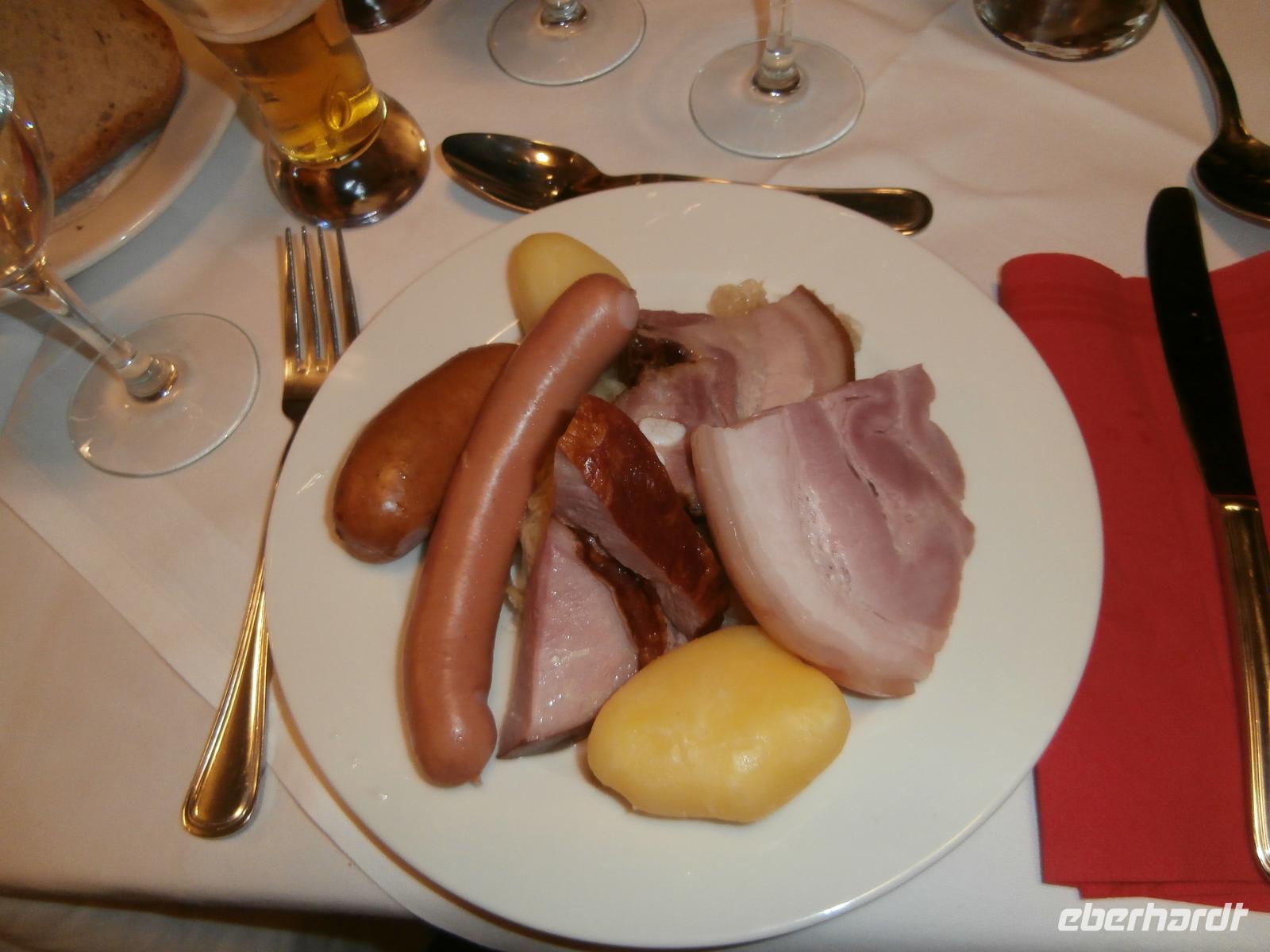 Am Abend gibt es das berühmte Sauerkraut Menü des Elsass im Restaurant serviert, alle Gäste sind reichlich gesättigt und gemeinsam geht es danach mit Roy wieder in unserem Bus zurück zur letzten Übernachtung im Hotel in Strasbourg.