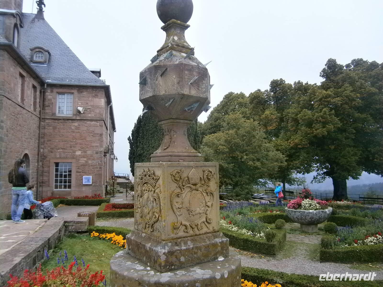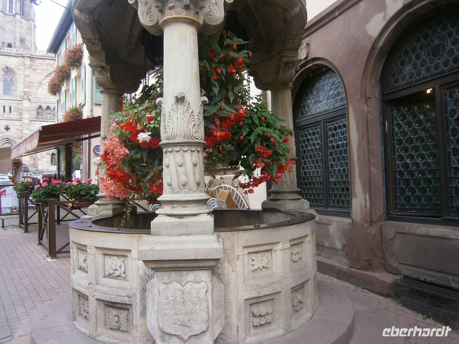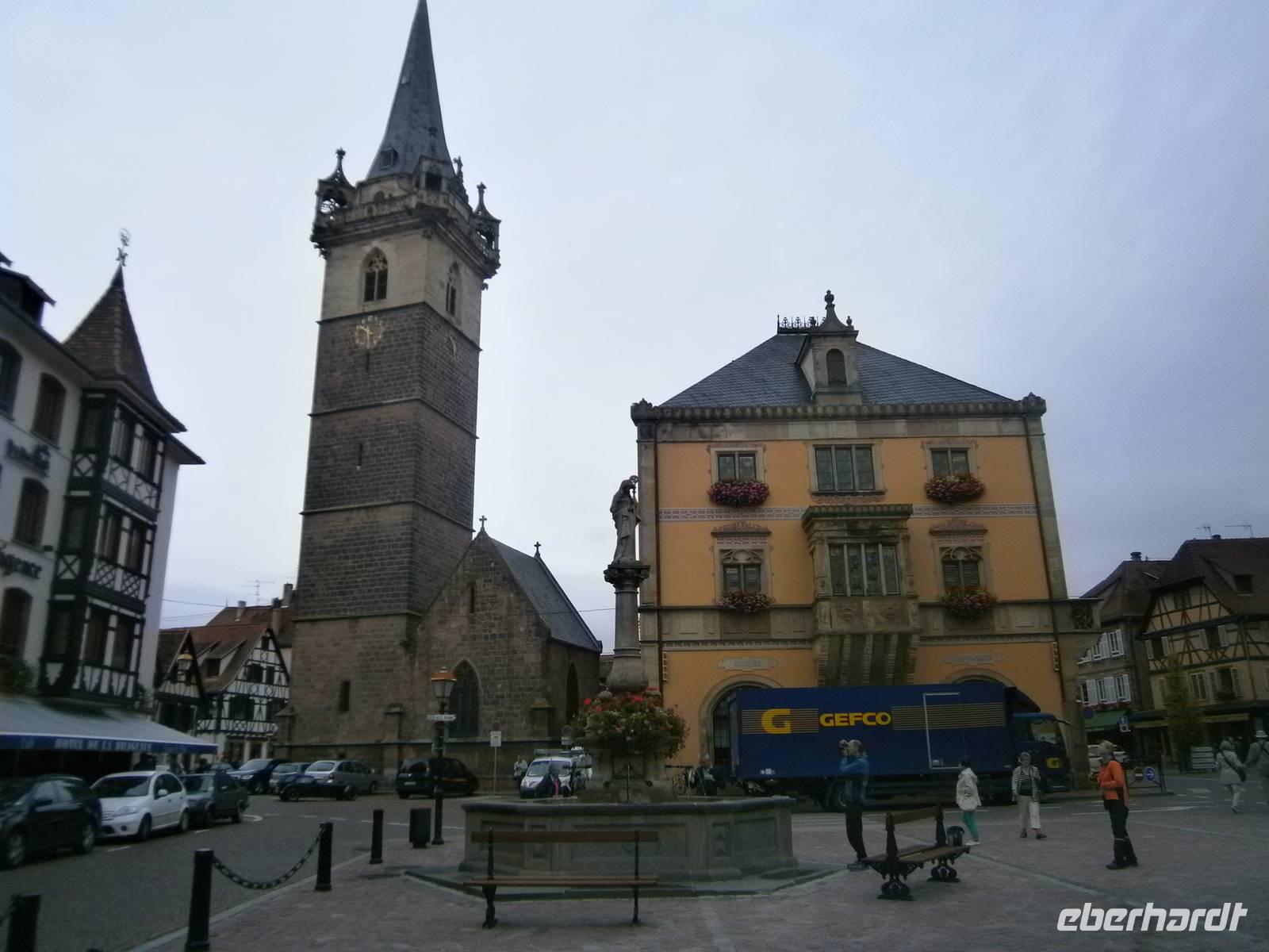 Am nächsten Tag fuhren wir zuerst nach Obernai, einen wunderschöner Ort an der Elsässer Weinstraße. Bei einem kleinen Spaziergang sahen wir neben den kleinen Geschäften und Restaurants sowie Cafe's die touristischen Sehenswürdigkeiten. So u.a. die Stadtmauer, die Synagoge, den Marktplatz mit Kornhalle, Rathaus, Odilienbrunnen und Kapellturm. Auf dem Weg zur katholischen Pfarrkirche St. Peter und Paul, der nach dem Straßburger Münster größten Kirche im Elsaß, kommt man am Sechs-Eimer-Brunnen, erbaut im Stil der Renaissance, vorbei. Nach individuellen Bummel durch den Ort fuhren wir mit dem Bus hinauf zum Kloster der hl. Odile, der Schutzpatronin des Elsaß. Der 761 Meter hohe Berg ist der „Heilige Berg" des Elsaß und bildet den Glanzpunkt der Vogesen. Das Kloster ist heute Wallfahrtsstätte, Gebetsstätte und ein Ort der Gastlichkeit. Von hier oben bietet sich normalerweise ein wunderbarer Ausblick auf die Rheinebene und dem gegenüberliegenden Schwarzwald. Wegen tief hängender Wolken konnten wir dies jedoch nicht genießen. Trotzdem blieb uns die Betrachtung der Weltsonnenuhr, der Tränenkapelle, der Kirche, der Kapelle mit dem Grab der hl. Odile, der Kreuzgang u.a.;