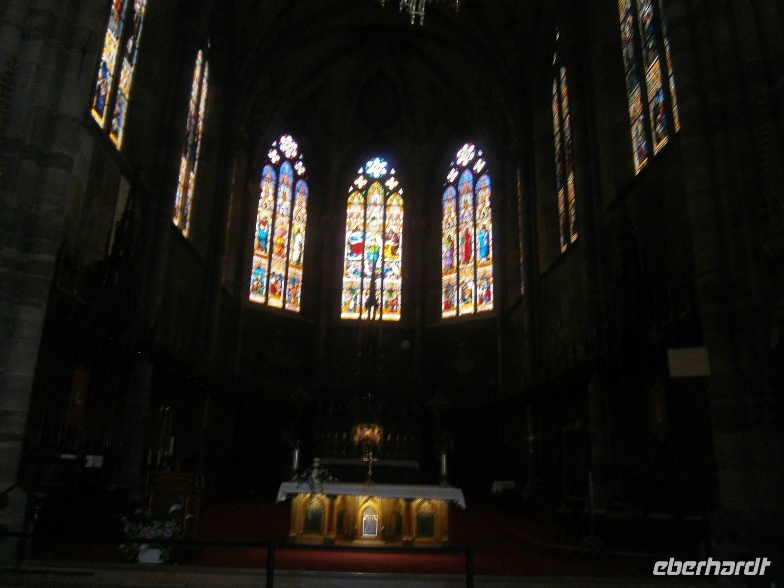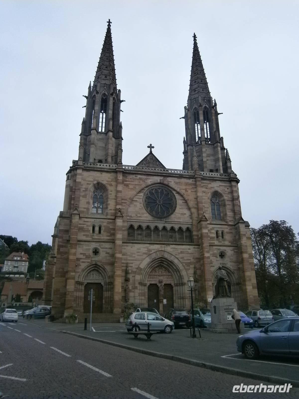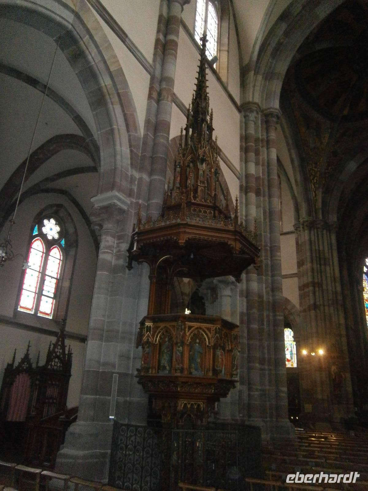 Am nächsten Tag fuhren wir zuerst nach Obernai, einen wunderschöner Ort an der Elsässer Weinstraße. Bei einem kleinen Spaziergang sahen wir neben den kleinen Geschäften und Restaurants sowie Cafe's die touristischen Sehenswürdigkeiten. So u.a. die Stadtmauer, die Synagoge, den Marktplatz mit Kornhalle, Rathaus, Odilienbrunnen und Kapellturm. Auf dem Weg zur katholischen Pfarrkirche St. Peter und Paul, der nach dem Straßburger Münster größten Kirche im Elsaß, kommt man am Sechs-Eimer-Brunnen, erbaut im Stil der Renaissance, vorbei. Nach individuellen Bummel durch den Ort fuhren wir mit dem Bus hinauf zum Kloster der hl. Odile, der Schutzpatronin des Elsaß. Der 761 Meter hohe Berg ist der „Heilige Berg" des Elsaß und bildet den Glanzpunkt der Vogesen. Das Kloster ist heute Wallfahrtsstätte, Gebetsstätte und ein Ort der Gastlichkeit. Von hier oben bietet sich normalerweise ein wunderbarer Ausblick auf die Rheinebene und dem gegenüberliegenden Schwarzwald. Wegen tief hängender Wolken konnten wir dies jedoch nicht genießen. Trotzdem blieb uns die Betrachtung der Weltsonnenuhr, der Tränenkapelle, der Kirche, der Kapelle mit dem Grab der hl. Odile, der Kreuzgang u.a.;