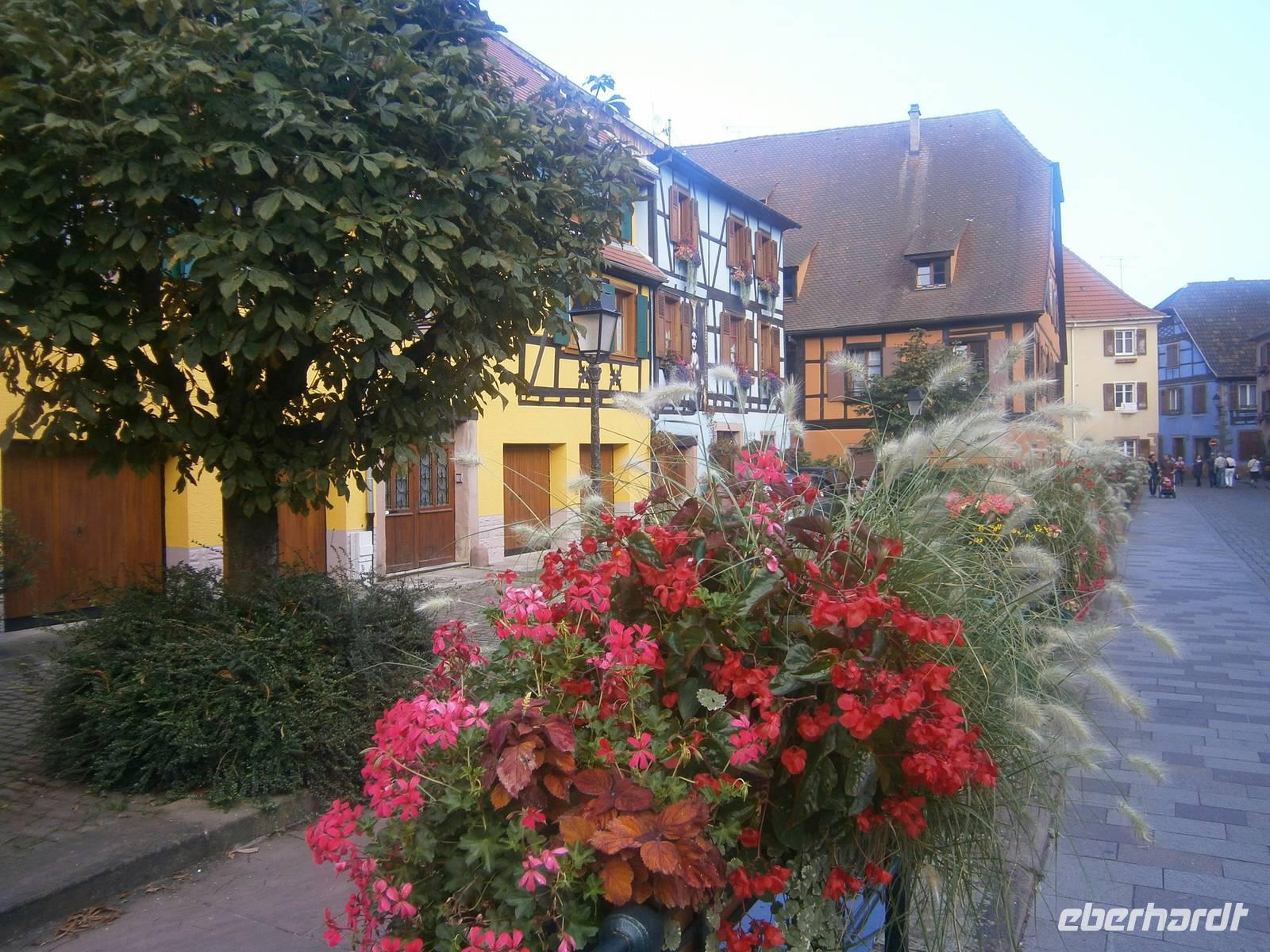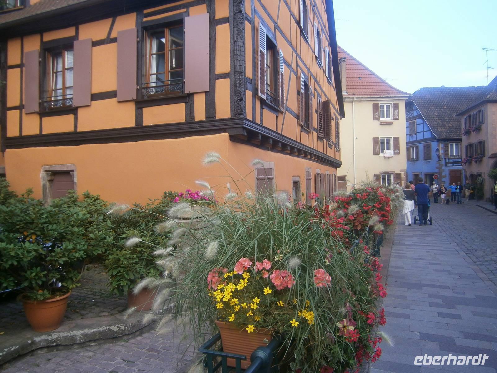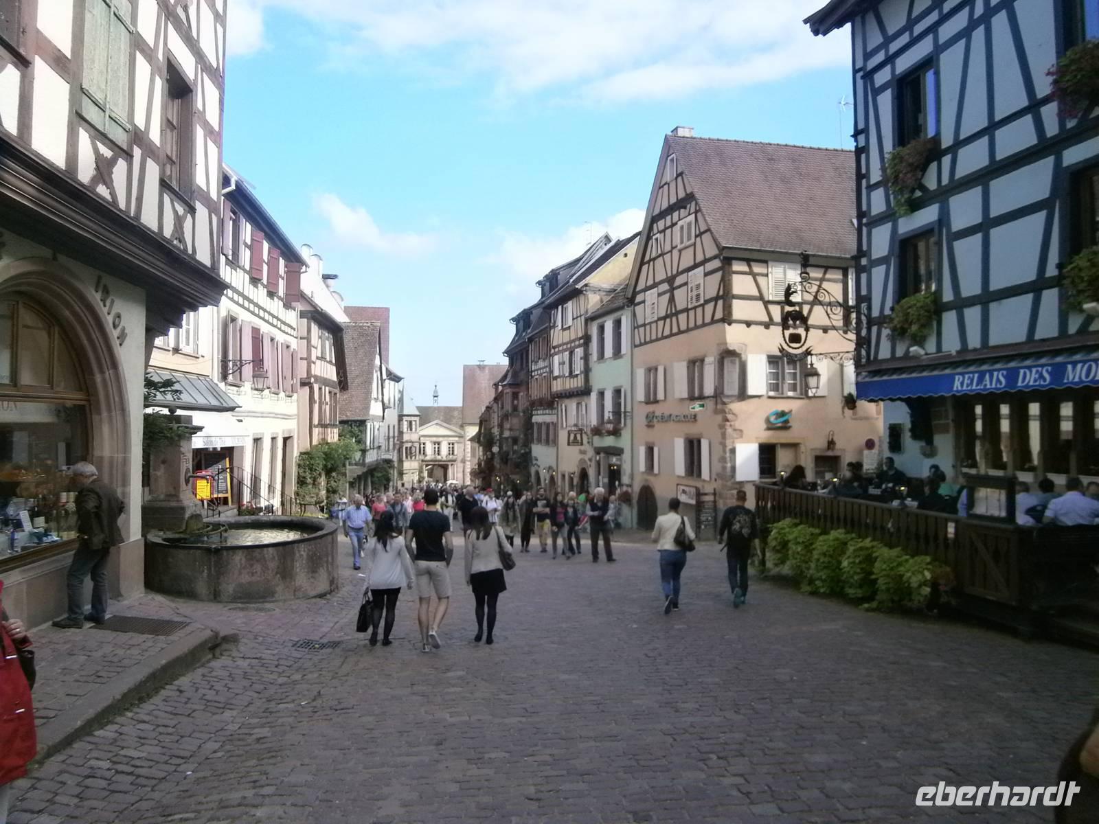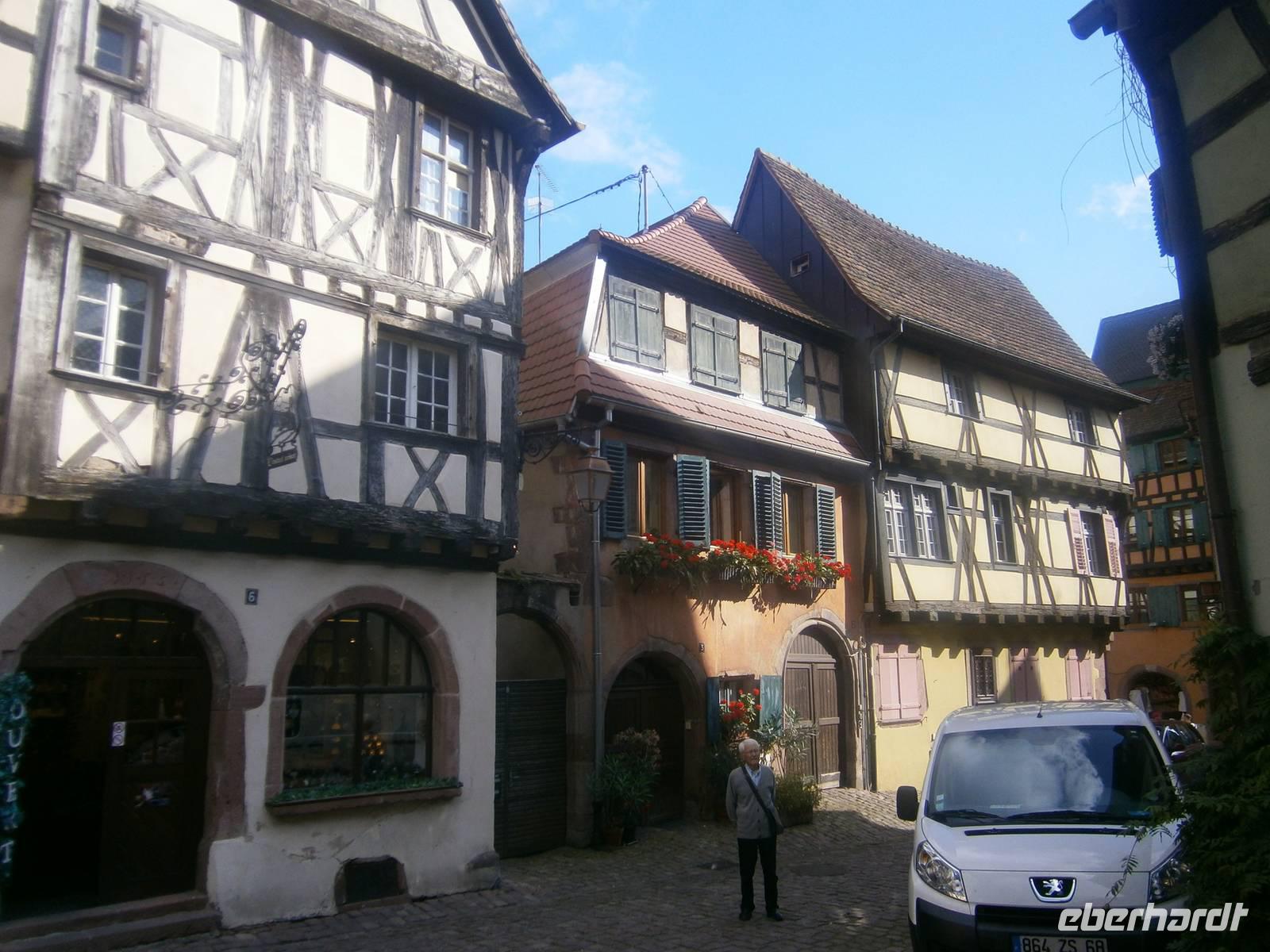 An diesem Sonntag hatten wir Glück, da ein Herbstmarkt aufgebaut war, der die Ergebnisse der Ernte zeigte und zum Verkauf anbot. Auch die Markthalle hatte geöffnet, so dass sich unsere Gäste dort umschauen und einkaufen konnten. Nach der entsprechenden Freizeit in dieser schönen Stadt fuhren wir zu zwei kleinen wunderschönen Weinorten an der Elsässer Weinstraße. Die Stadt Riquewihr, eines der „Schönsten Dörfer Frankreichs" und die „Sackpfeiferstadt" Ribeauville empfingen uns bei schönem Wetter und mit jeder Menge Besucher. Die alten Fachwerkhäuser beider Orte, mit ihren Blumenschmuck, ihren Auslegern und unzähligen Möglichkeiten der Einkehr muß man einfach gesehen haben. Es wurde gegessen, getrunken, kommuniziert und Einkäufe getätigt. In jeden dieser zwei Städtchen hatten die Mitglieder unserer Reisegruppe einen längeren Aufenthalt.
