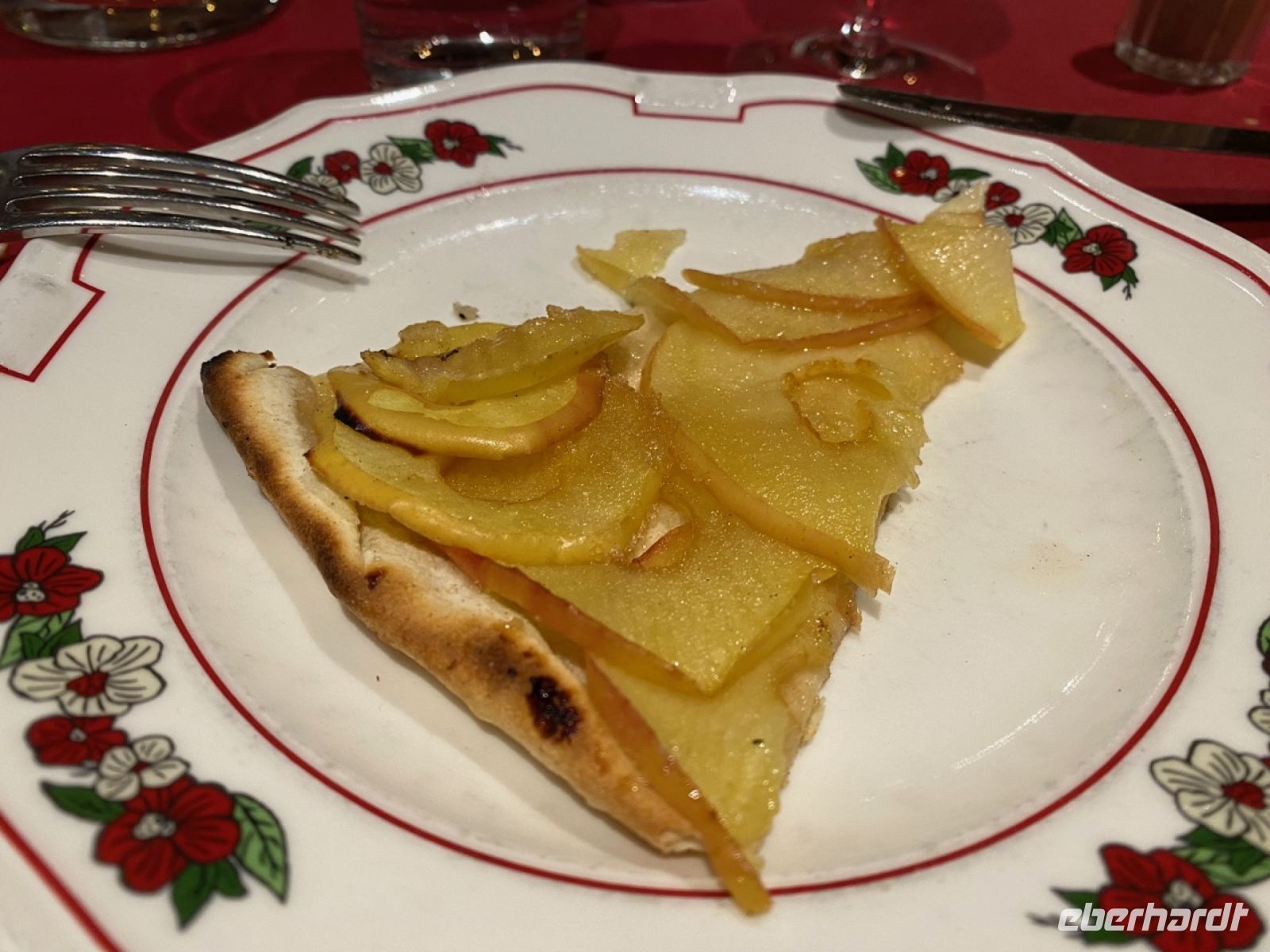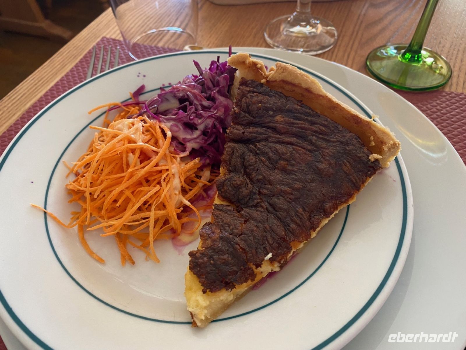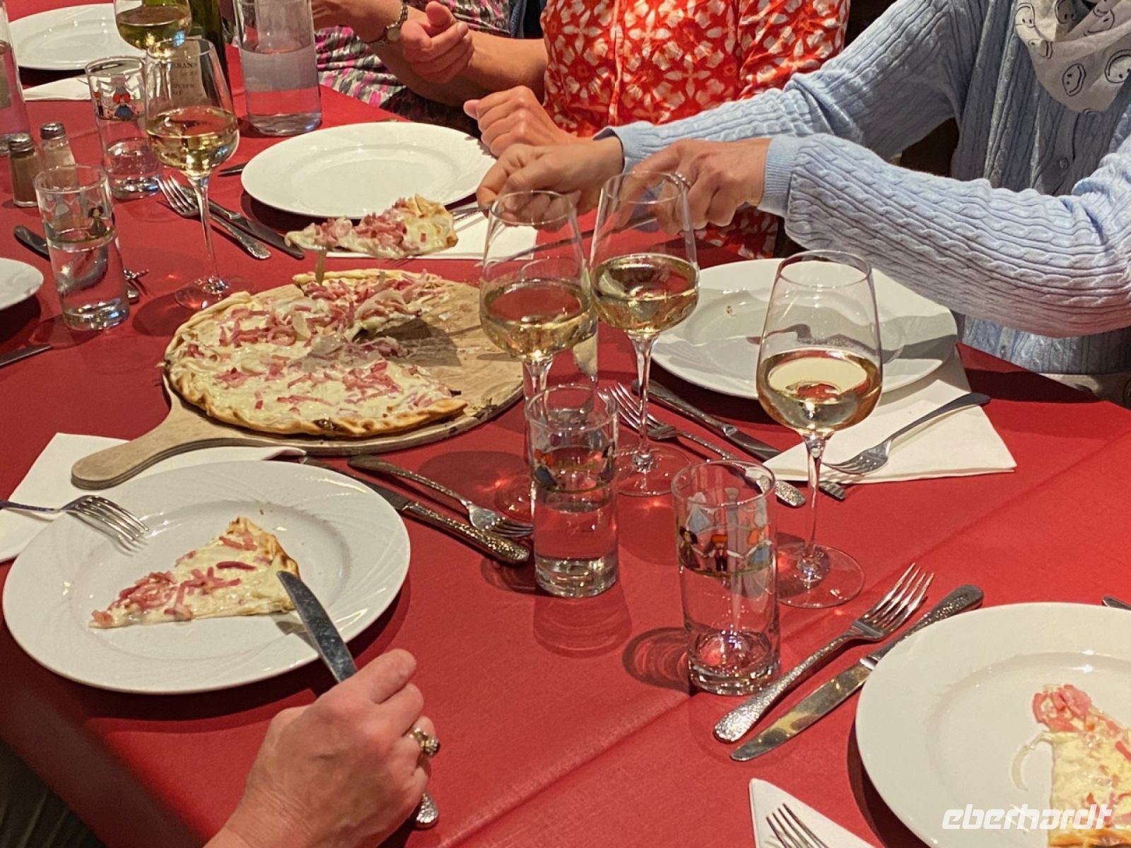 Was fehlt jetzt noch um das Elsass vollständig zu erleben? Natürlich der vorhin erwähnte Flammkuchen. In allen seinen Variationen wird uns heute ein mehrgängiges Menü serviert von der originalen Version über verschiedenste Käse-Variationen, unter anderem mit Munster Käse, den wir noch am nächsten Tag genauer kennen lernen werden, wird uns in Kintzheim in der Auberge Saint-Martin ein opulentes Mahl aufgetischt.