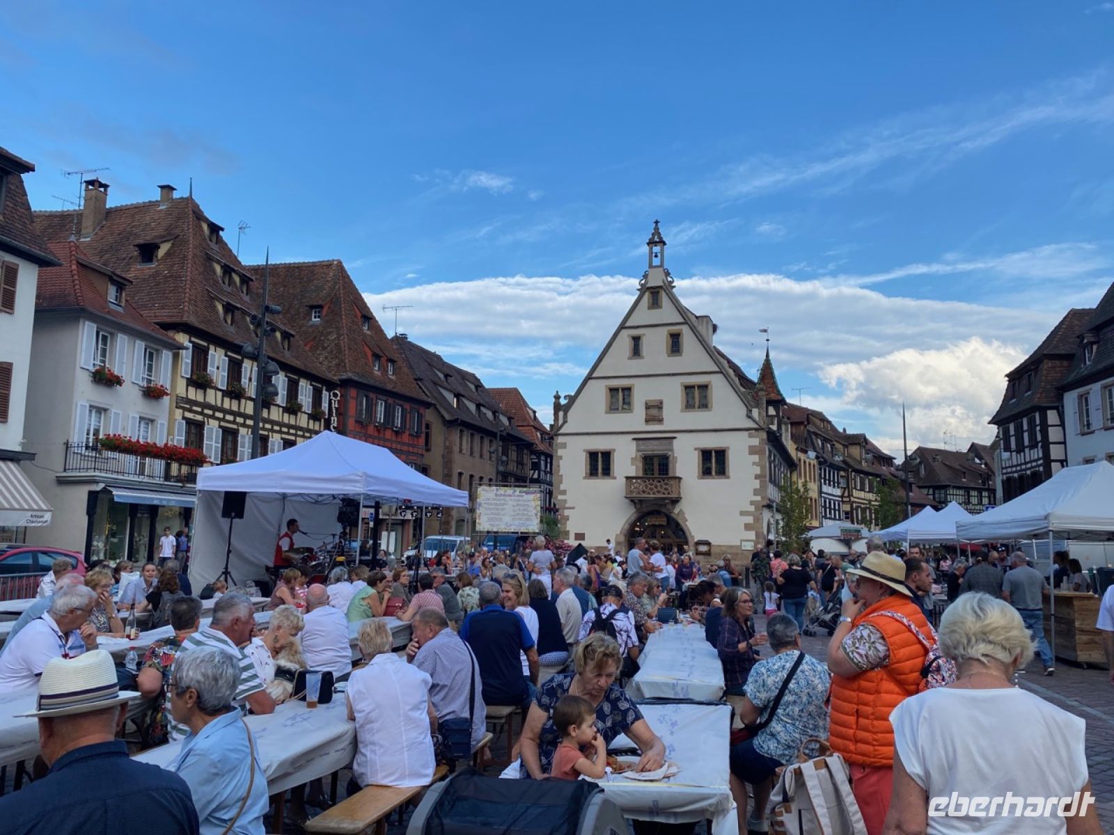 Eine weitere Kleinstadt an der elsässischen Weinstraße gilt es heute aber auch noch zu entdecken: Obernai oder Oberehnheim auf Deutsch oder Ewernah im lokalen Dialekt. Die ehemalige Reichsstadt im Heiligen Römischen Reich Deutscher Nation erwartet uns nicht nur mit ihrer Geschichte, sondern mit purer Lebensfreude. Auf dem Marktplatz im Schatten des Kapellturms findet ein fröhliches Volksfest mit Musik, Tanz und selbstverständlich mit Elsässer Wein statt.