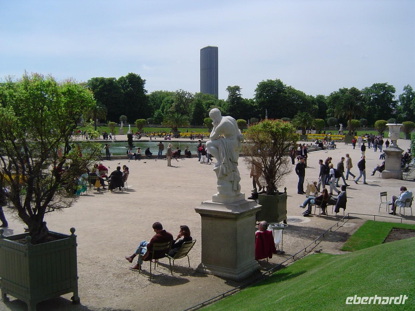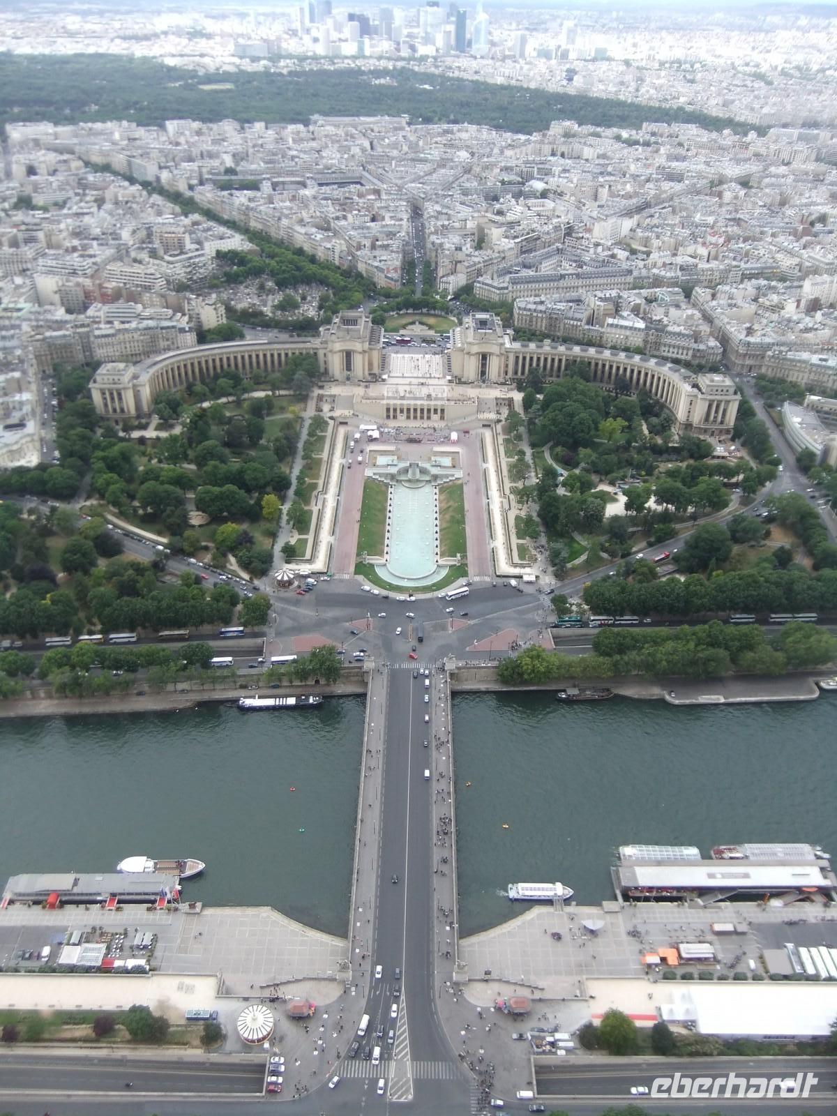 Daran änderte auch der wütende Protest von Garnier, Gounod, Zola, Maupassant, Zola und anderen nichts. Das „scheußliche Riesenskelett“ (Maupassant) empfängt heute jährlich über 6 Millionen Besucher (der Louvre 8,5 Millionen). Wir erkennen die bedeutenden Bauten im Häusermeer wieder, die wir schon auf der Stadtrundfahrt im Vorbeifahren gesehen haben. Im Westen ragen die Hochhäuser des Quartiers La Defense auf. Da müsste man einmal hin !