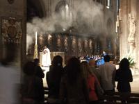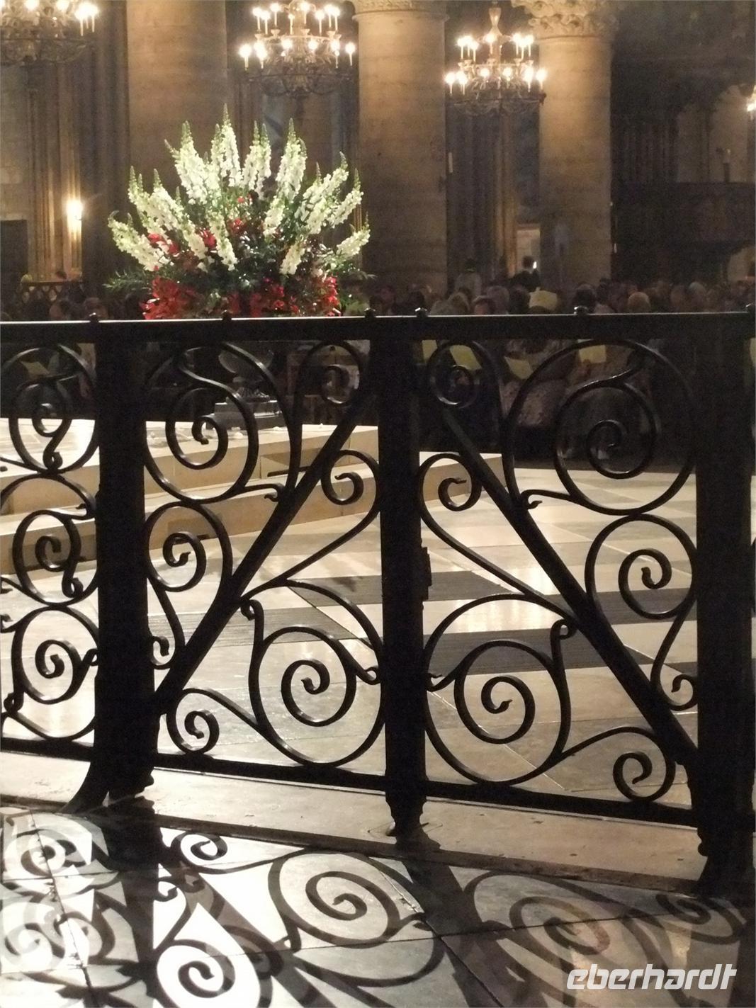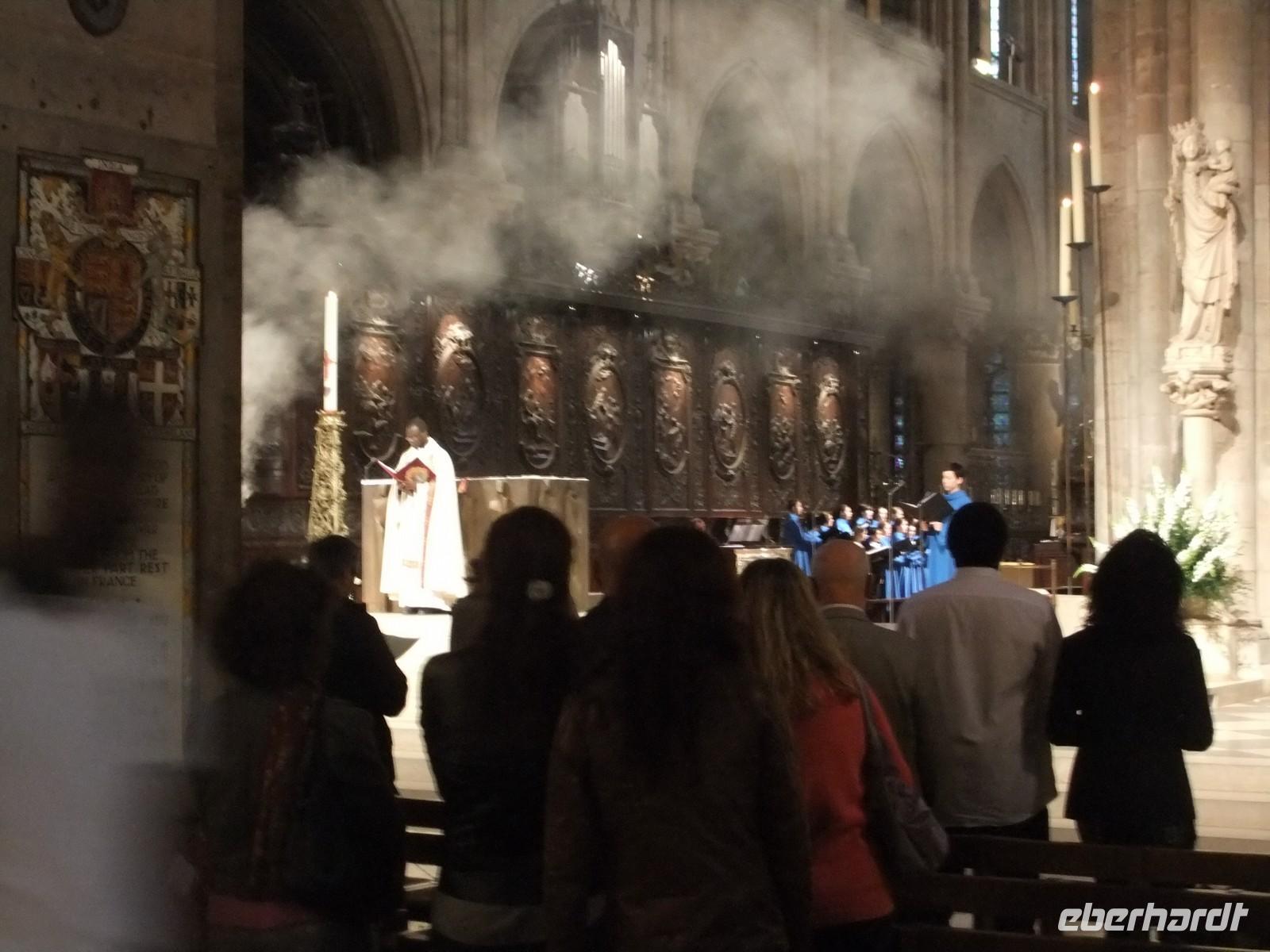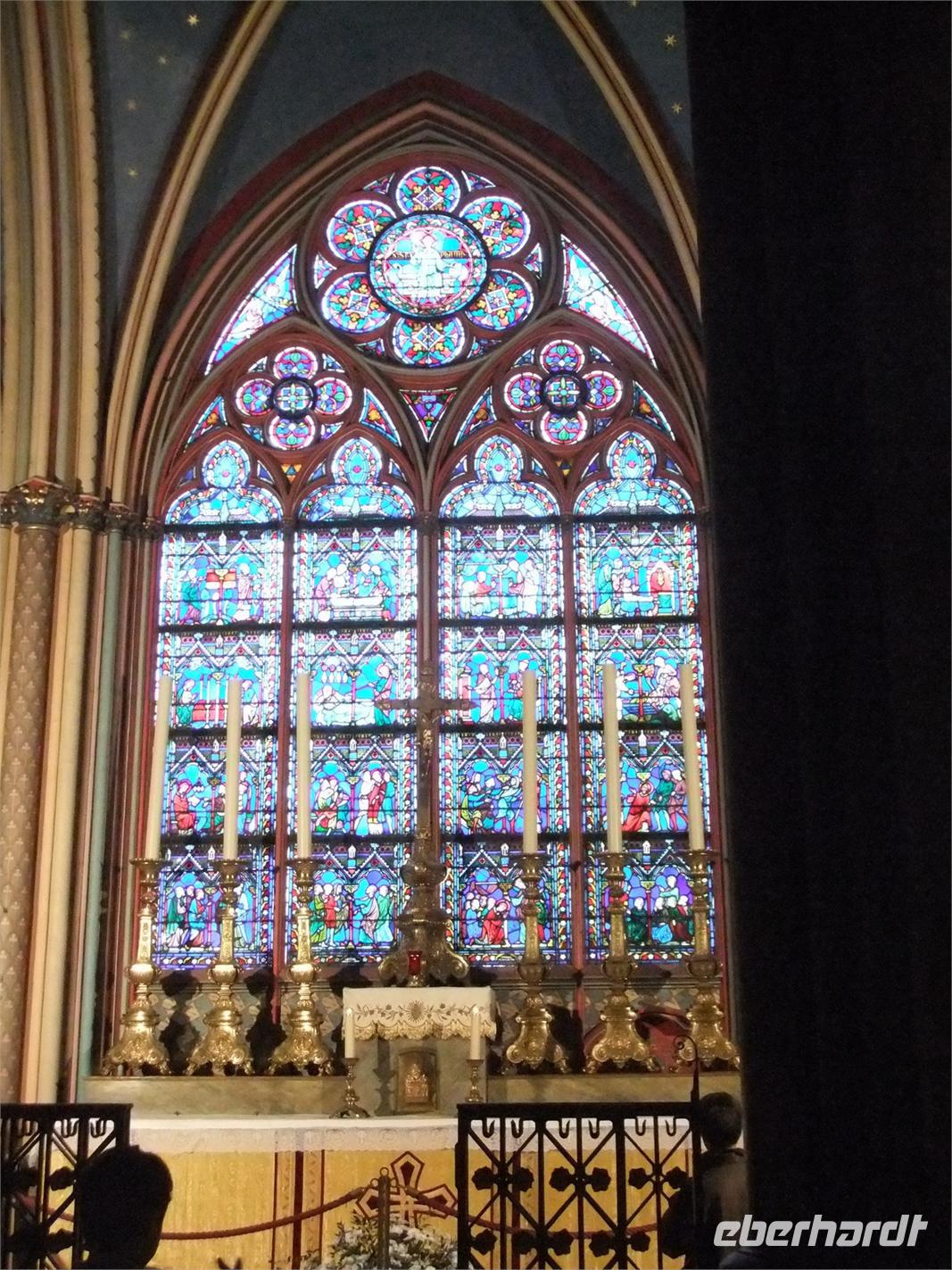 Das anspruchsvolle Programm hat doch kleine Lücken gelassen und so haben wir die vierte Sicht auf die Notre Dame, ihre Fassade, die Südseite und den Chor mit dem grazilen Strebewerk, indem wir vor dem Abendessen noch einen Inselspaziergang unternehmen. Wir können das Innere auf uns wirken lassen, der Chorgesang und Weihrauch der Messe schaffen eine besondere Atmosphäre. Licht fällt durch die riesigen farbenprächtigen Rosetten des Querschiffes ein. In kurzer Zeit hat die der Gotik, 15 km weiter nördlich in St.-Denis entstanden, zu solcher Meisterschaft der Baukunst geführt.