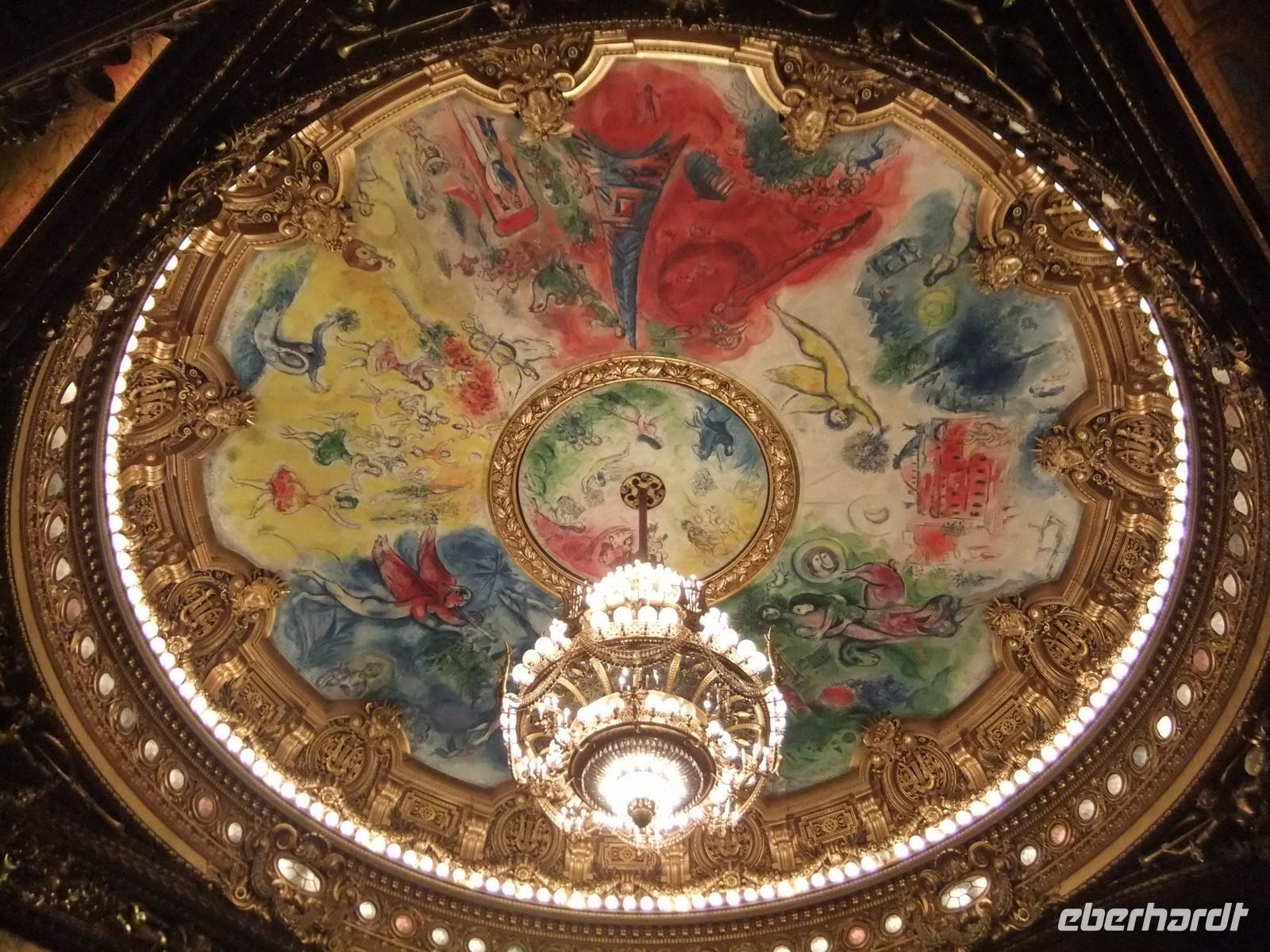 Das zweite Kaiserreich hat mit der Oper des jungen Architekten Garnier eine Institution geschaffen, deren Prunk nicht mehr zu überbieten ist. Schon der Zuschauerraum mit der von Chagall gemalten Decke und den Rängen mit den viele Logen ist beeindruckend. Edle Materialen, Marmor, Bronze, Gold, Kristallglas, Gemälde schmücken das gewaltige Treppenhaus und machen das Foyer zu einem glanzvollen Riesensaal, vergleichbar mit der Spiegelgalerie von Versailles.
