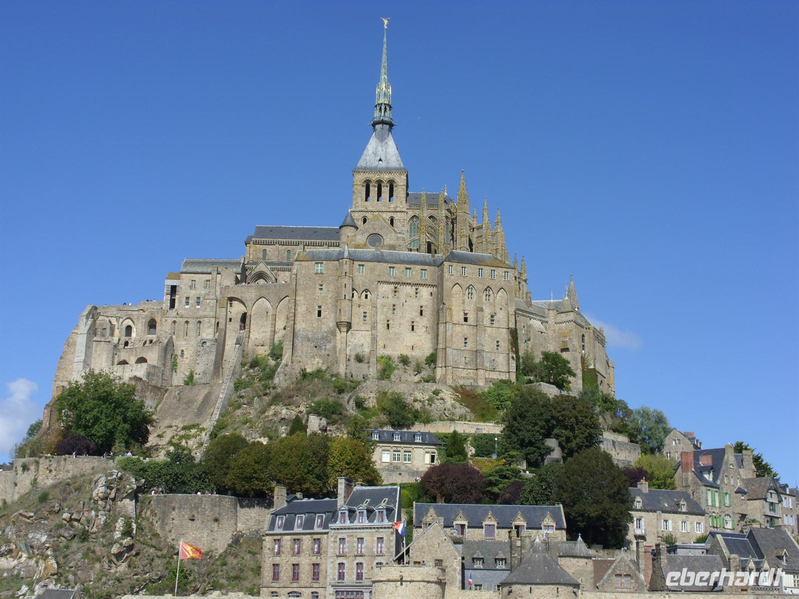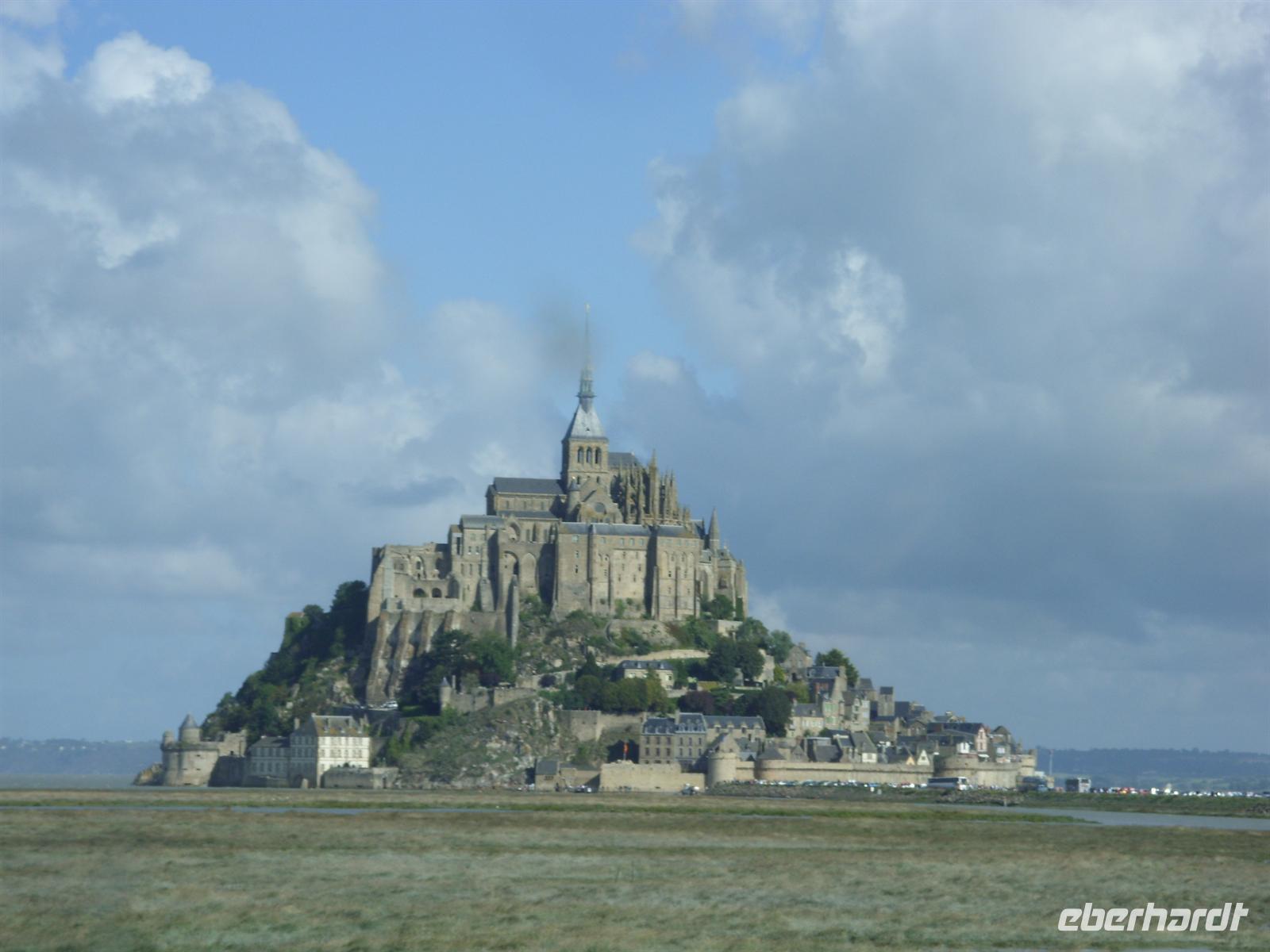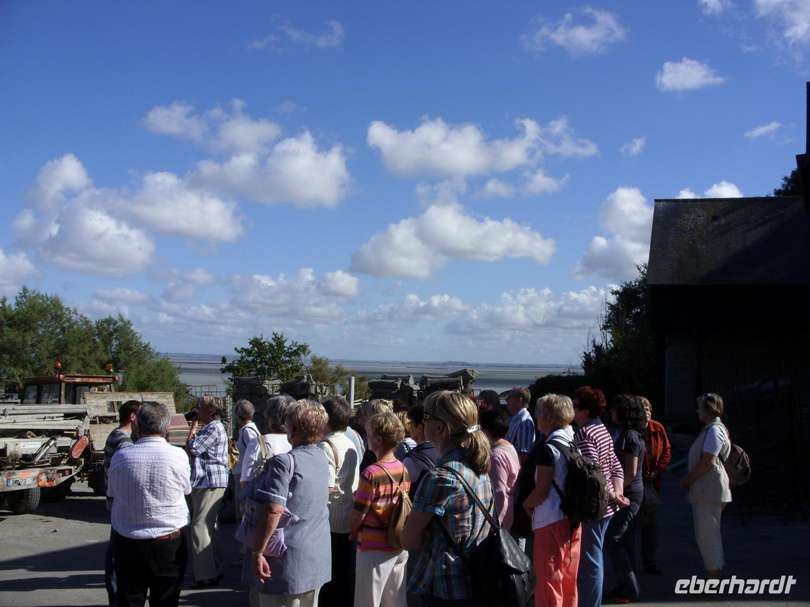 Am Vormittag des vierten Reisetages stand uns zunächst einmal eine etwas längere Busfahrt ins Haus, da wir bis zur westlichen Grenze der Normandie vordringen wollten. Doch schon von weitem sahen wir unseren nächsten Besichtigungsstopp - den berühmten Mont Saint Michel, Frankreichs meist besuchteste Sehenswürdigkeit nach dem Pariser Eiffelturm und dem Disneyland Resort. So waren wir natürlich bei unserem Besuch auch nicht allein ...Mittels eines kleinen Spaziergangs über die Festungsmauern erreichten wir unter Einsatz von viel Puste den Eingang in die beeindrucktende Klosteranlage. Noch waren es aber ein paar Stufen bis zur Aussichtsterrasse! Wunderbar, alle Gäste hatten schließlich das Dach des Mont Saint Michel erreicht und konnten nun die Sicht auf die Bucht genießen. Besonders hervor stach dabei die veränderte Meereslandschaft durch den Bau des Dammes zum Klosterberg. Schon lang war der Klosterberg nicht mehr vollständig vom Wasser umgeben! Doch allein der imposante Bau der verschiedenen Räume übereinander war Grund für eine Besichtigungstour durch das Kloster. Im Anschluss erwartete uns dann die Grand Rue, die einzige Straße auf dem Mont Saint Michel - überfüllt mit Touristen, Souvenirgeschäften und Gaststätten.