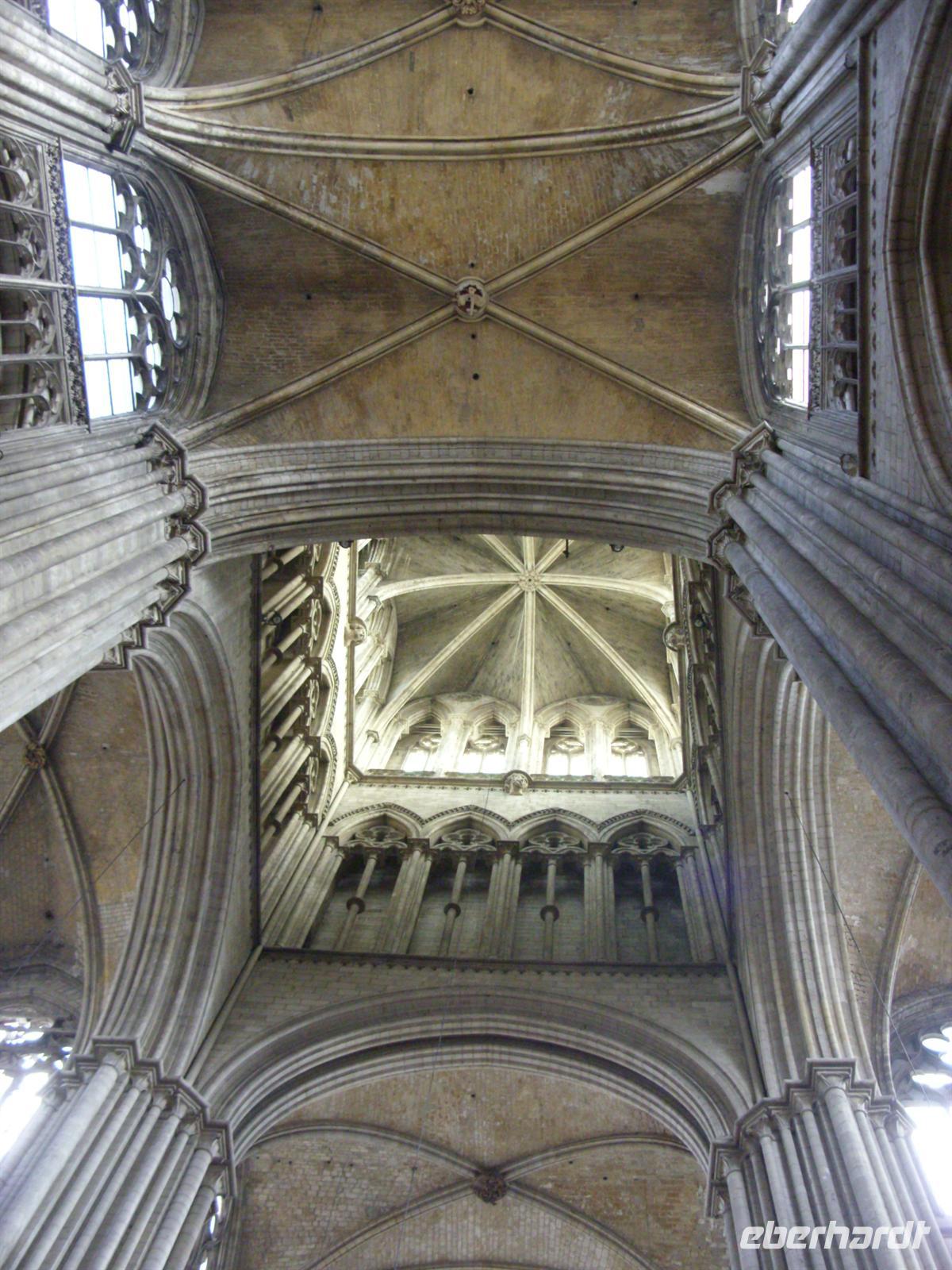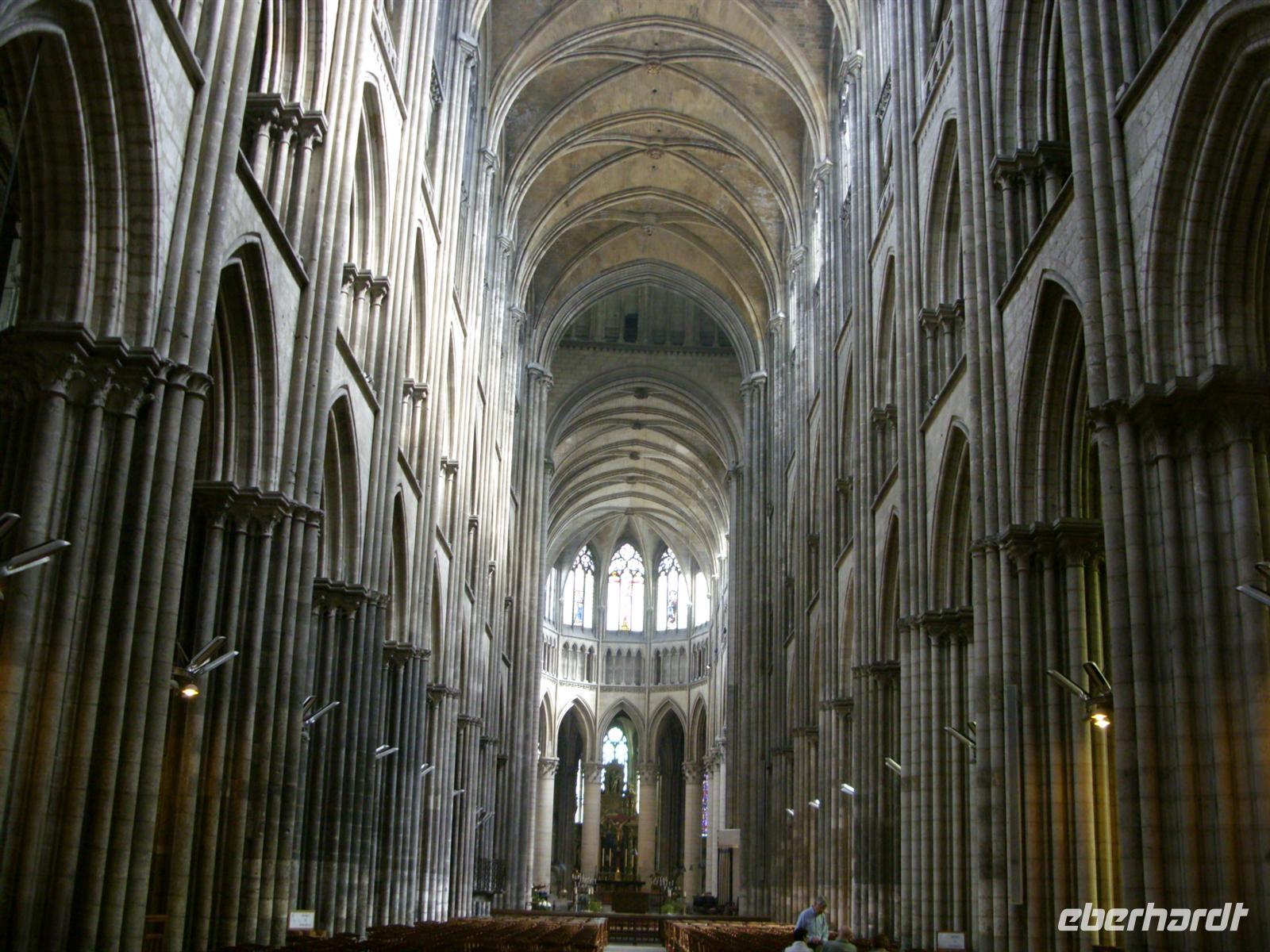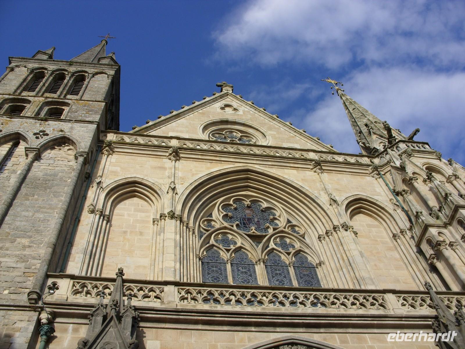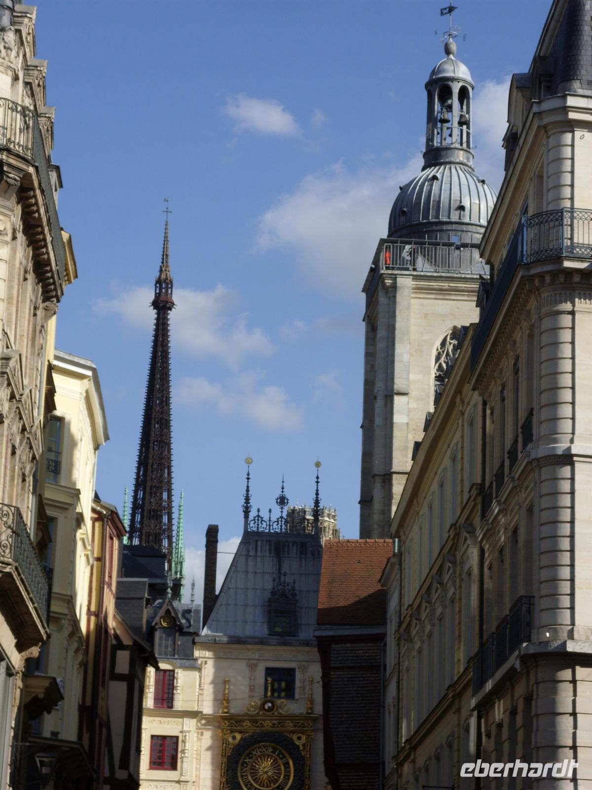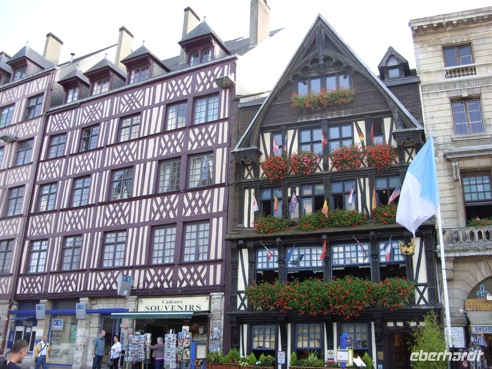 So erwartete uns im Anschluss auch gleich die Hauptstadt der Normandie - Rouen. Beeindruckend war hier natürlich die Kathedrale Notre-Dame, die mit 151,5 Metern den höchsten Kirchturm Frankreichs besitzt. Diese ganz aus Gusseisen hergestellte Turmspitze mutet wie das Werk eines Zuckerbäckers an. Nicht minder interessant ist das Innere der Kathedrale, die als Krönungsort und Grablegungsstätte der normannischen Herzöge gilt. Im Anschluss an den Kathedralenbesuch bummelte ich mit meinen begeisterten Gästen durch die Altstadt von Rouen und erklärte die verschiedenen Sehenswürdigkeiten, in erster Linie gehörte dazu das Aître Saint-Maclou, ein mittelalterliches Beinhaus, und den Ort an dem im Jahr 1431 Jeanne d'Arc auf dem Scheiterhaufen verbrannt worden ist.