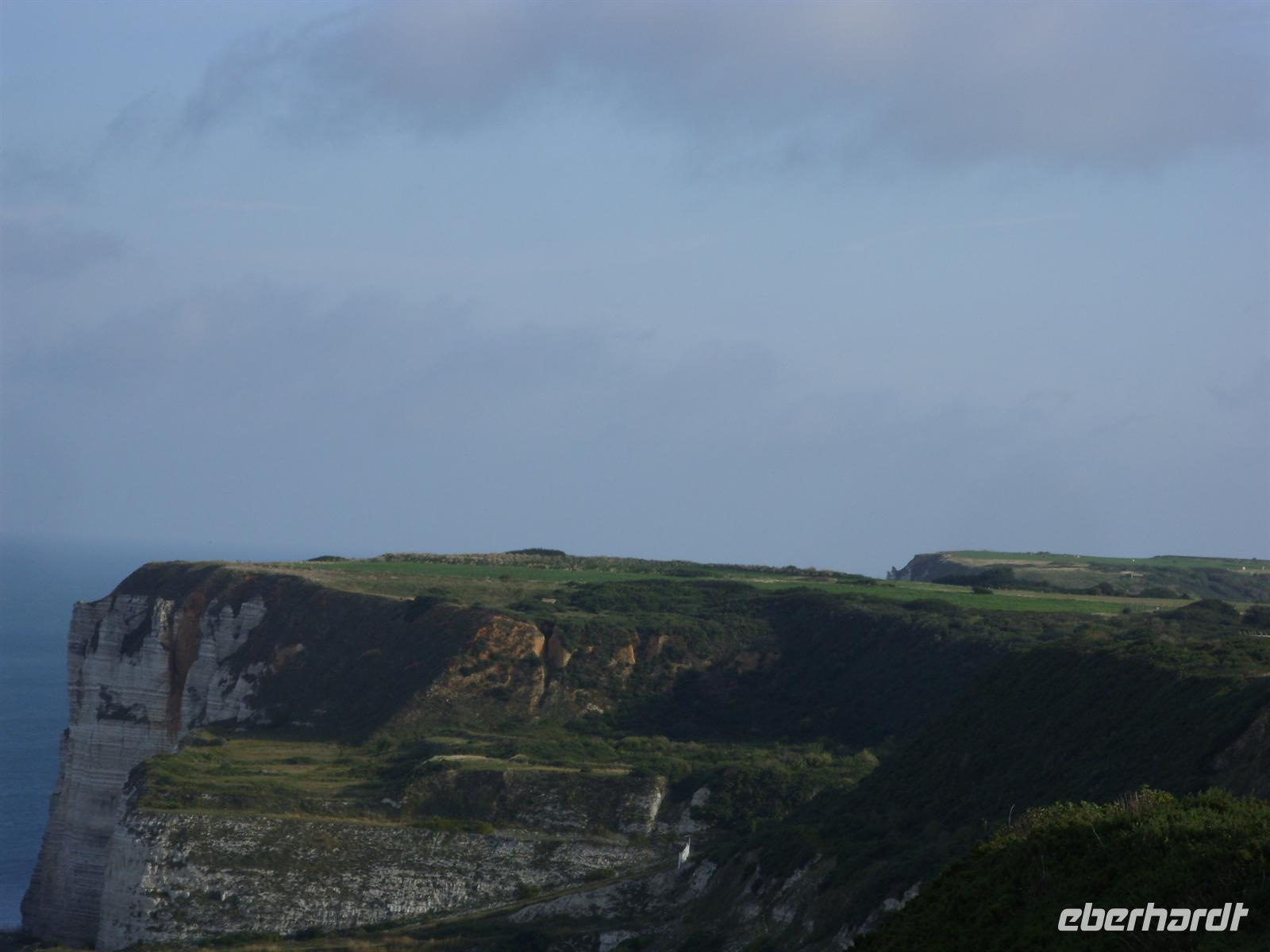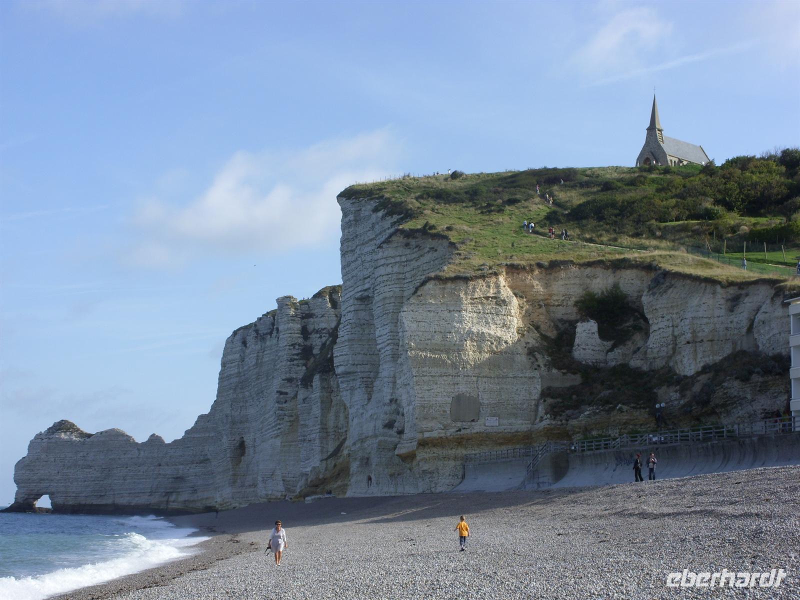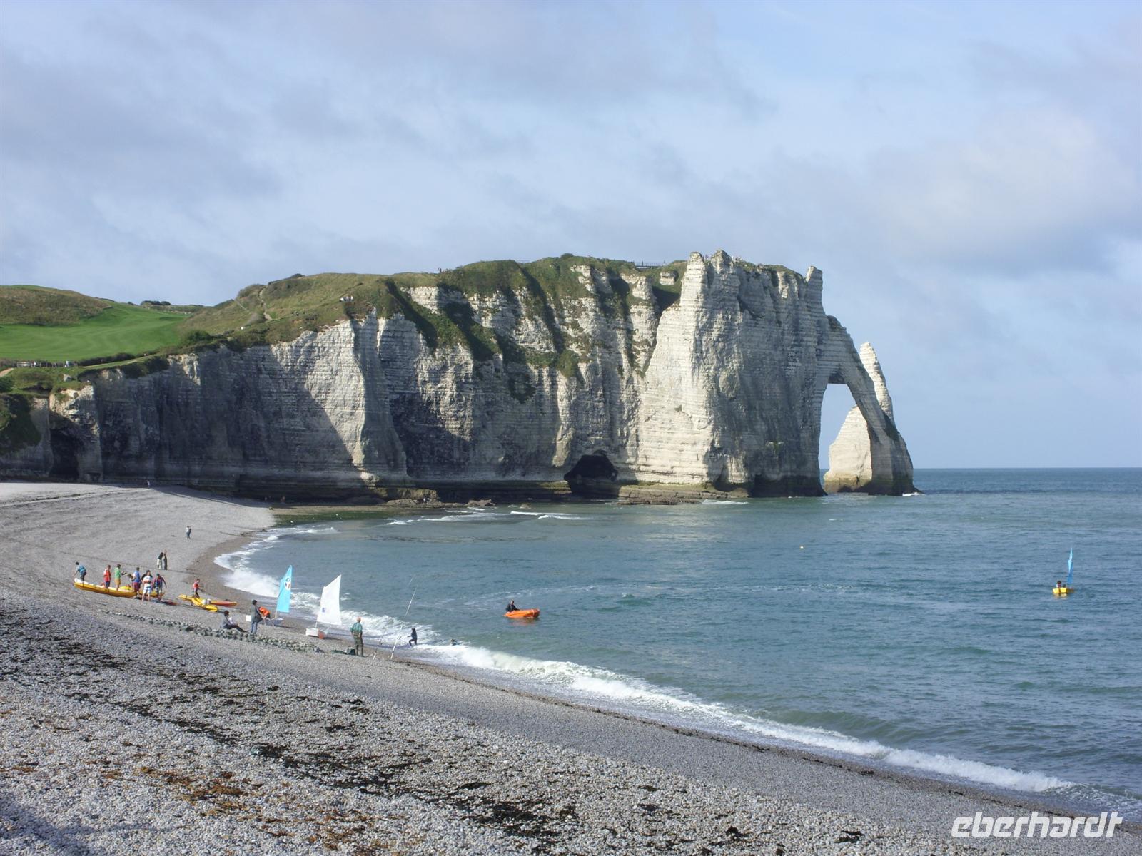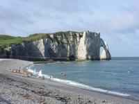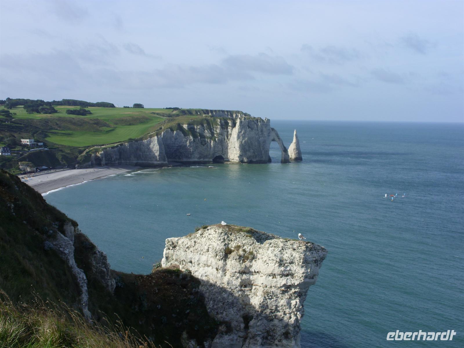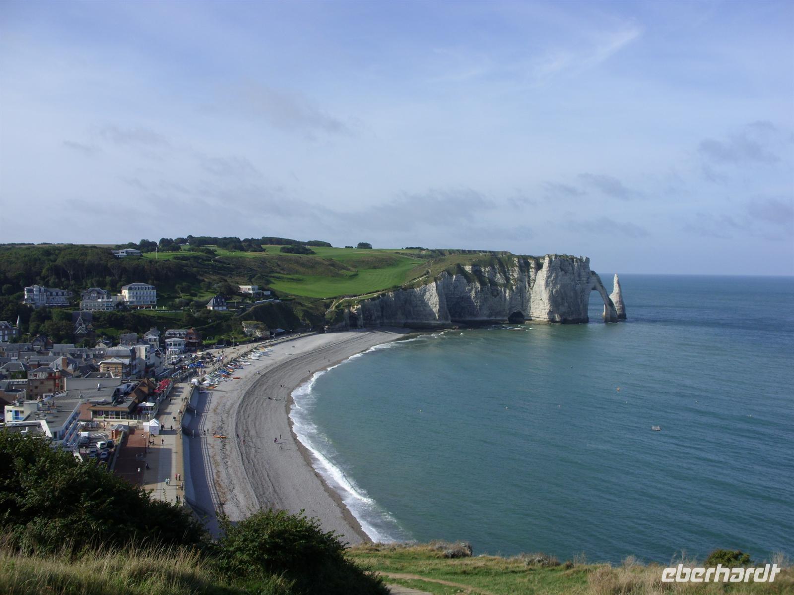 Unser dritten Reisetag sollten wir heute in zwei typischen Landschaften der Normandie verbringen. Zunächst erwartete uns das Pays de Caux nördlich von Le Havre und am Nachmittag nach Überquerung der Seine sollten wir dann das Pays d'Auge erkunden - beides idyllische Gebiete mit Feldern, Wiesen und einer beeindruckenden Küste mit romantischen Fischerdörfchen. Im Pays de Caux stoppten wir als erstes an einem Aussichtspunkt am Cap d'Antifer, wo uns die steil abfallende Alabasterküste bereits einen ersten Eindruck der hier so typischen Kreidefelsen vermittelte. Kurz darauf erreichten wir Étretat, wo schon Marie Antoinette sich gern aufhielt und die eigens für sie in dieser Bucht gezüchtete zarten Muscheln ass. Für uns standen jedoch weniger die kulinarischen Genüsse im Vordergrund sondern die berühmten Felsentore, die von einer gemütlichen Strandpromenande eingefasst werden. Natürlich war es auch möglich, die Stufen zu den Felsen hinauf zu klettern und den Anblick der Bucht von oben zu genießen. Auch für mich ist das immer wieder eine lohnenswerte Aussicht! Haben Sie auch den Elefanten gesehen, der seinen Rüssel ins Meer steckt? Victor Hugo hatte vor langer Zeit dies tatsächlich schon richtig erkannt.