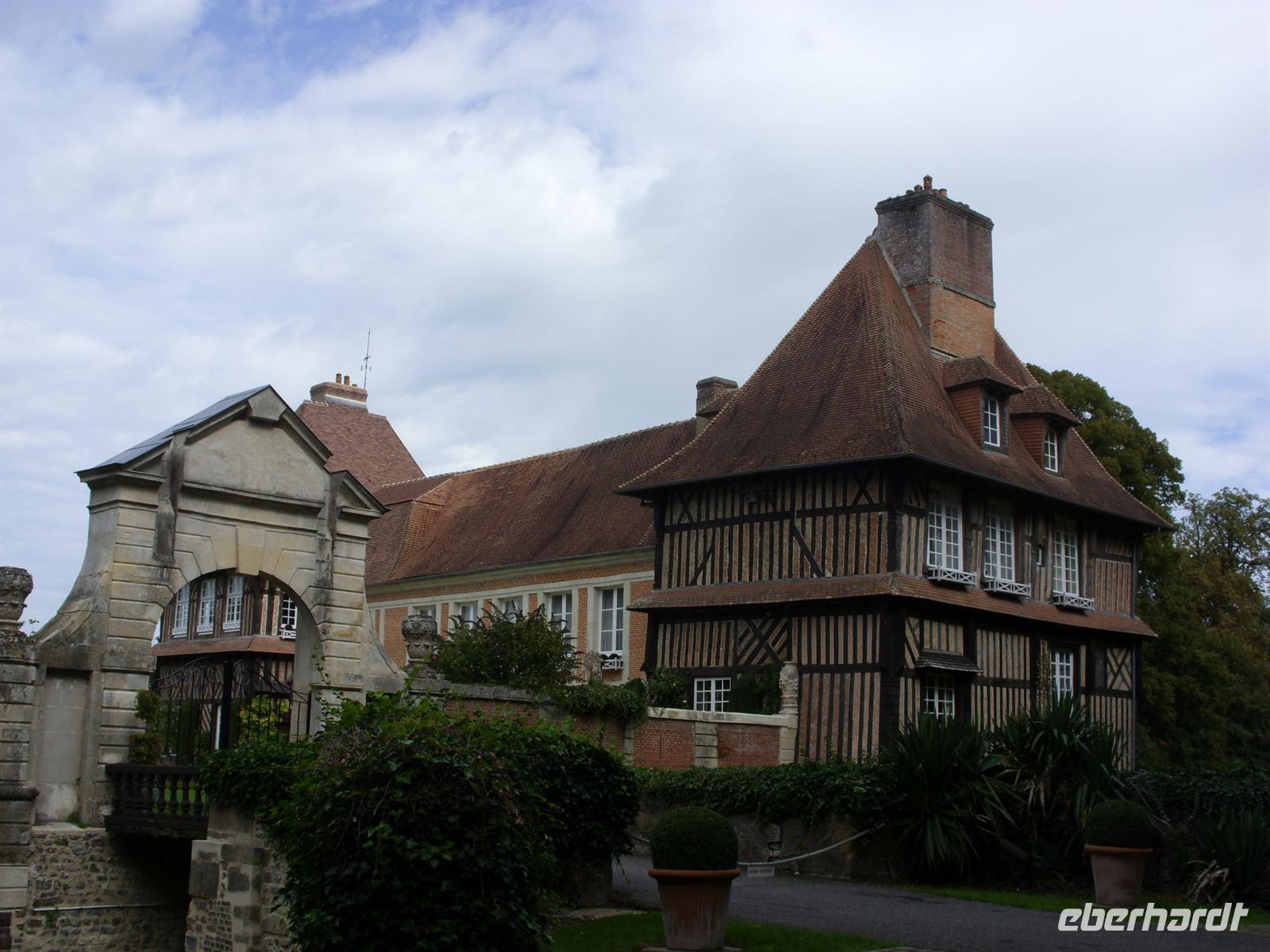 Nach einer kleinen Stärkung aus dem Bus war Mittagsruhezeit angesetzt, denn jetzt mussten wir erst einmal ein paar Kilometer zurücklegen, die Seine auf der Pont de Tancarville überqueren und die Richtung zu unserem nächsten Highlight, dem Château de Breuil, aufnehmen. Im Pays d'Auge angekommen sollten wir zunächst eine Calvadosdestillerie besichtigen, die für diesen Landstrich so typisch ist - das Pays d'Auge gilt nämlich als Land der Apfelbäume. Und Äpfel sind ja bekanntlich der Hauptbestandteil des Apfelweins Cidre und des Apfelbranntweins Calvados. Das Château de Breuil erwartete uns also mit einer kleinen Destillerie, einem Lagerkeller und einem kleinen Verkostungs- sowie Verkaufsraum. Doch besonders auch die grüne Parkanlage und das alte Herrenhaus begeisterte die Naturfreunde unter uns - eine Bilderbuchanlage!