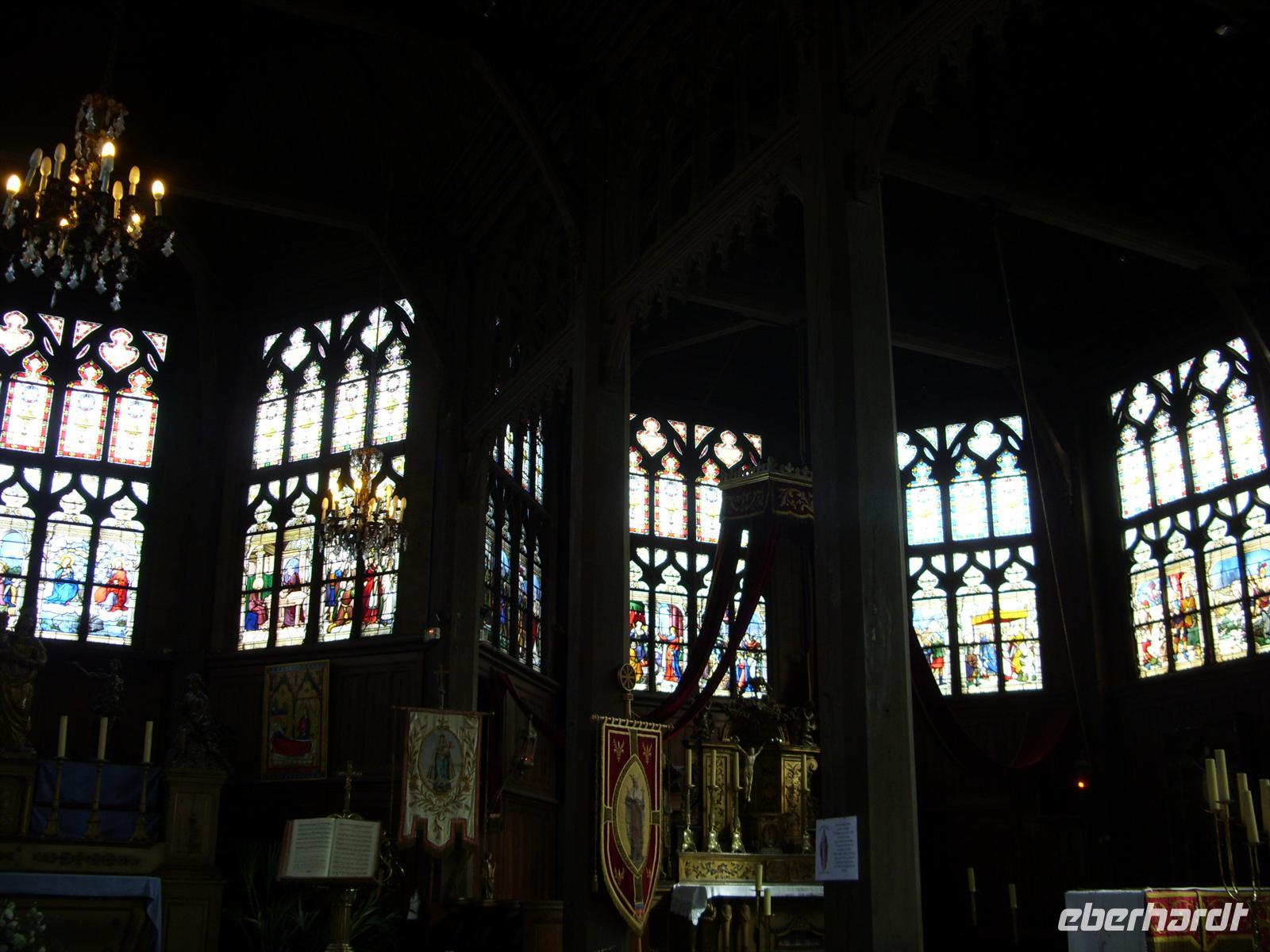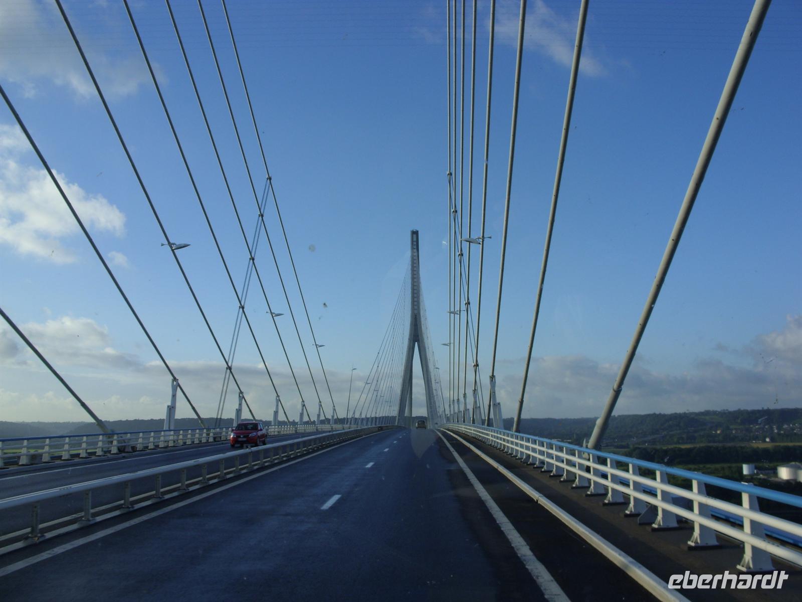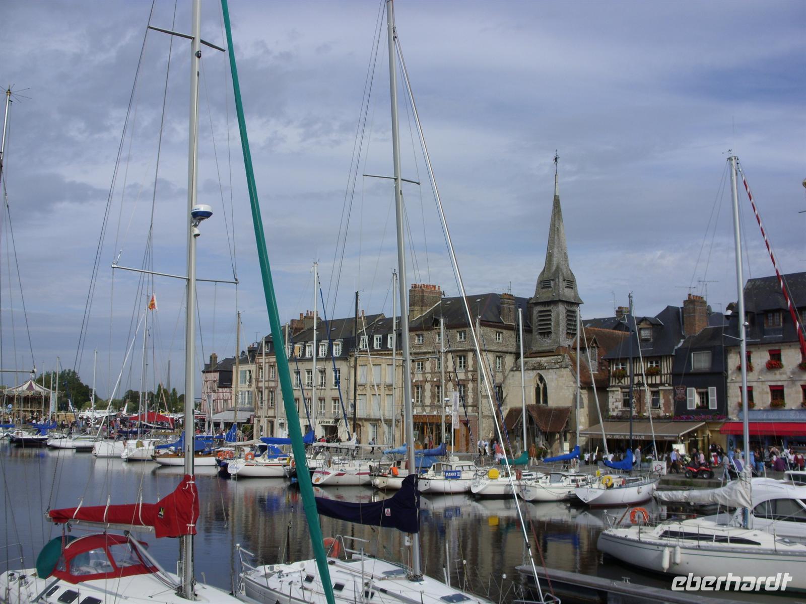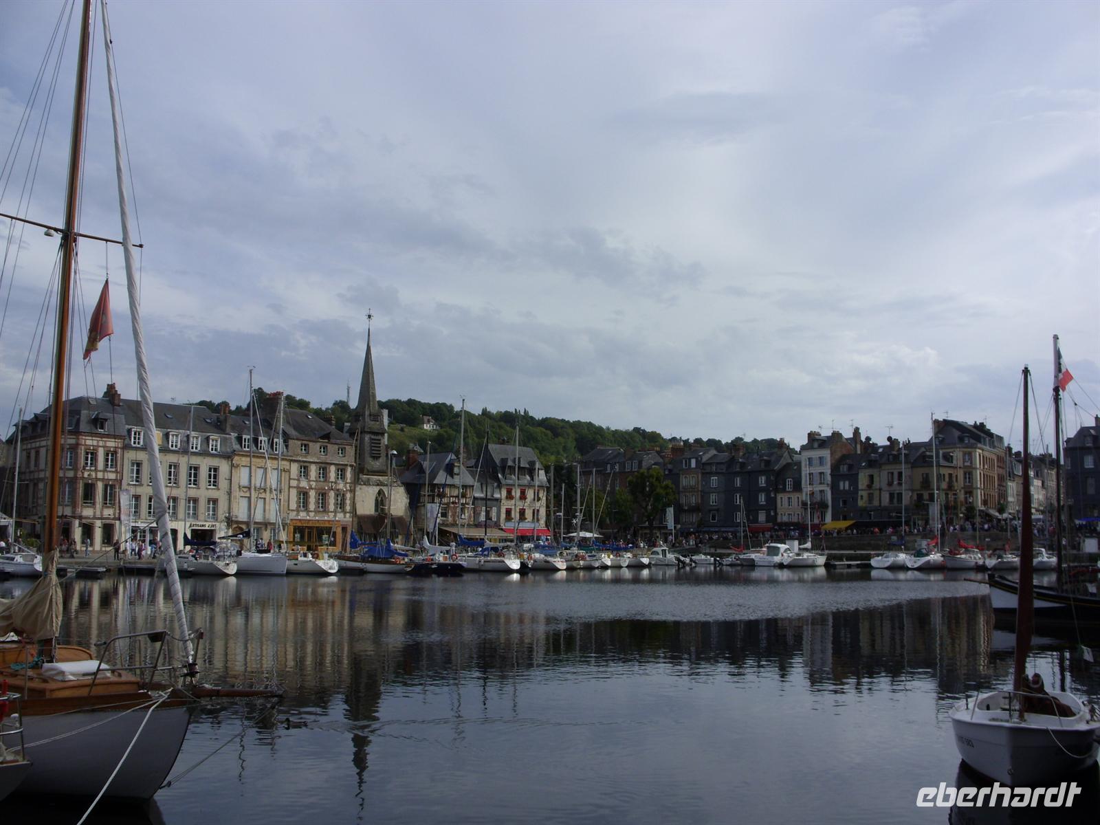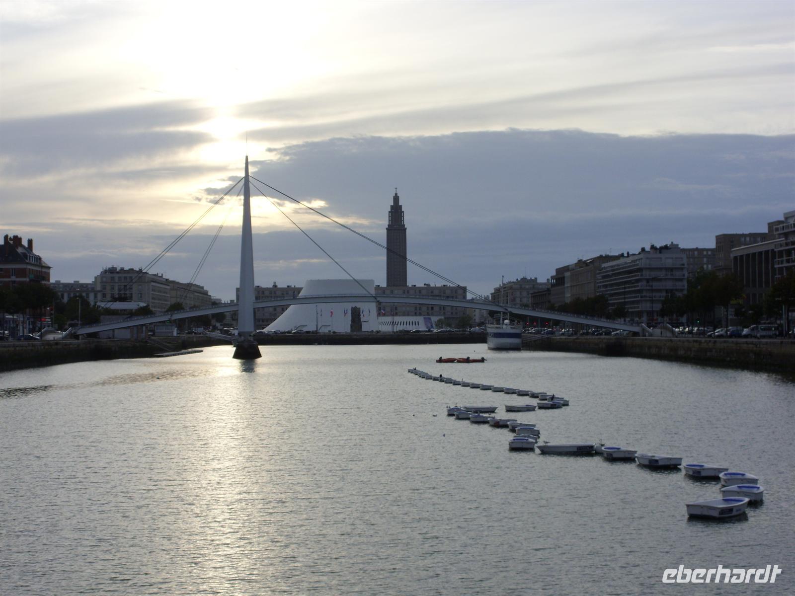 Am Nachmittag besuchten wir schließlich den lebendigen Hafenort Honfleur. Bei einem kleinen gemeinsamen Bummel zeigte ich die unterschiedlichen Fachwerkhäuser, das alte Hafenbecken und selbstverständlich die herausragendste Sehenswürdigkeit: eine Kirche ganz aus Holz errichtet. Sainte-Cathérine war nach dem Hundertjährigen Krieg als Provisorium errichtet worden, immer wieder angebaut und bezaubert nun auch heute noch ihre Besucher - unbedingt sehenswert! In Honfleur konnten wir endlich auch ein wenig die normannische Lebensart beobachten, denn hier blieb uns Zeit für ein individuelles Stündchen. Bevor es am späten Nachmittag zurück nach Le Havre ging, statteten wir noch der größten Schrägseilbrücke der Welt, der Pont de Normandie, einen Besuch ab. Vor dem Abendessen blieb jedem Gast dann noch ein Moment, um sich auch in Le Havre umzuschauen. Diese moderne Hafenstadt wurde ja in den Jahren 1945 bis 1954 in farbiger Betonarchitektur wieder aufgebaut und ist dafür im Jahr 2005 in die UNESCO-Weltkulturerbeliste aufgenommen wurden - mit Sicherheit ein wenig fragwürdig!?