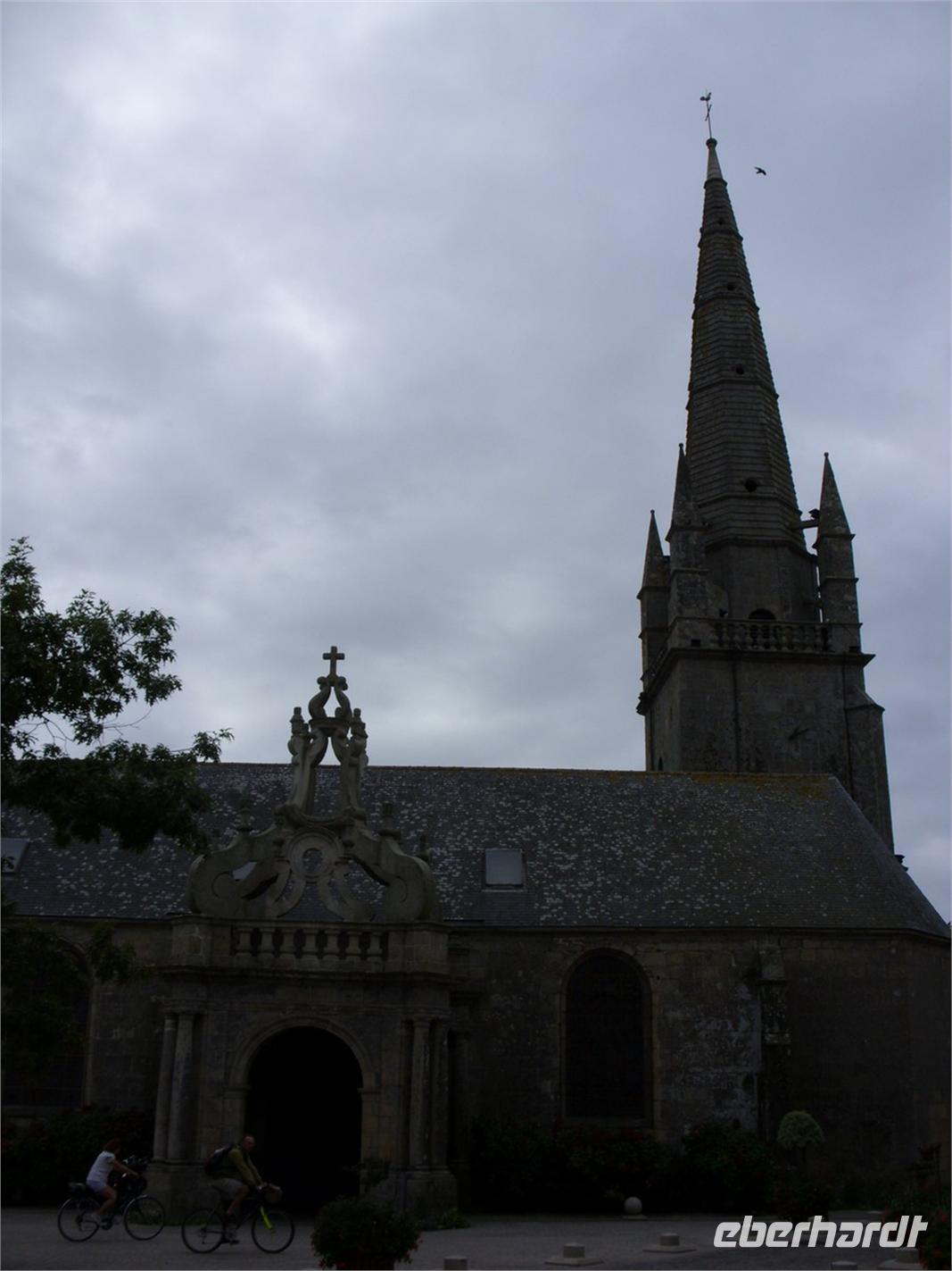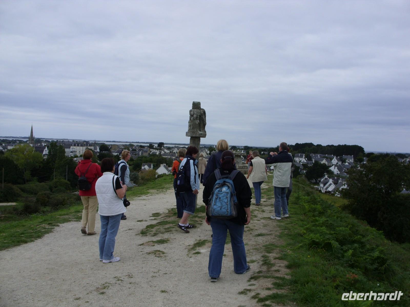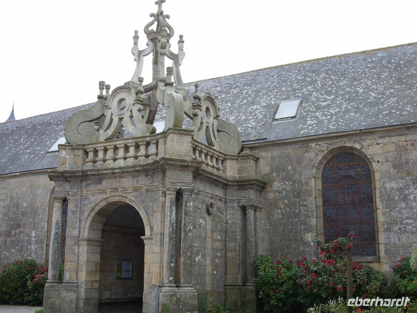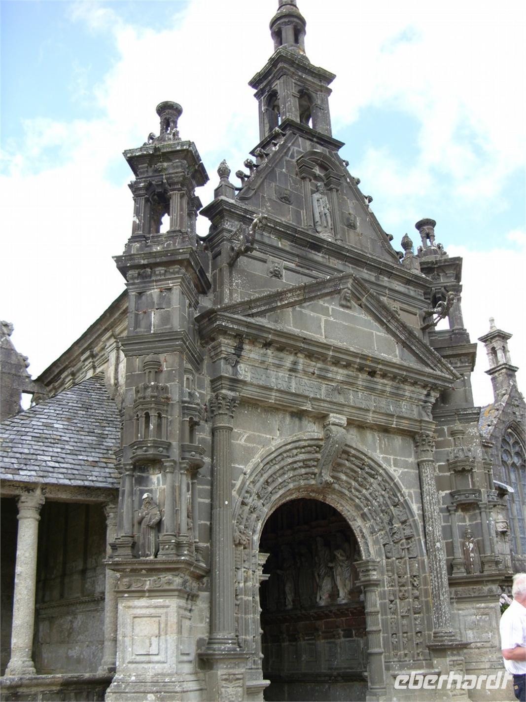 Nachdem wir zur Mittagsstunde einen kleinen Snack aus dem Bus eingenommen hatten und unsere kurzzeitig verschollene Hamburgerin wieder eingesammelt hatten, konnte es gen Süden weiter gehen. Wir wollten nun das Innere der Bretagne erkunden, was ursprünglich als "Argoat - Das Land des Waldes" beschrieben worden ist. Doch war war der Wald? Abgeholzt. Über die Jahrhunderte hinweg hatte man die dichten Wälder des Brennholzes und Bauholzes beraubt uns so war auch der berühmte Zauberwald Brocéliande veschwunden. Stattdessen sahen wir nichts als Wiesen und Weiden, denn als relativ karges Land war hier noch nicht einmal die Landwirtschaft sonderlich ertragreich. Trotzdem erwaretete uns nach kurzer Zeit schon wieder eine neue, typisch bretonische Sehenswürdigkeit - nämlich die Kalvarienberge von St. Thegonnec und Guimiliau. Sicherlich hatte sich die meisten unter dem Begriff Kalvarienberg etwas ganz Anderes vorgestellt. In der Bretagne handelt sich bei den Kalvarienbergen um umfriedete Pfarrbezirke ...