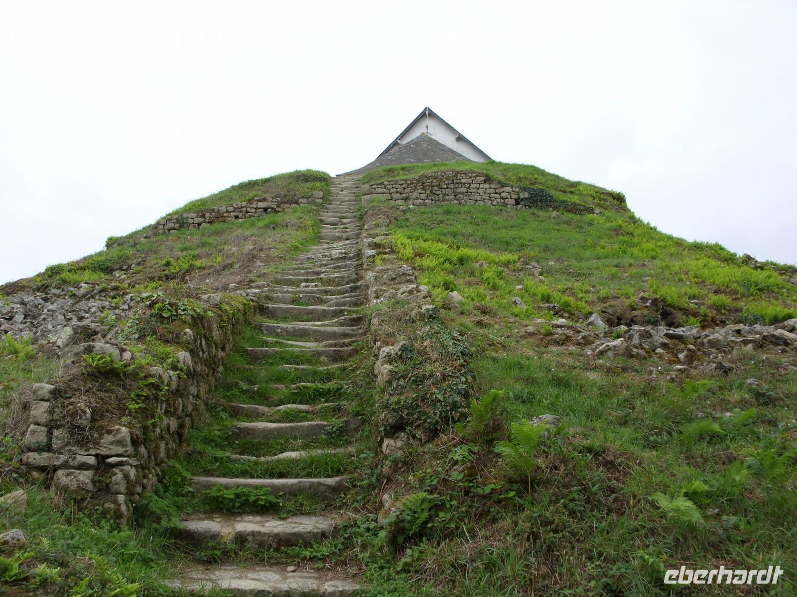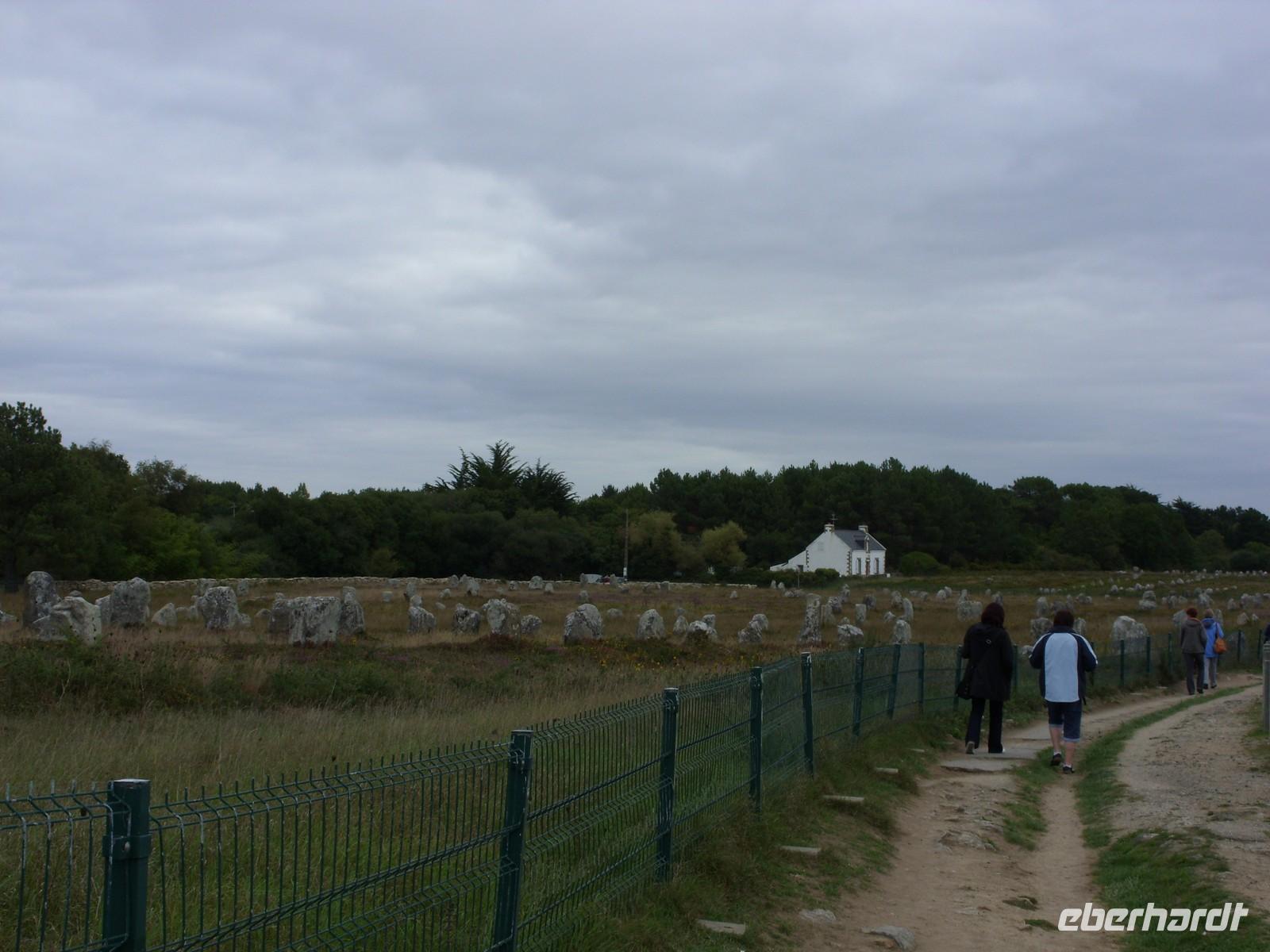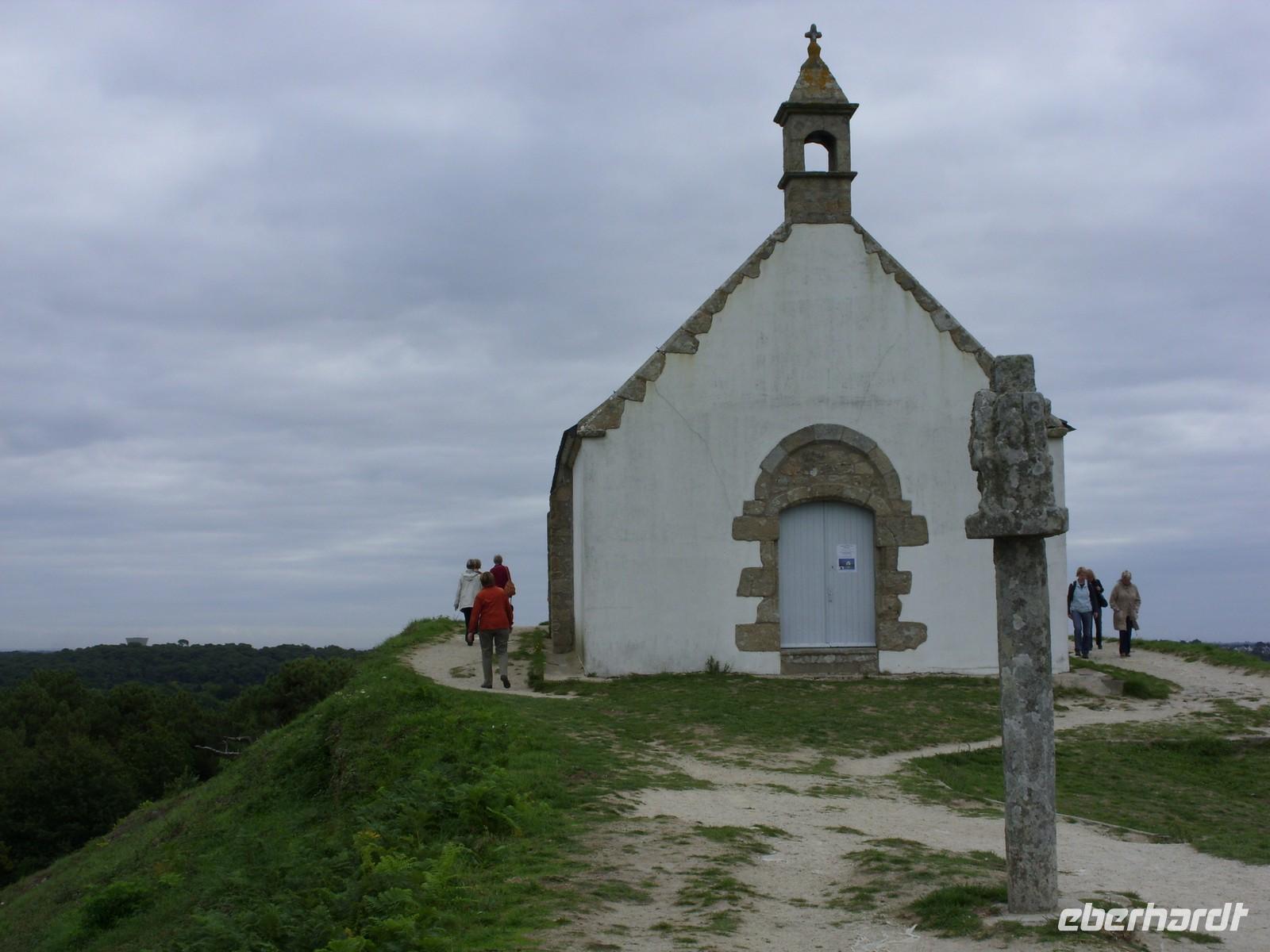 Nachdem wir zur Mittagsstunde einen kleinen Snack aus dem Bus eingenommen hatten und unsere kurzzeitig verschollene Hamburgerin wieder eingesammelt hatten, konnte es gen Süden weiter gehen. Wir wollten nun das Innere der Bretagne erkunden, was ursprünglich als "Argoat - Das Land des Waldes" beschrieben worden ist. Doch war war der Wald? Abgeholzt. Über die Jahrhunderte hinweg hatte man die dichten Wälder des Brennholzes und Bauholzes beraubt uns so war auch der berühmte Zauberwald Brocéliande veschwunden. Stattdessen sahen wir nichts als Wiesen und Weiden, denn als relativ karges Land war hier noch nicht einmal die Landwirtschaft sonderlich ertragreich. Trotzdem erwaretete uns nach kurzer Zeit schon wieder eine neue, typisch bretonische Sehenswürdigkeit - nämlich die Kalvarienberge von St. Thegonnec und Guimiliau. Sicherlich hatte sich die meisten unter dem Begriff Kalvarienberg etwas ganz Anderes vorgestellt. In der Bretagne handelt sich bei den Kalvarienbergen um umfriedete Pfarrbezirke ...