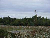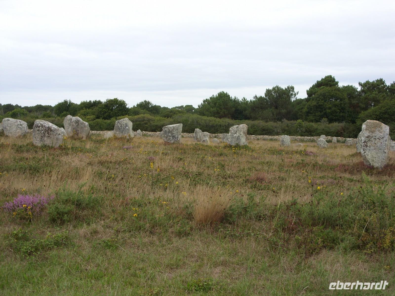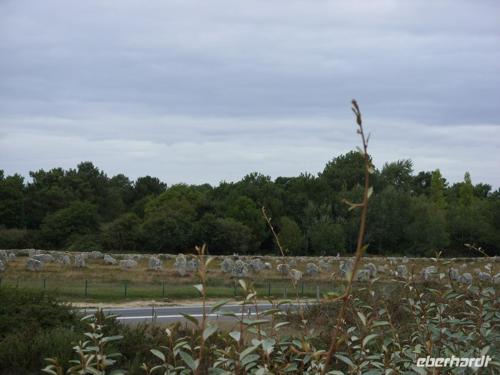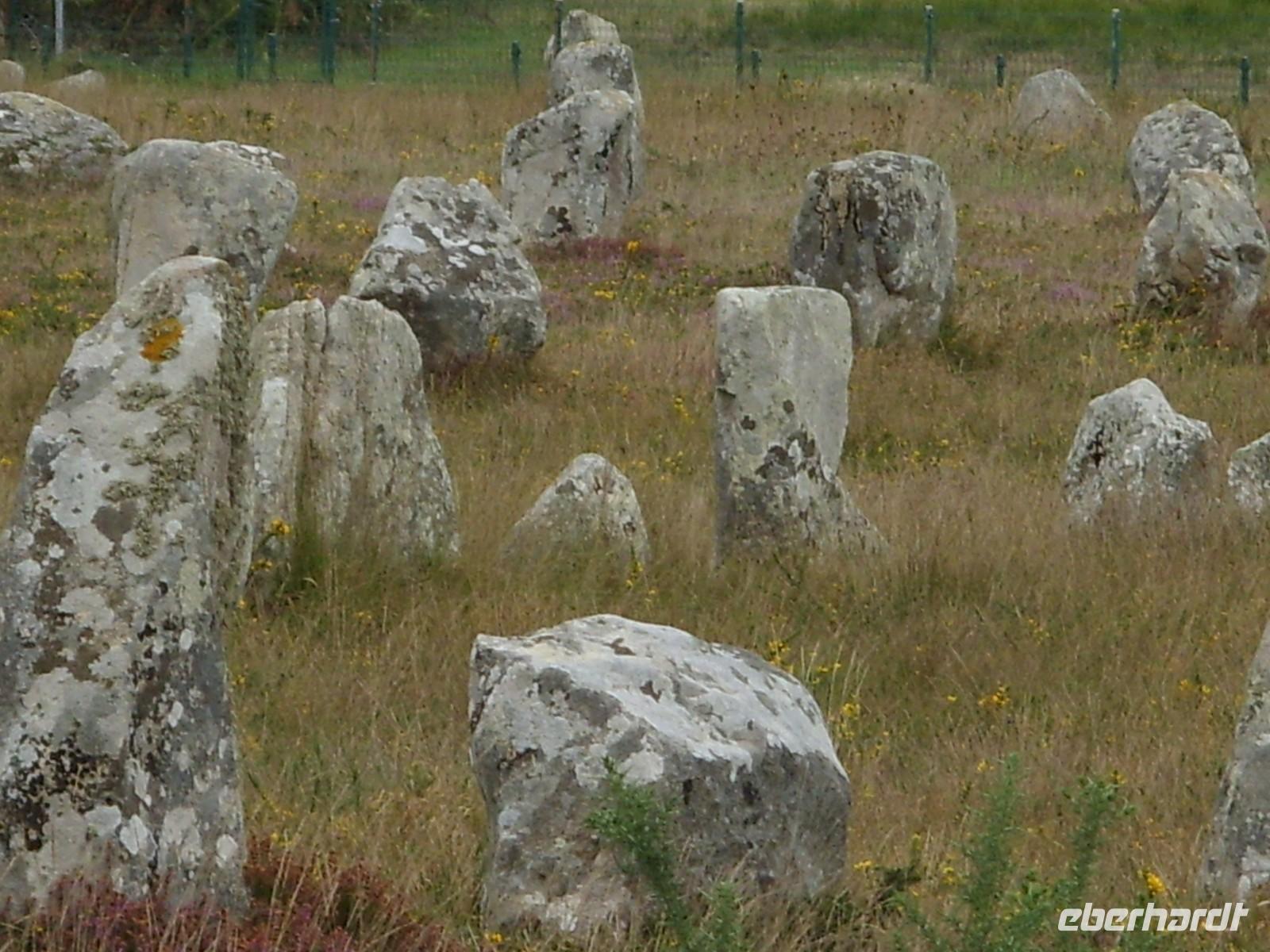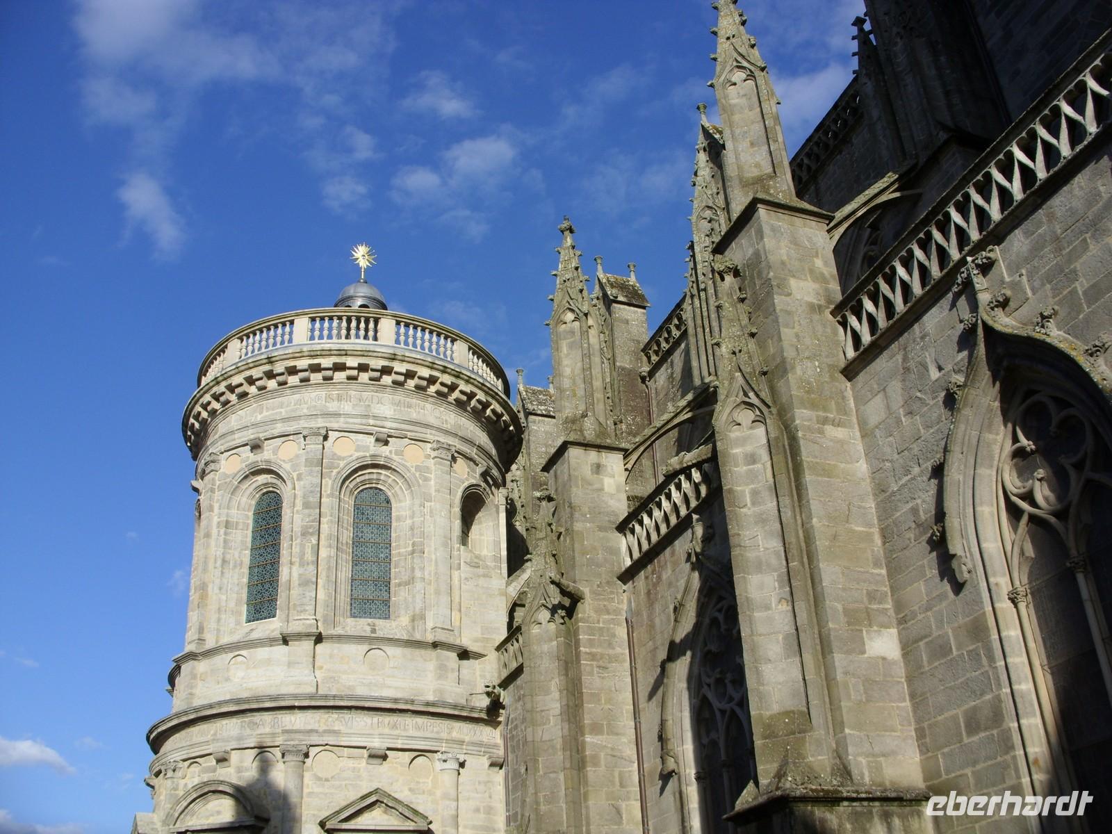 Nachdem wir zur Mittagsstunde einen kleinen Snack aus dem Bus eingenommen hatten und unsere kurzzeitig verschollene Hamburgerin wieder eingesammelt hatten, konnte es gen Süden weiter gehen. Wir wollten nun das Innere der Bretagne erkunden, was ursprünglich als "Argoat - Das Land des Waldes" beschrieben worden ist. Doch war war der Wald? Abgeholzt. Über die Jahrhunderte hinweg hatte man die dichten Wälder des Brennholzes und Bauholzes beraubt uns so war auch der berühmte Zauberwald Brocéliande veschwunden. Stattdessen sahen wir nichts als Wiesen und Weiden, denn als relativ karges Land war hier noch nicht einmal die Landwirtschaft sonderlich ertragreich. Trotzdem erwaretete uns nach kurzer Zeit schon wieder eine neue, typisch bretonische Sehenswürdigkeit - nämlich die Kalvarienberge von St. Thegonnec und Guimiliau. Sicherlich hatte sich die meisten unter dem Begriff Kalvarienberg etwas ganz Anderes vorgestellt. In der Bretagne handelt sich bei den Kalvarienbergen um umfriedete Pfarrbezirke ...