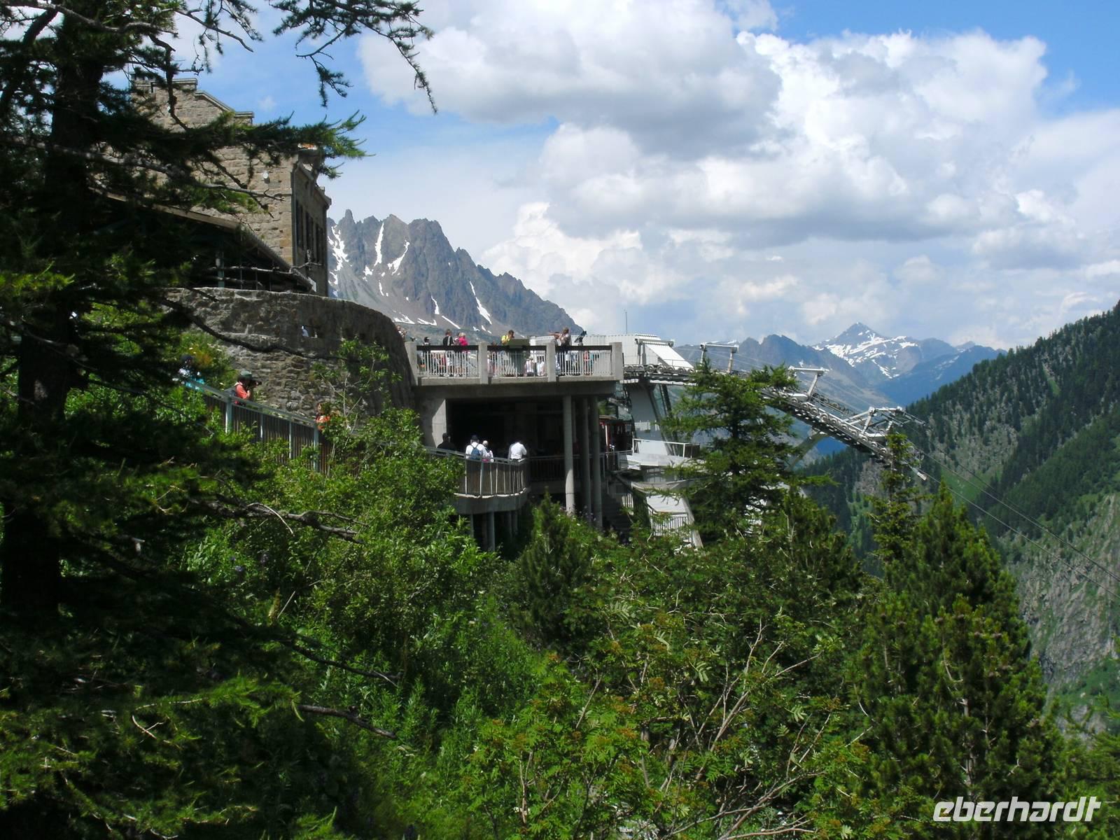 Die eine Gruppe fuhr mit 19 Gästen mit der Seil-Bahn in 20 Minuten zum Aiguille du Midi auf ca. 3.842 m, um dem Mont Blanc ganz nahe zu sein (leider war der Gipfel meistens in Wolken verhangen).
