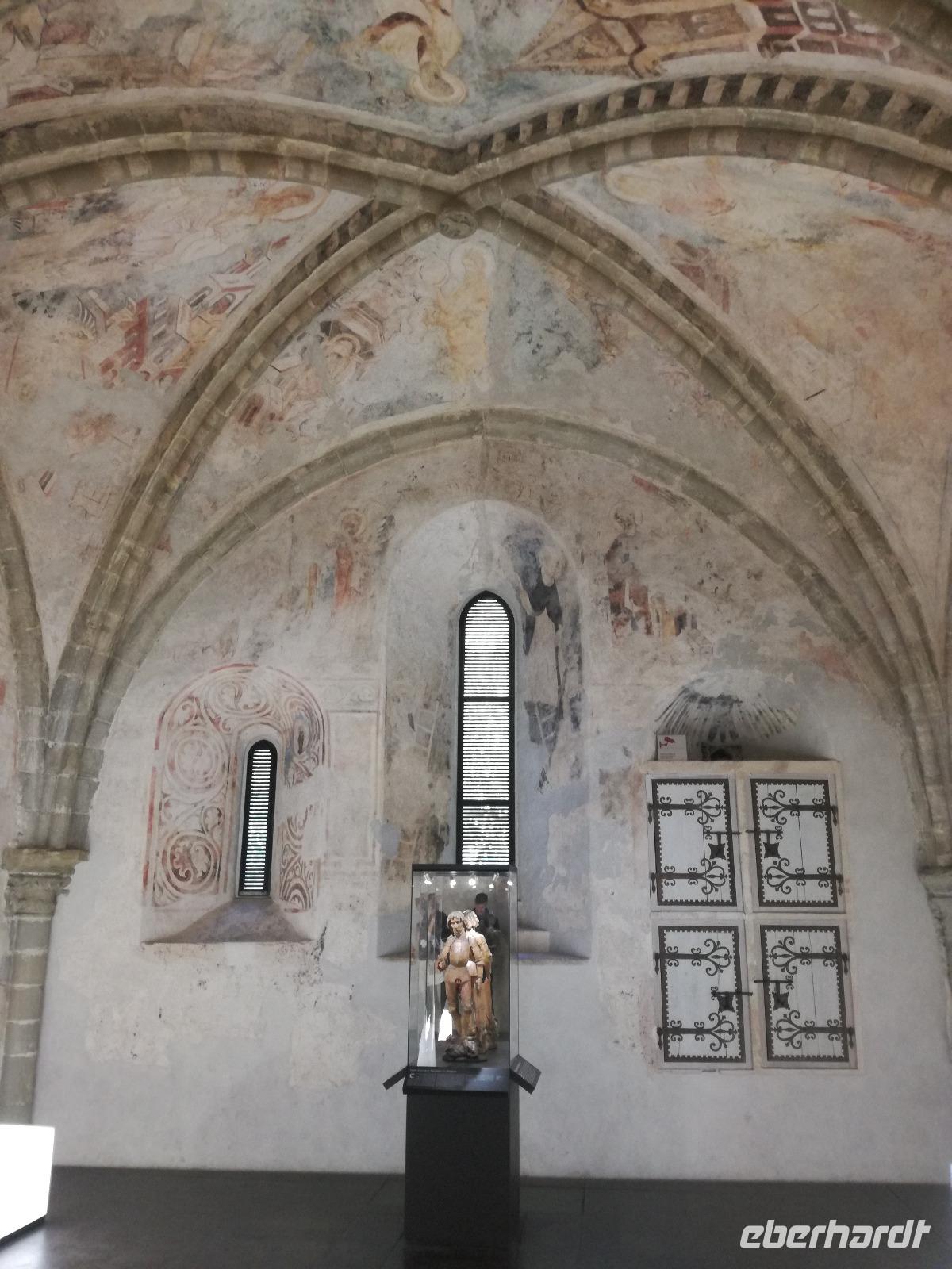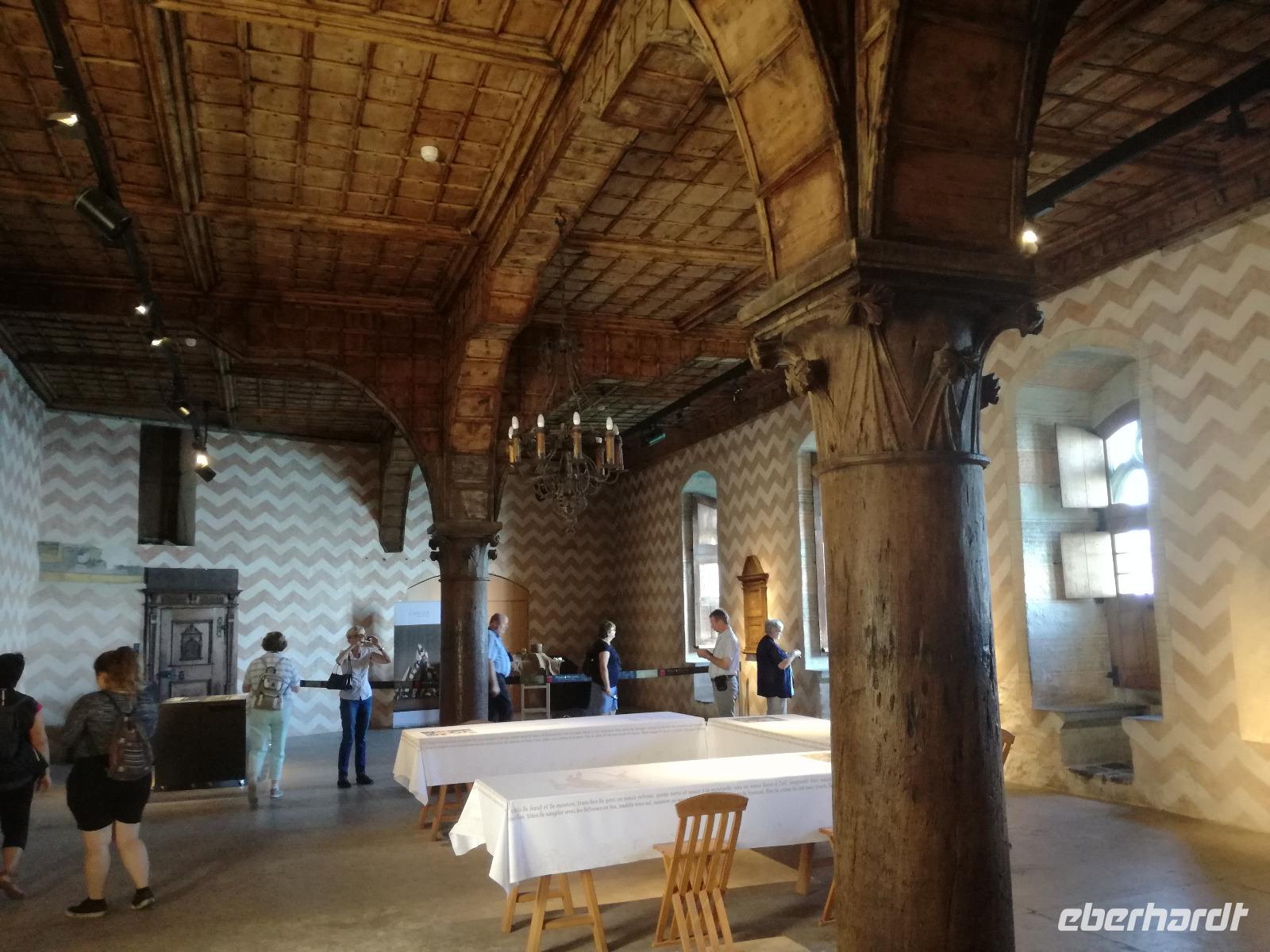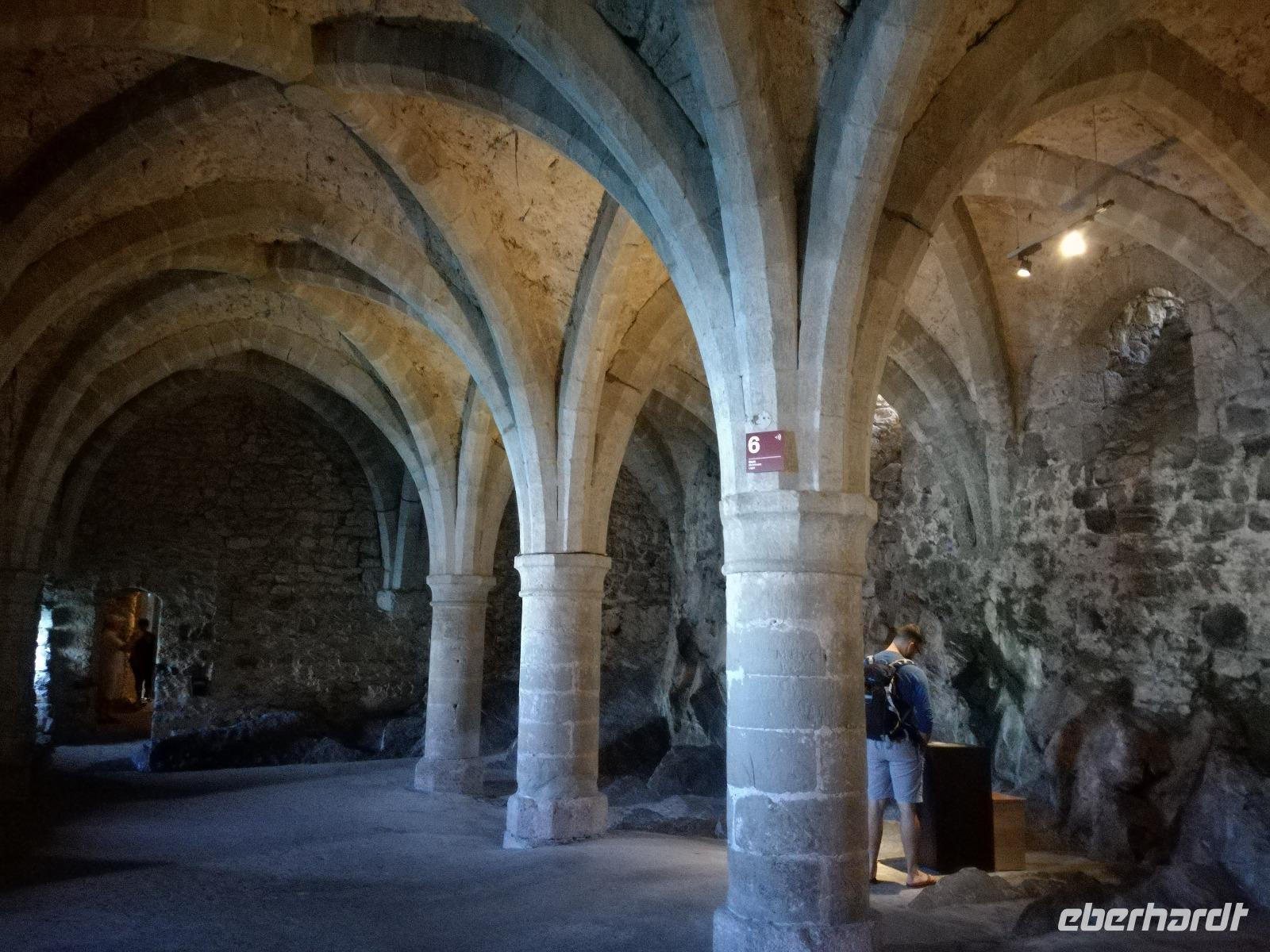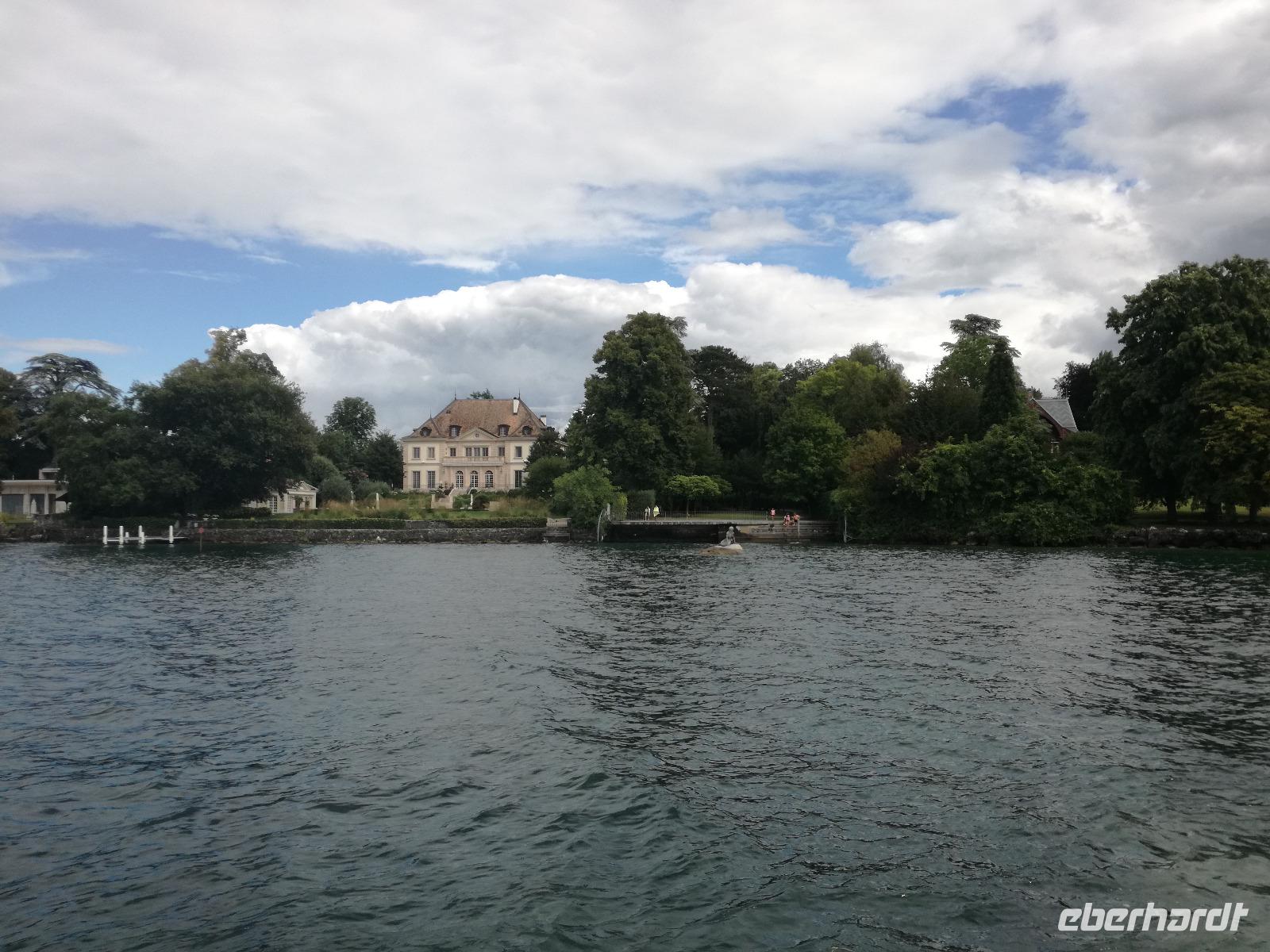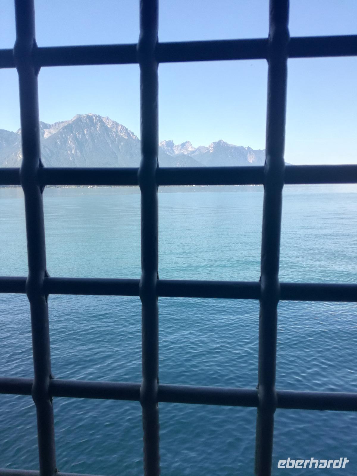 Mit „nur" 37 Mann an Bord - nicht alle wollten an dem fakultativen Ausflug teilnehmen und einige blieben in Morzine um dort zu spazieren - ging es früh nach Chillon. Das im 13. Jahrhundert erbautes Schloss liegt malerisch auf eine kleine Halbinsel am Genfer See. Wie ein Juwel in seinem Schrein. Gut anderthalb Stunden standen uns zur Verfügung, um dem Ort umfassend zu erkunden. Die inkludierte Audioguides lieferten alle historischen Details.