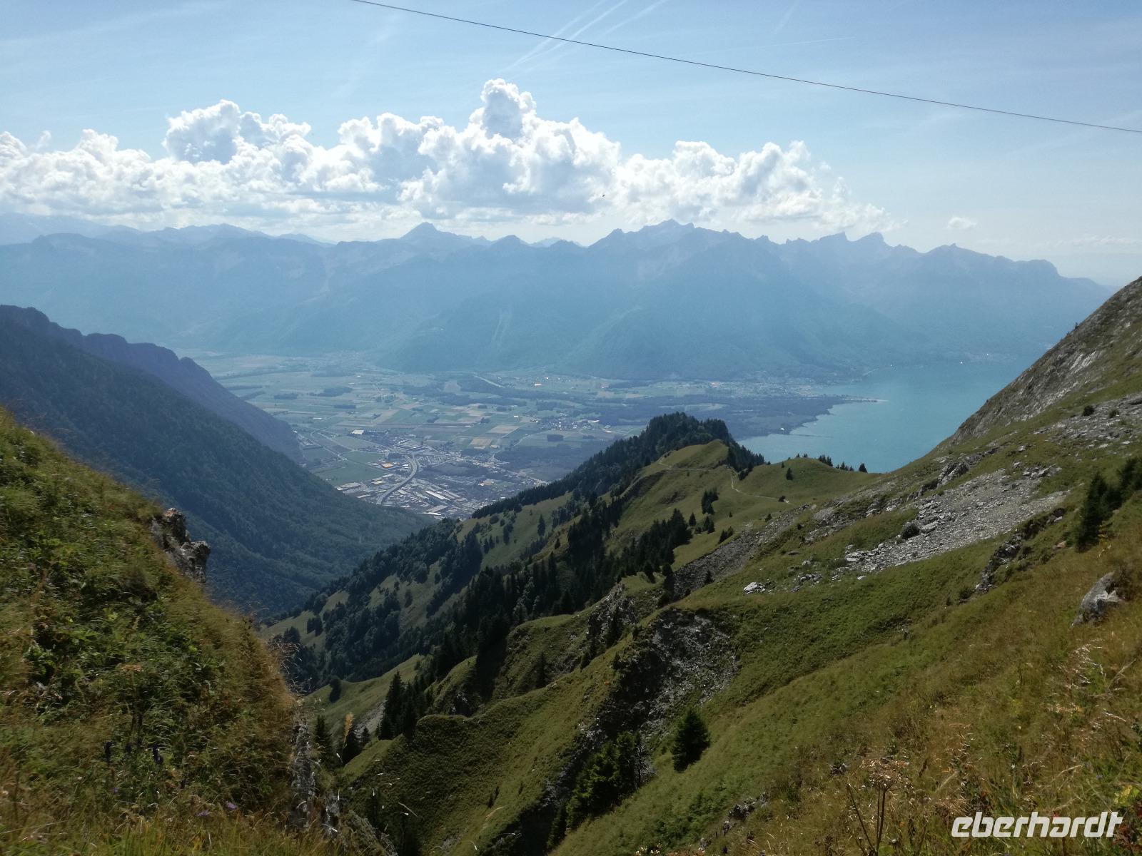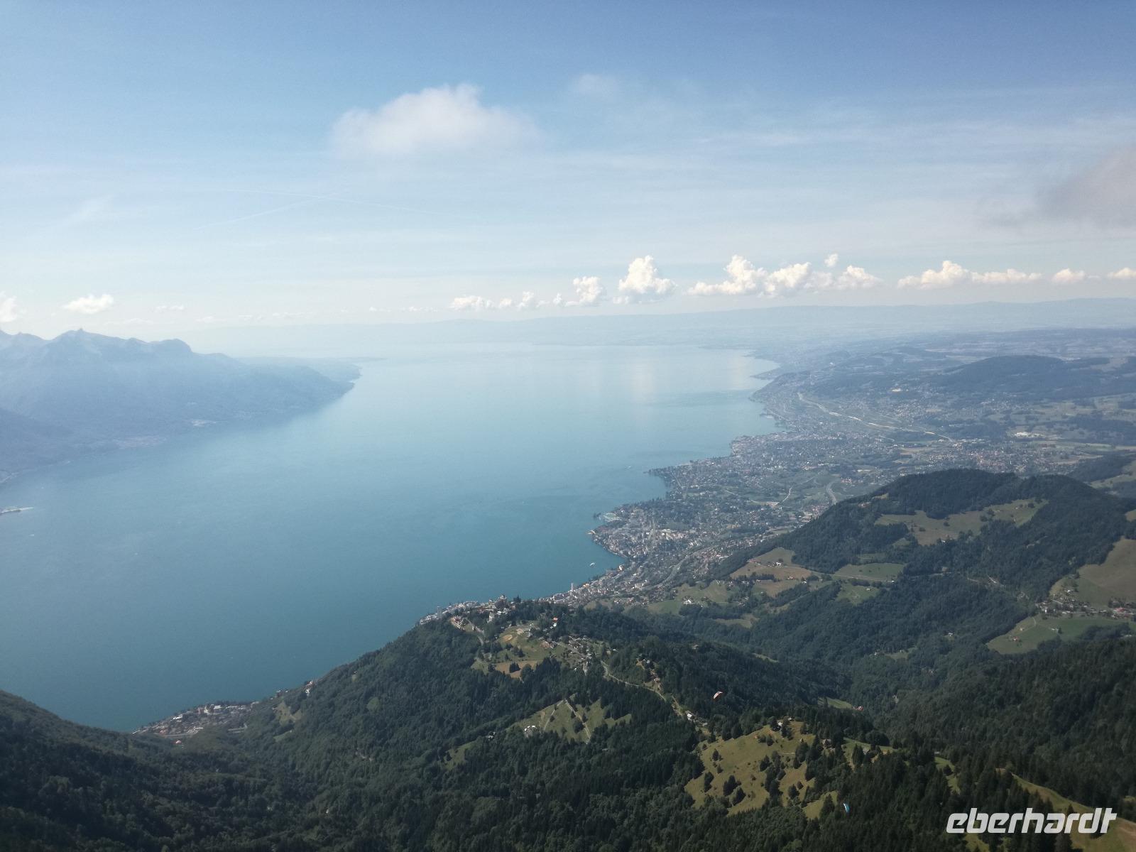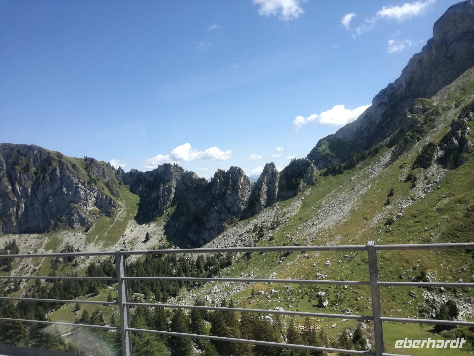 Für die nach dieser Führung beginnende Mittagspause ging es weiter nach Montreux. Dort blieb uns ein bisschen Zeit zum Flanieren am Seeufer, bevor wir mit einer historischen Zahnradbahn eine 40-minütigen Fahrt unternahmen. Es ging hoch zum Gipfel des Hausberges Montreux - die Rochers de Naye. Von den Rochers de Naye - bei 2.048 Meter Höhe - war der Blick auf dem Genfer See einfach herrlich! Zu besichtigen war oben auch noch ein alpiner, botanischer Garten und das „Marmotte-Paradies", sieben Gehege mit Murmeltiere aus der ganzen Welt. Allerdings waren diese an jenem Tag Menschenscheu und nur das europäische Murmeltier ließ sich kurz blicken.