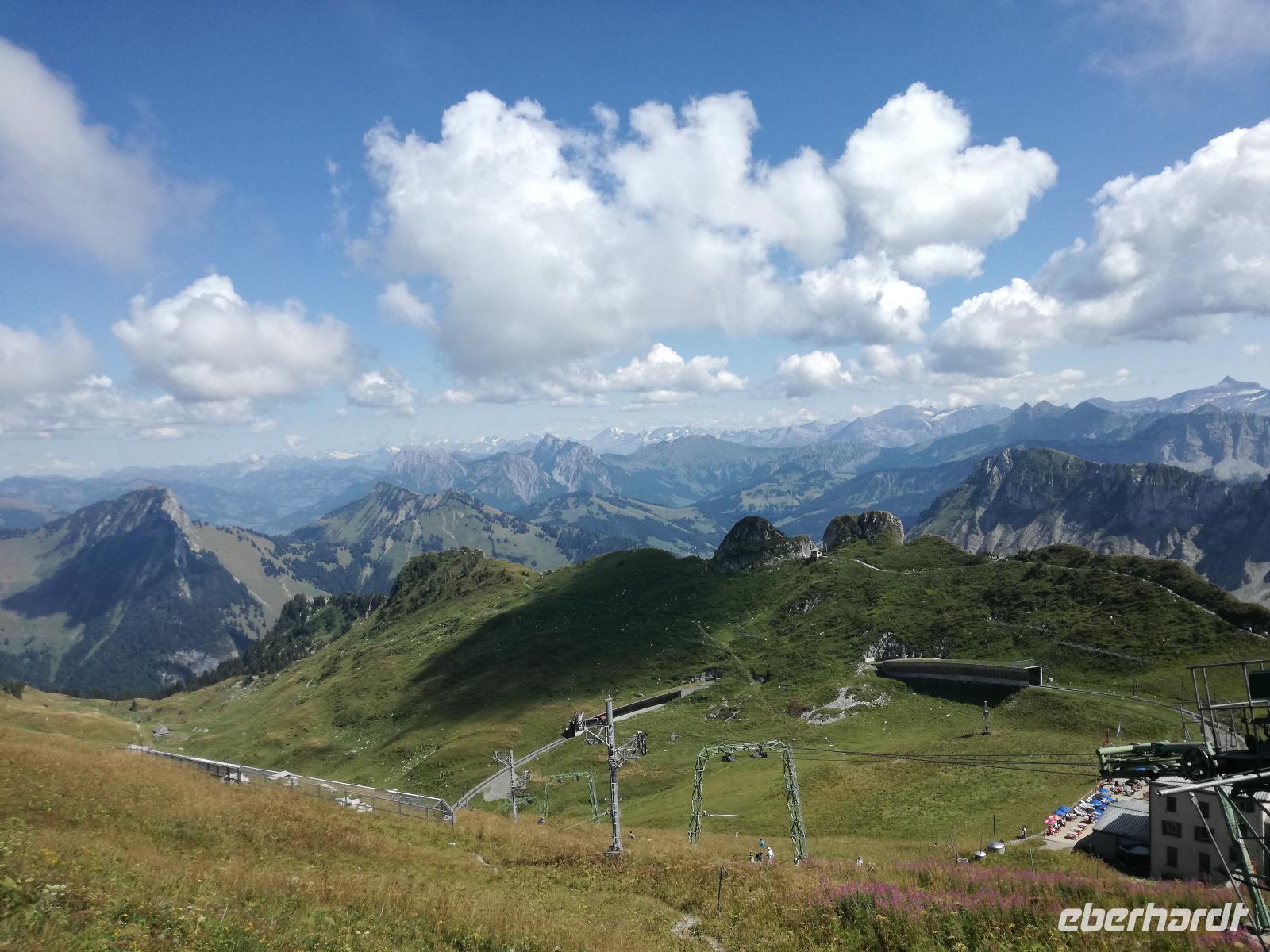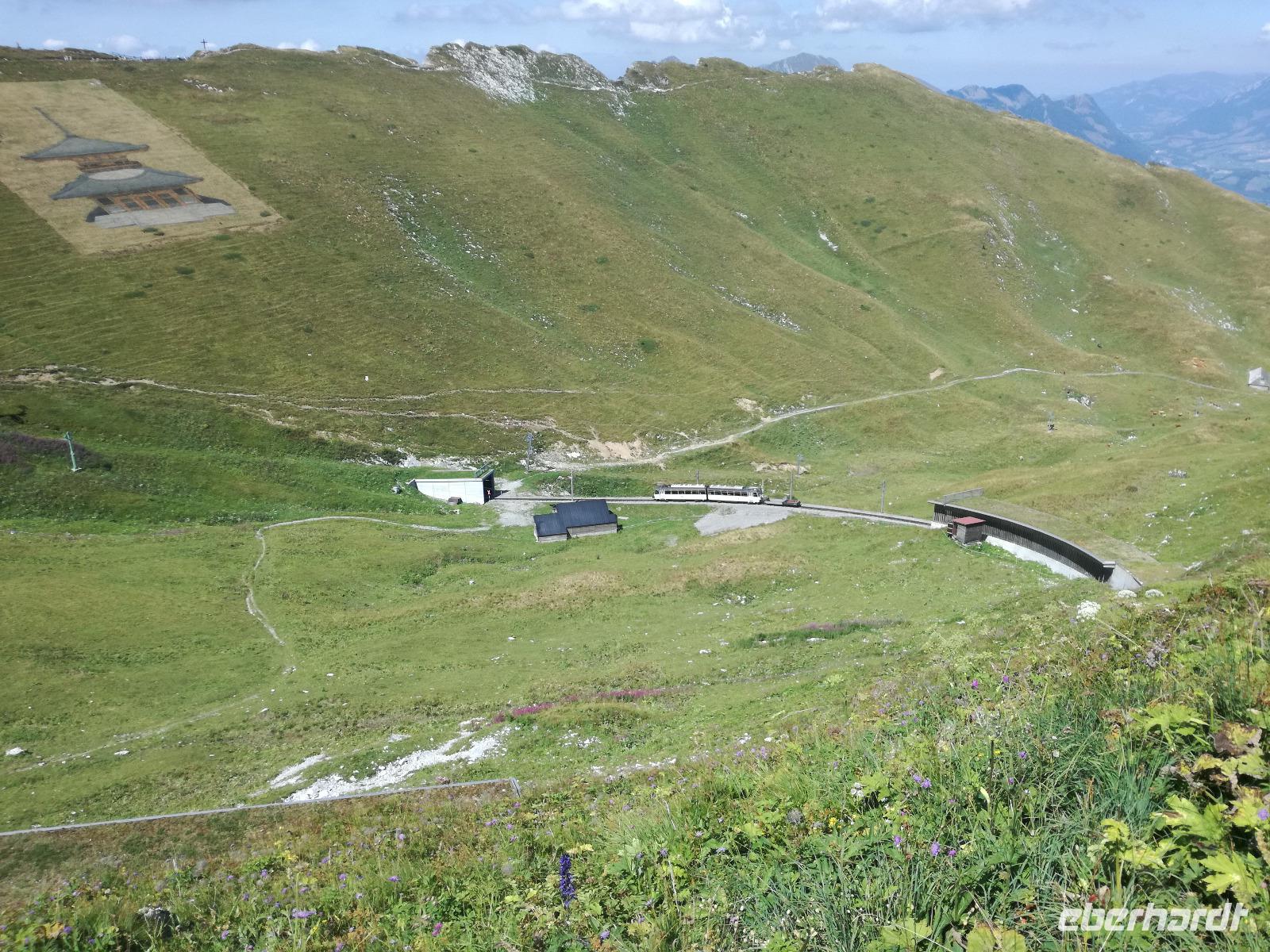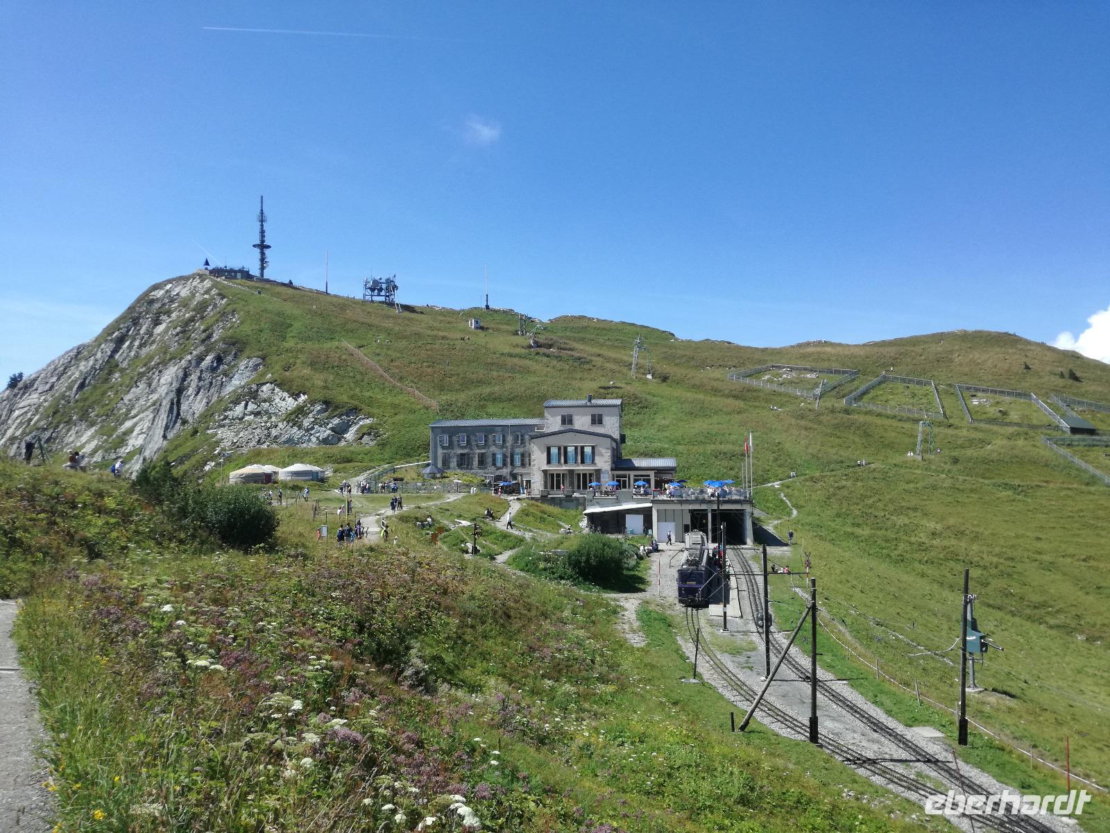 Für die nach dieser Führung beginnende Mittagspause ging es weiter nach Montreux. Dort blieb uns ein bisschen Zeit zum Flanieren am Seeufer, bevor wir mit einer historischen Zahnradbahn eine 40-minütigen Fahrt unternahmen. Es ging hoch zum Gipfel des Hausberges Montreux - die Rochers de Naye. Von den Rochers de Naye - bei 2.048 Meter Höhe - war der Blick auf dem Genfer See einfach herrlich! Zu besichtigen war oben auch noch ein alpiner, botanischer Garten und das „Marmotte-Paradies", sieben Gehege mit Murmeltiere aus der ganzen Welt. Allerdings waren diese an jenem Tag Menschenscheu und nur das europäische Murmeltier ließ sich kurz blicken.