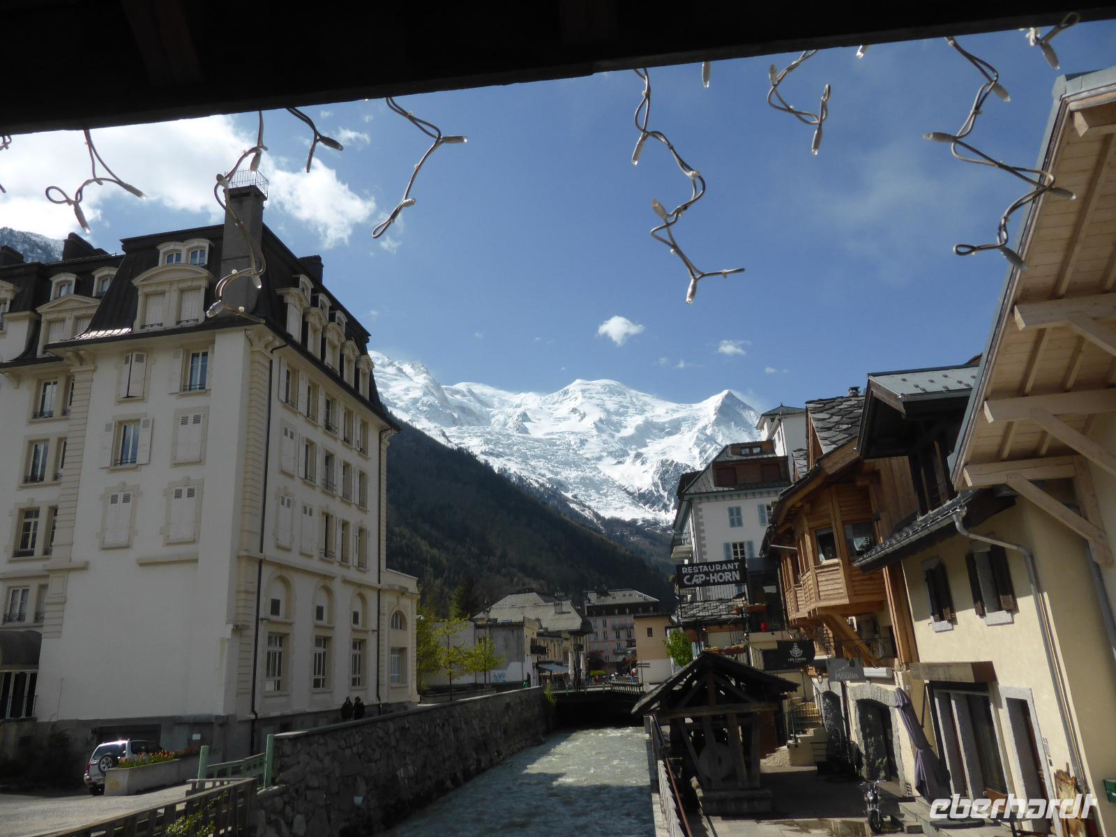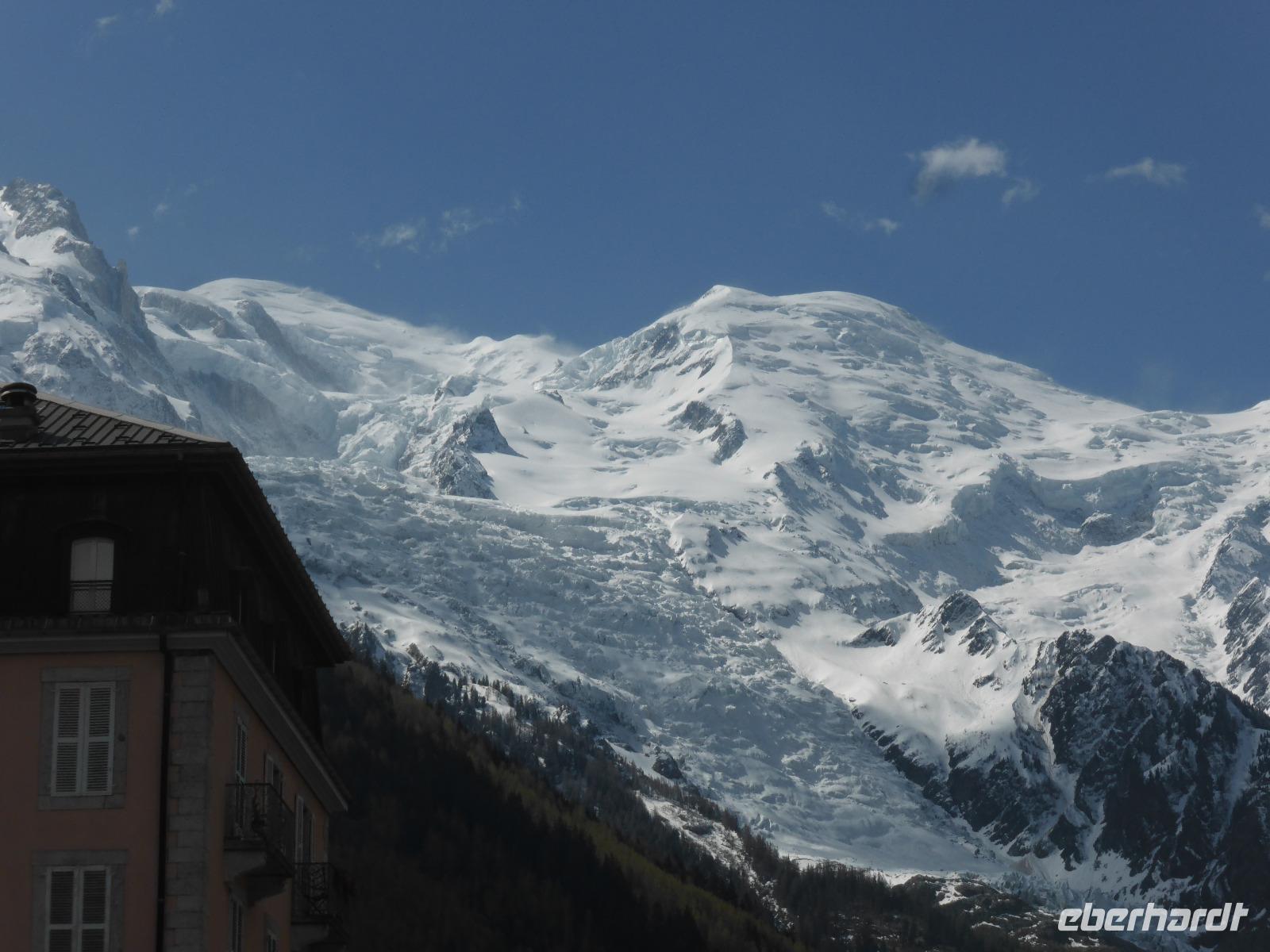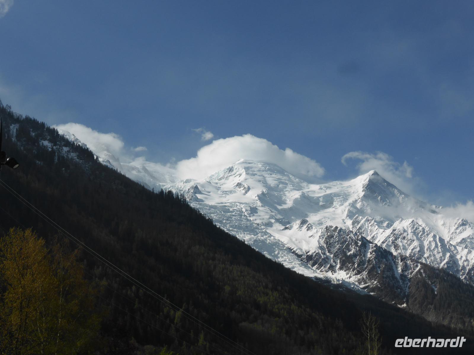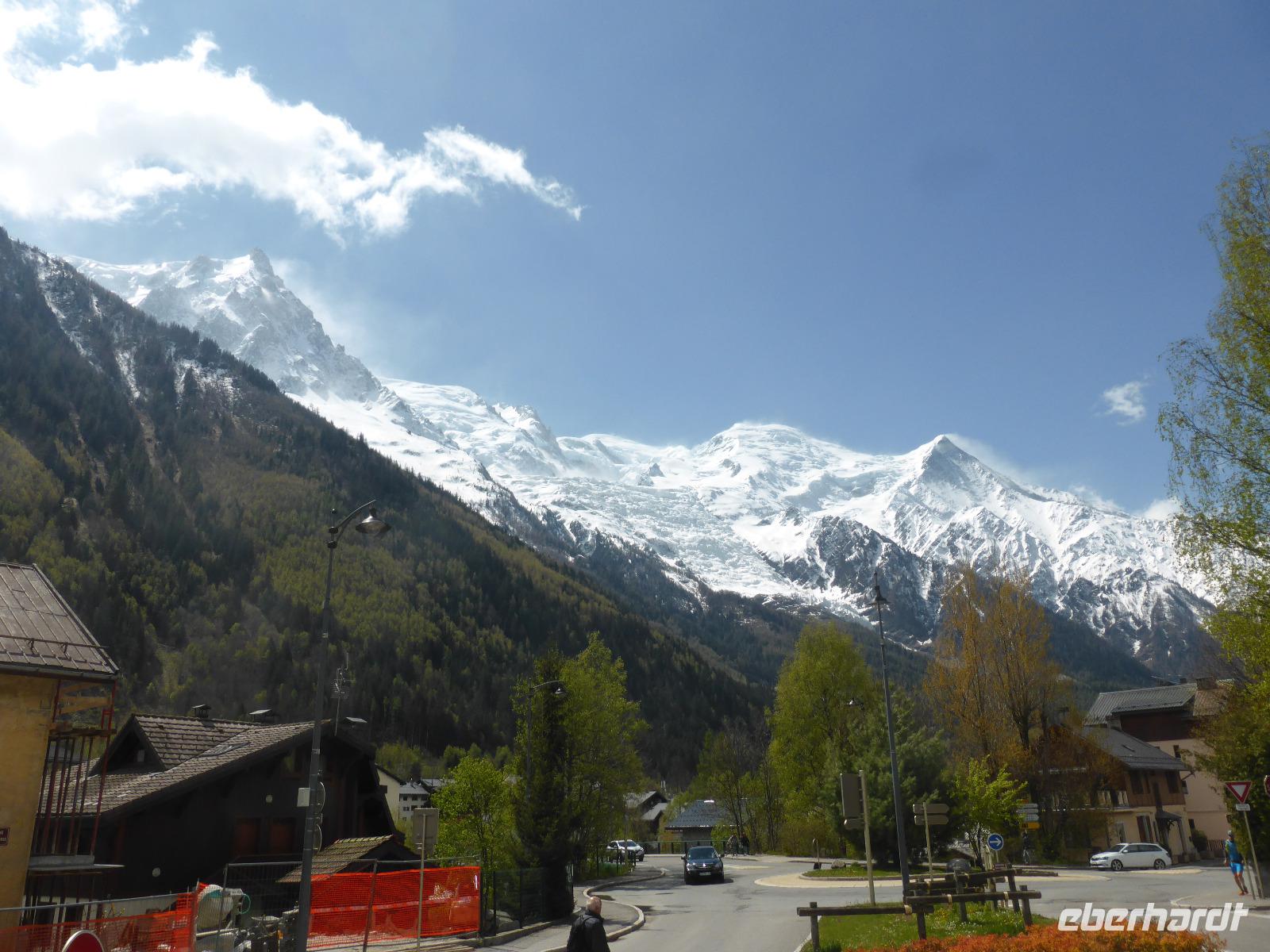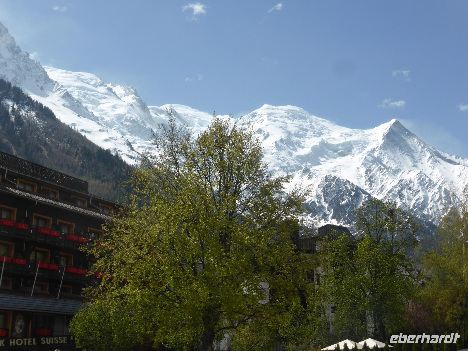 Der Blick zum Gletscher war frei. Auch die Seilbahn zur Grotte wurde noch geöffnet. Für einen Bummel in Chamonix blieb auch noch Zeit immer mit dem Blick zum imposanten Bergmassiv.