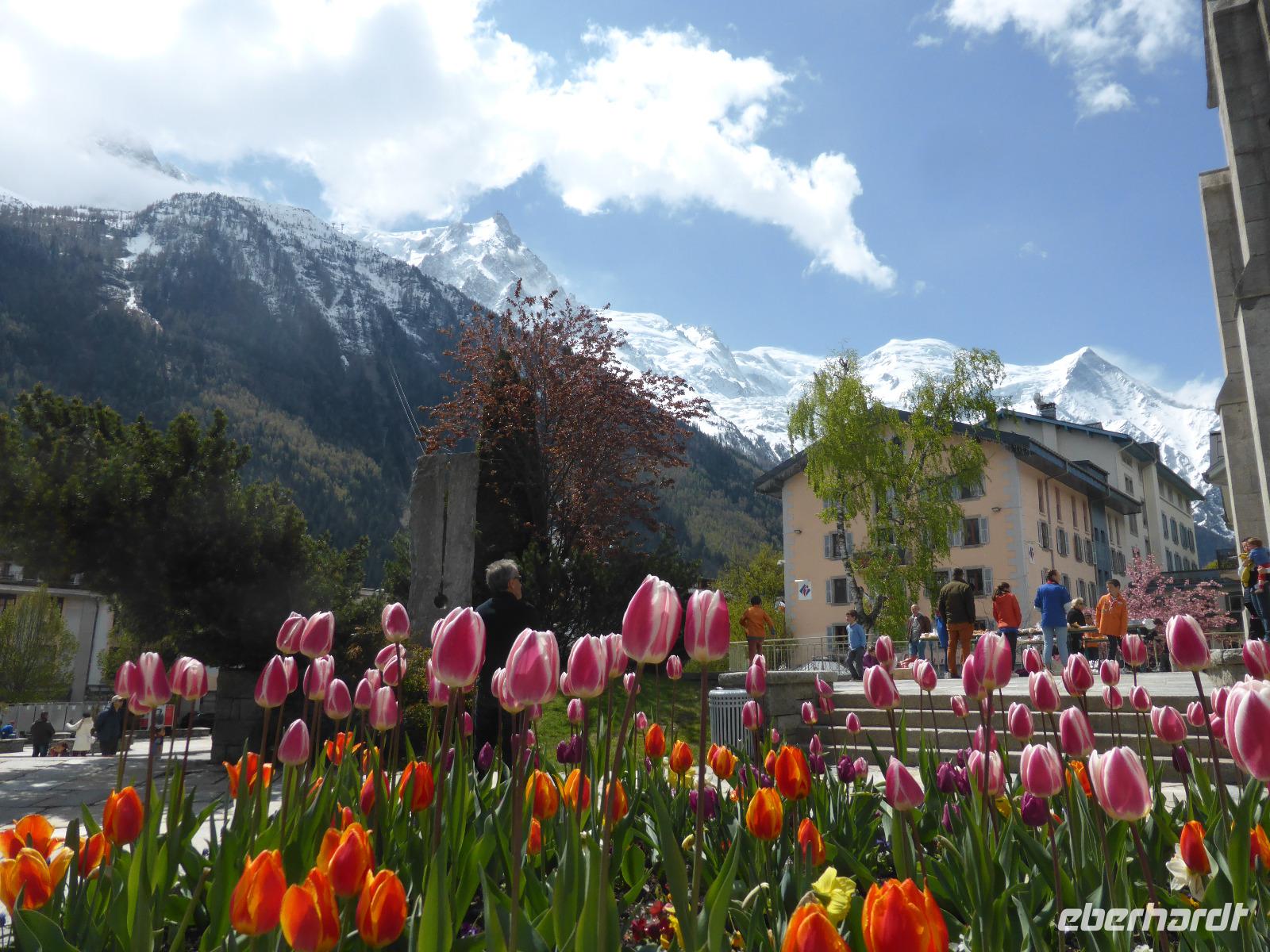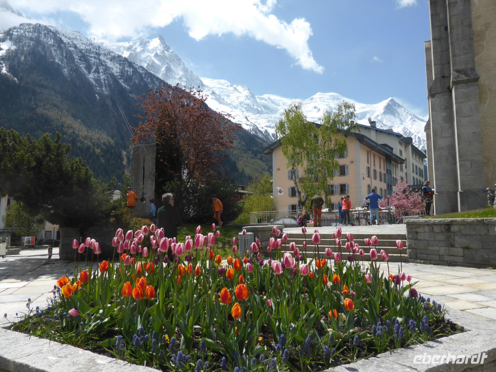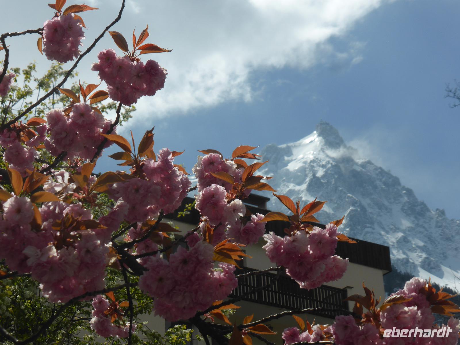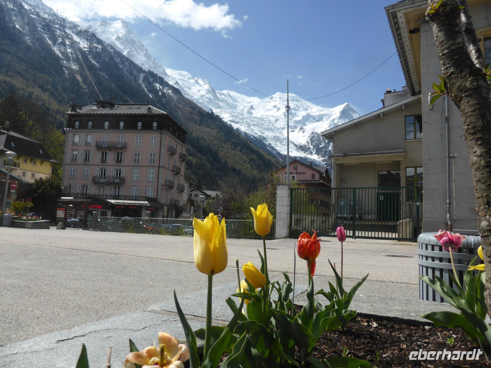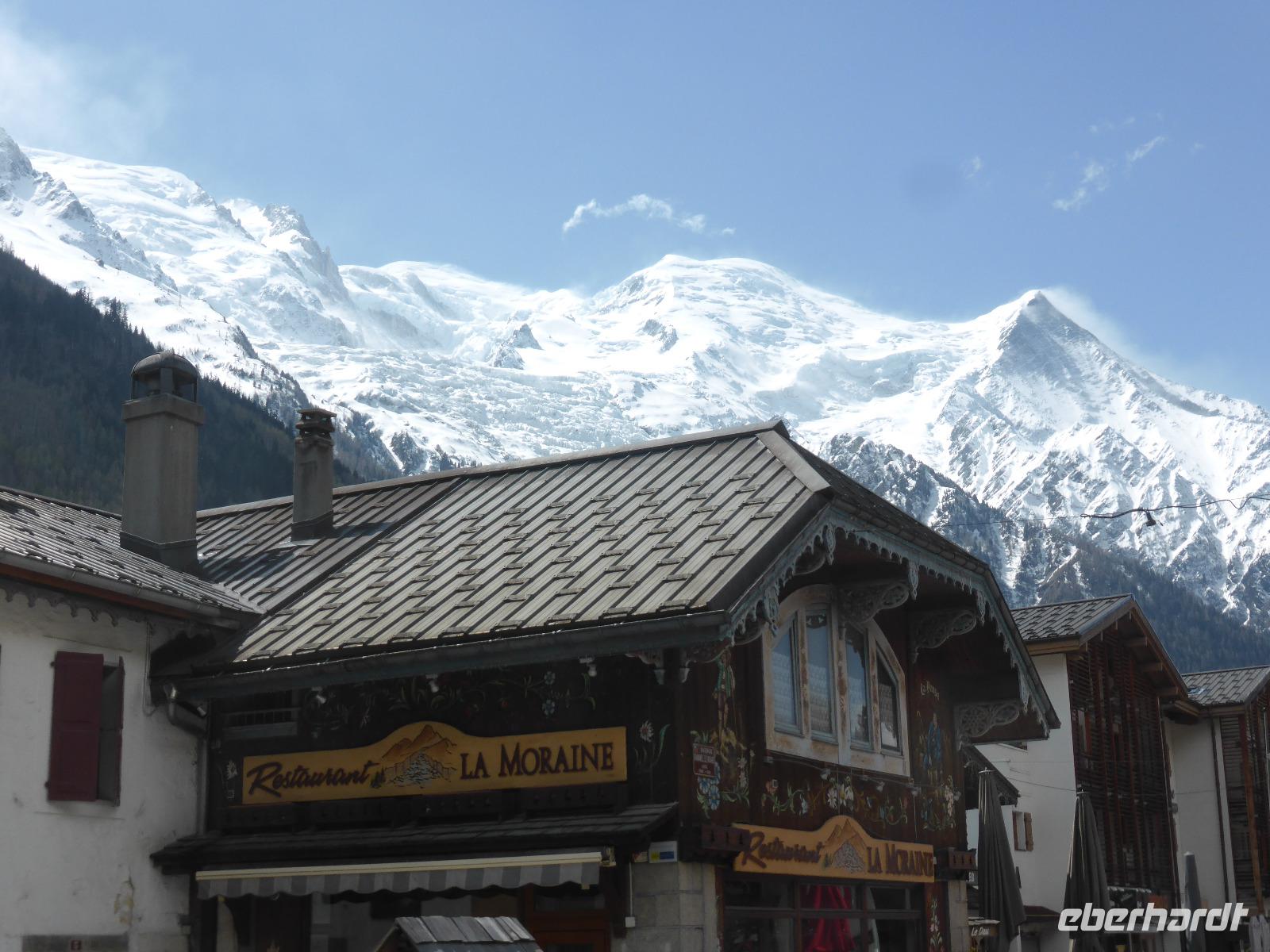 Der Blick zum Gletscher war frei. Auch die Seilbahn zur Grotte wurde noch geöffnet. Für einen Bummel in Chamonix blieb auch noch Zeit immer mit dem Blick zum imposanten Bergmassiv.
