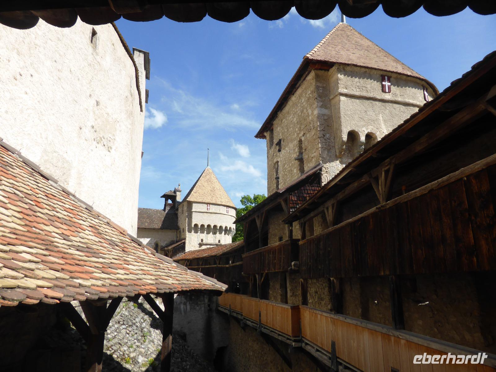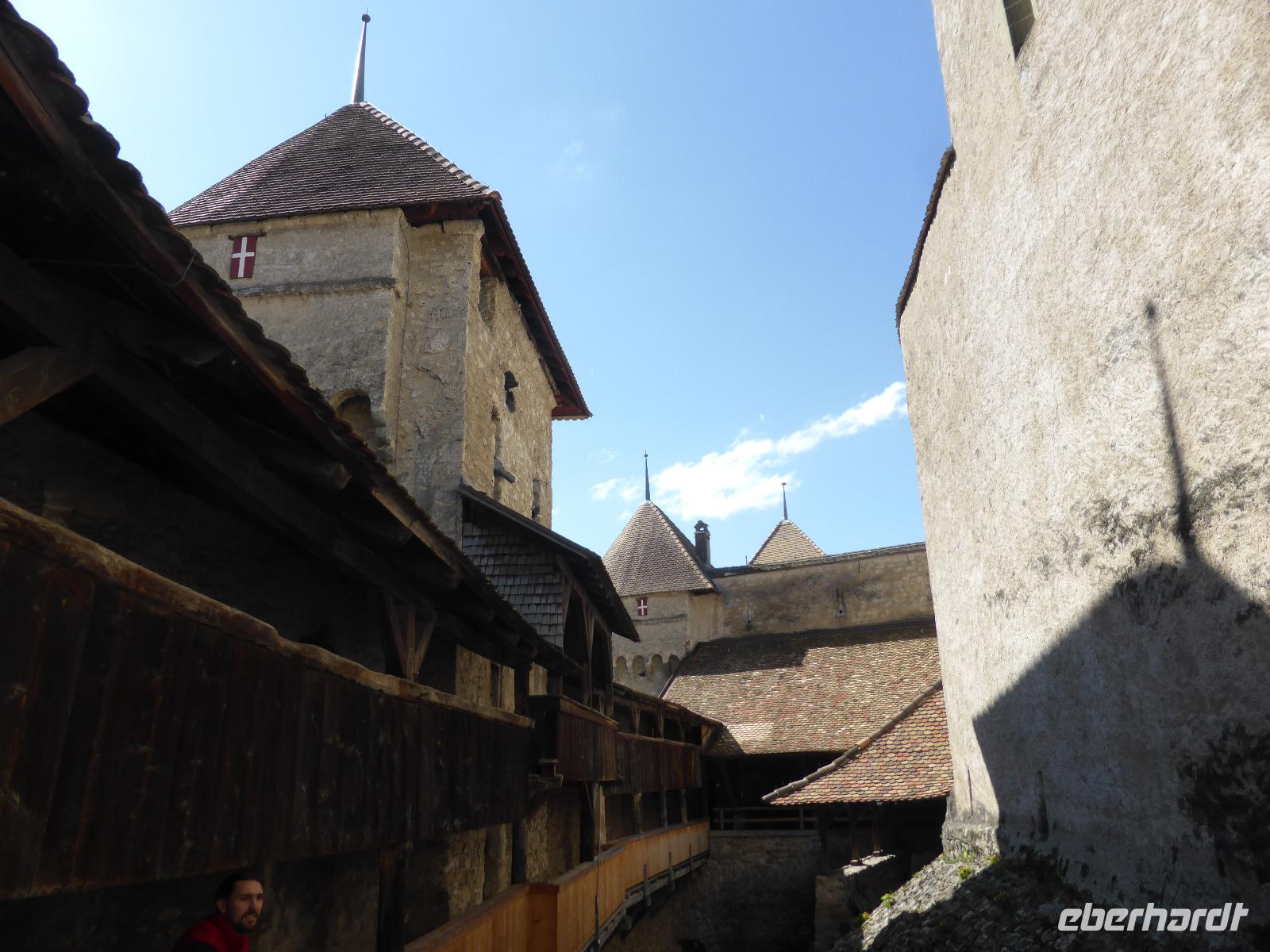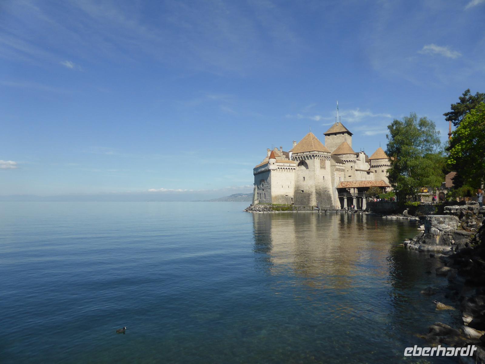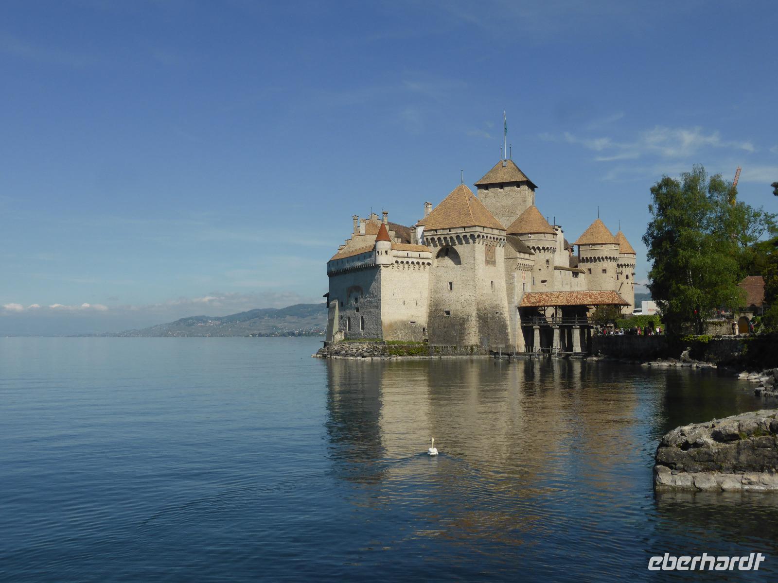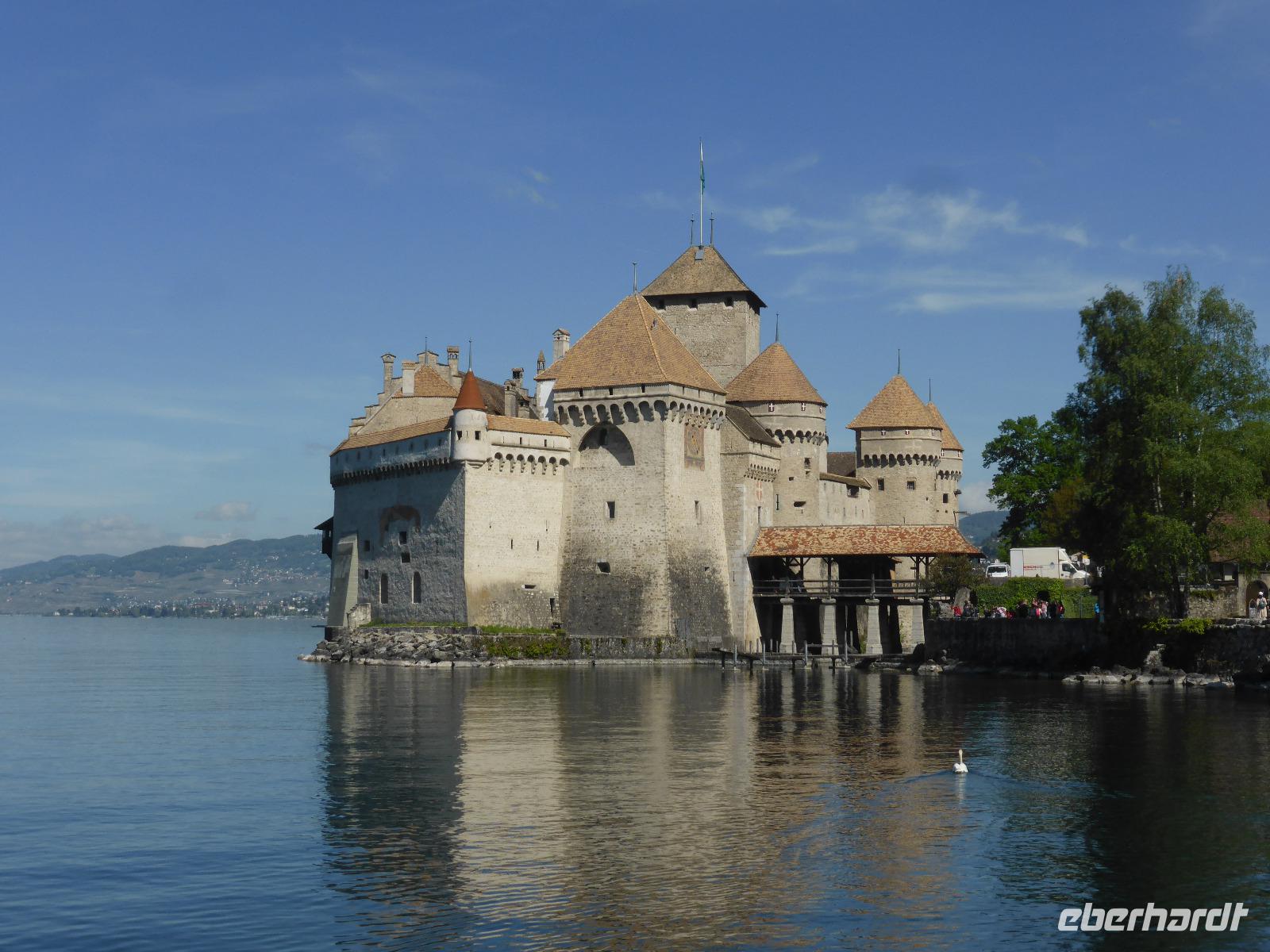 Unser heutiger Tagesauflug führte uns bei blauem Himmel und viel Wind zum Schloss Chillon. Mit den Audioguides konnten wir das Schloss genau besichtigen. Kein Schloss der Schweiz wird öfters beschrieben und besucht als diese imposante Anlage auf einer vorgelagerten Insel im Genfer See. Dieses Schloss gehört zu den 20 Schlössern der Savoyer Herzöge und wurde bekannt durch die Ballade „Der Gefangene von Chillon" von Lord Byron. Bei diesem Gefangenen handelt es sich um einen Prior namens Bonivard, der als Befürworter der Reformation den Zorn der Savoyer Herzöge auf sich zog und gefangen genommen wurde.