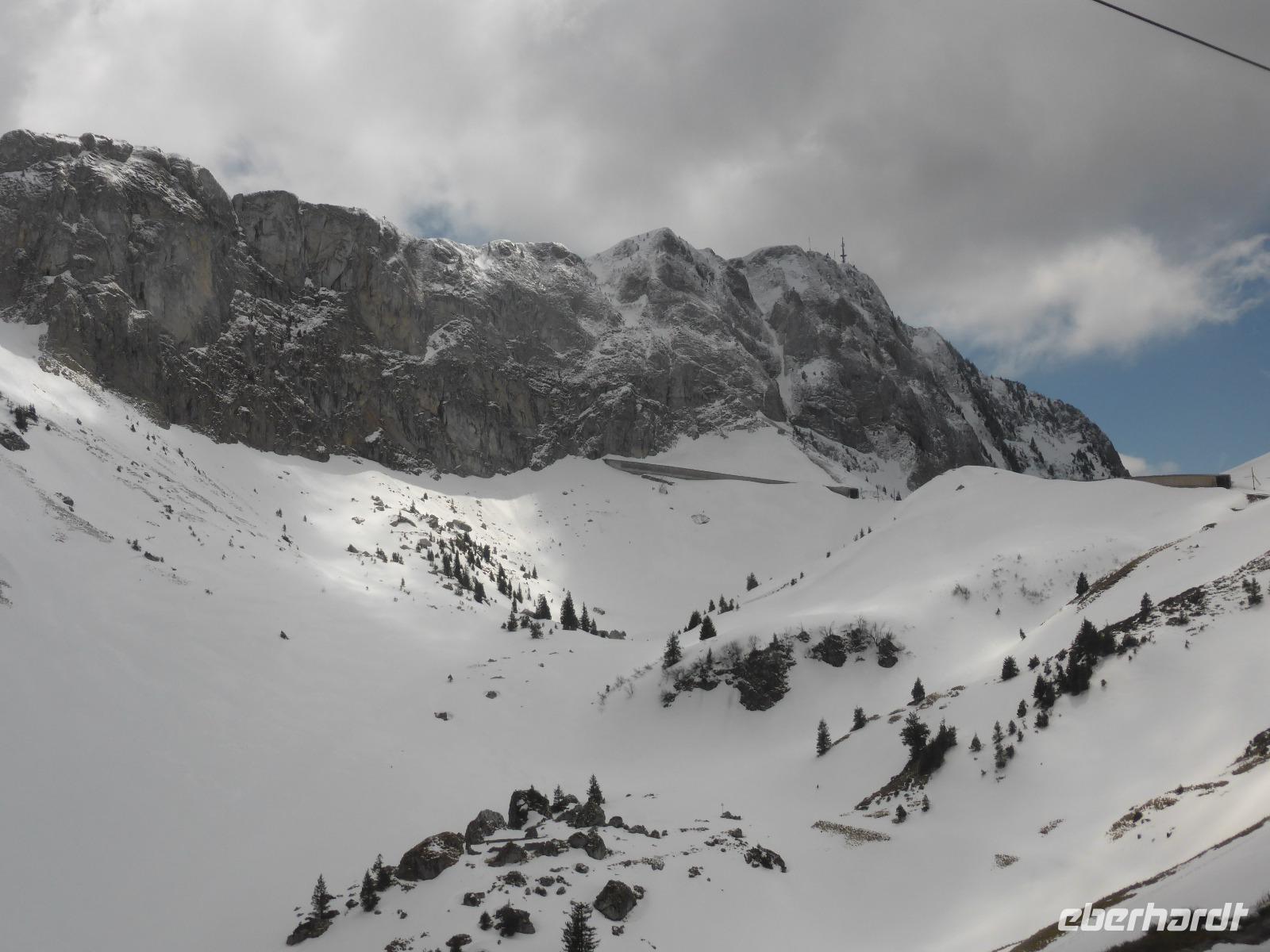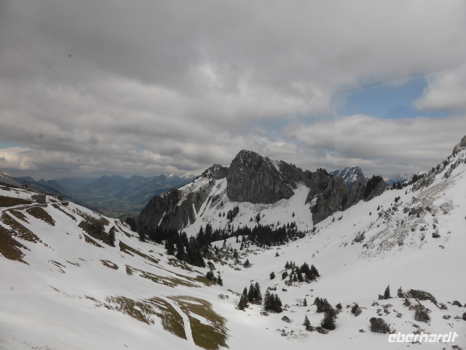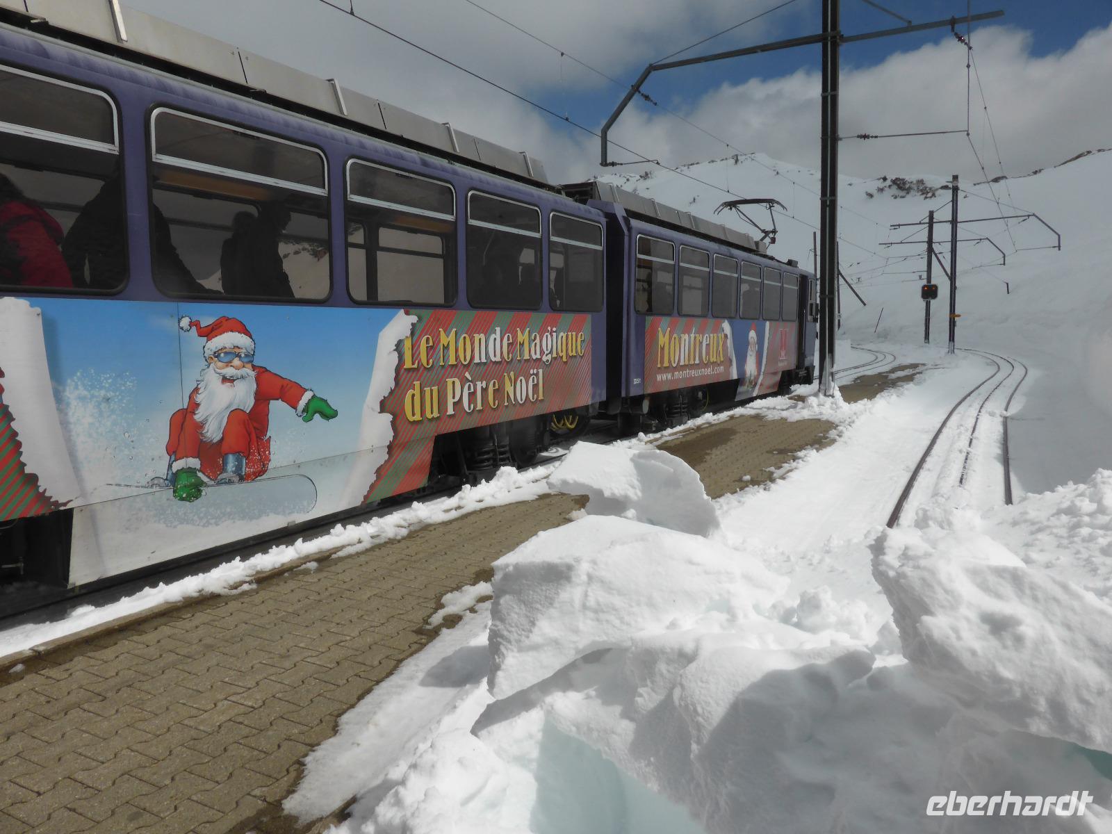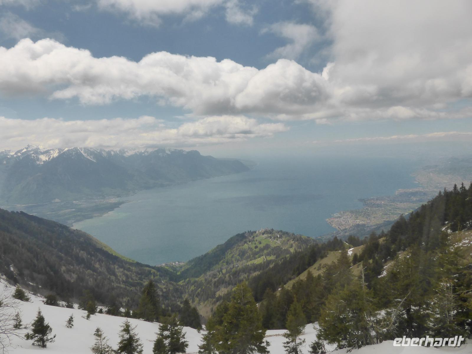 Unsere Mittagspause verbrachten wir im meistbesuchten Kurort am Genfer See, in Montreux. Noch 1830 war Montreux ein kleines Winzerdorf, das durch einen Roman von Jean - Jacques Rousseau erst bekannt wurde und heute zu einer internationalen Musikstadt gehört. Nach unserem Aufenthalt fuhren wir mit der Zahnradbahn 10.5 km hinauf auf den Rochers des Nayes. Der Hausberg von Montreux ist bekannt für sein 360 ° Panorama, das uns heute zwar nicht verwehrt blieb, aber der Wind und der Schnee machten es unmöglich sich draußen länger aufzuhalten. Aufgrund des Windes entschlossen wir einen Zug eher zurückzufahren. Nach der Rückfahrt kehrten wir mit dem Bus an unser Hotel zurück.