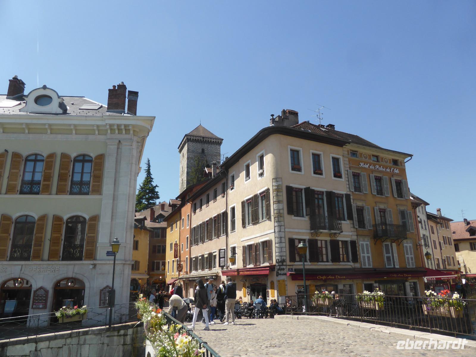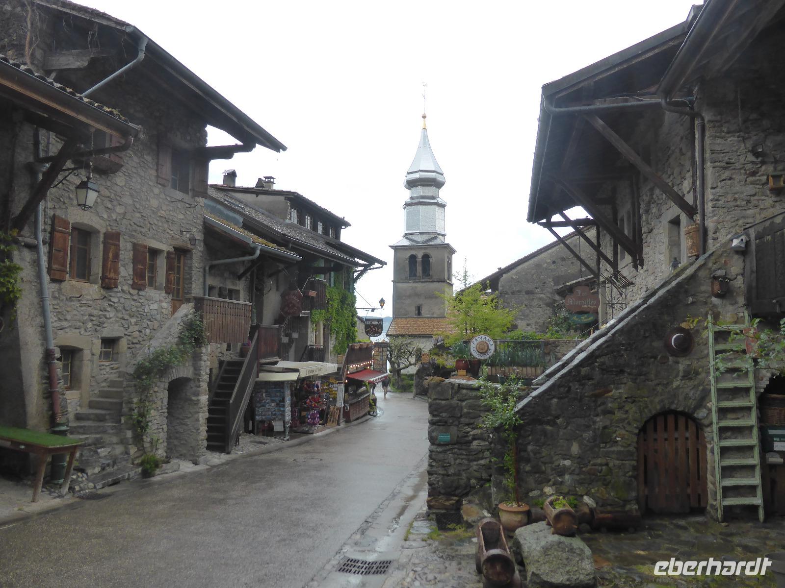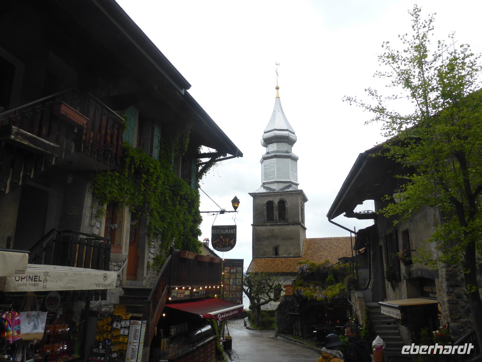 Entlang des Südufers erreichten wir eines der schönsten Dörfer Frankreichs - Yvoire. Sie liegt auf einem Landvorsprung, der den „kleinen" vom „großen" See trennt. Yvoire wurde im 14. Jh. auf den Resten einer Festung neu aufgebaut. Der Charme vergangener Zeiten liegt noch immer über dem malerischen Dörfchen. Die engen Gassen mit den blumengeschmückten Hausfassaden luden zu einem Bummel ein. Der blaue Himmel ließ diesen Aufenthalt zu einem besonderen Erlebnis werden.