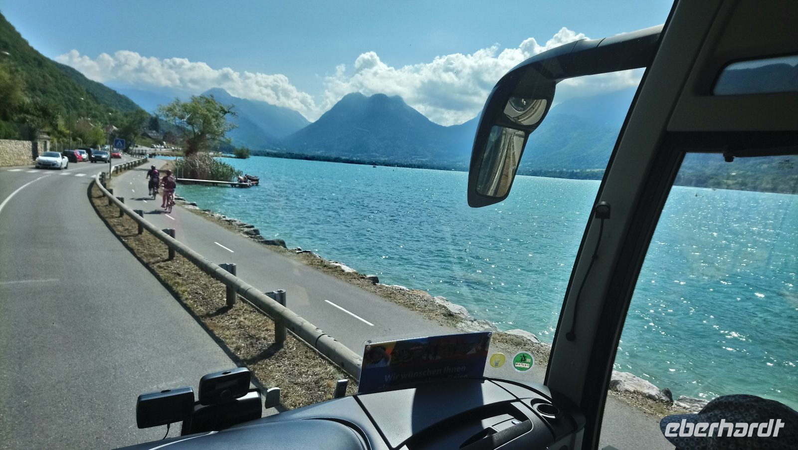 Über die von hundertjährigen Platanen gesäumte Avenue d´Albingy verließen wir die Stadt, um am Ostufer des Sees unsere Wanderer in Talloires wieder aufzunehmen. Bei der Rundfahrt um den etwa 17 km langen See hatten wir wunderbare Aussichten auf See und Berge im Hintergrund.