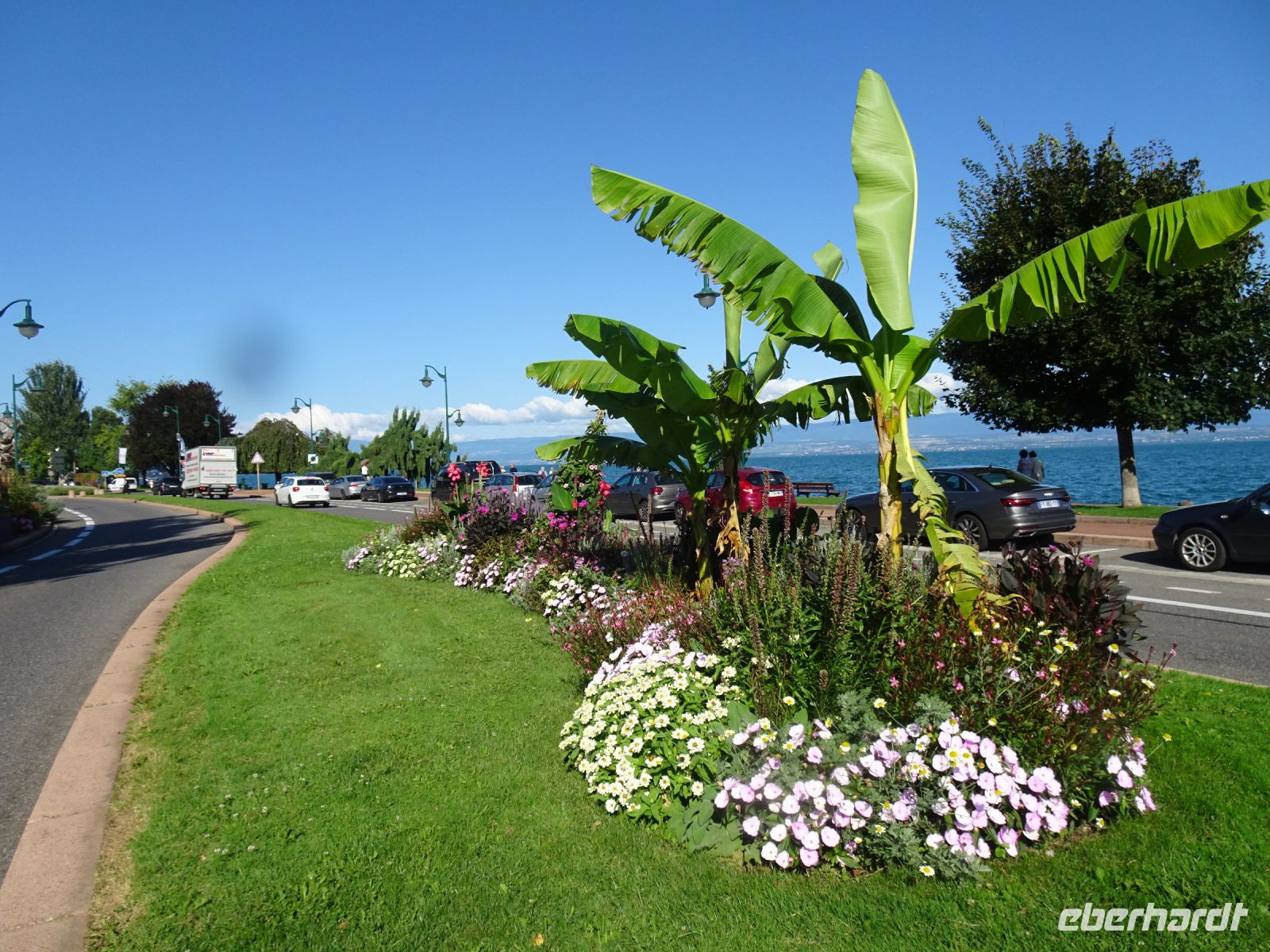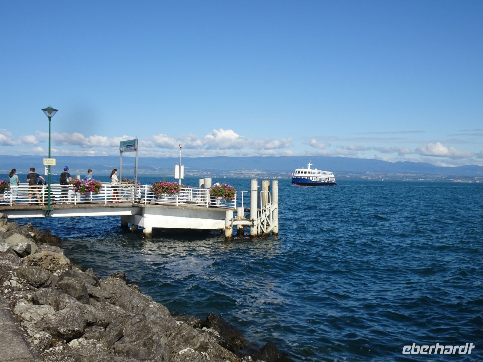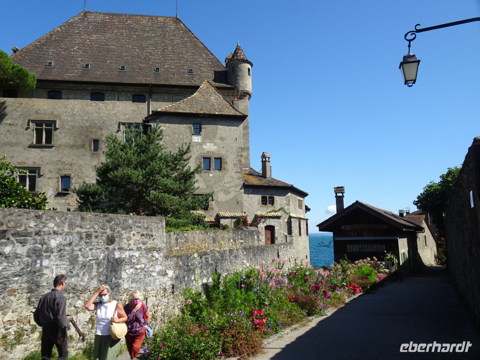 Wir waren begeistert von den alten Gassen und dem Blick auf das Schloss, wo die Savoyer residierten. Die Kirche mit dem eigenwillig gedeckten Zwiebelturm und der davorliegende Lindenplatz strahlen Flair aus. Eisstände und Andenkengeschäfte wurden rege genutzt. Selbstverständlich freuten wir uns auch an dem überbordenden Blumenschmuck, der dem Ort schon viele Auszeichnungen gebracht hat. Einige folgten der Empfehlung unseres Reiseleiters und wanderten zur Schiffsanlegestelle auf der Halbinsel Leman. Ein wunderbarer Blick über den See war der Lohn.