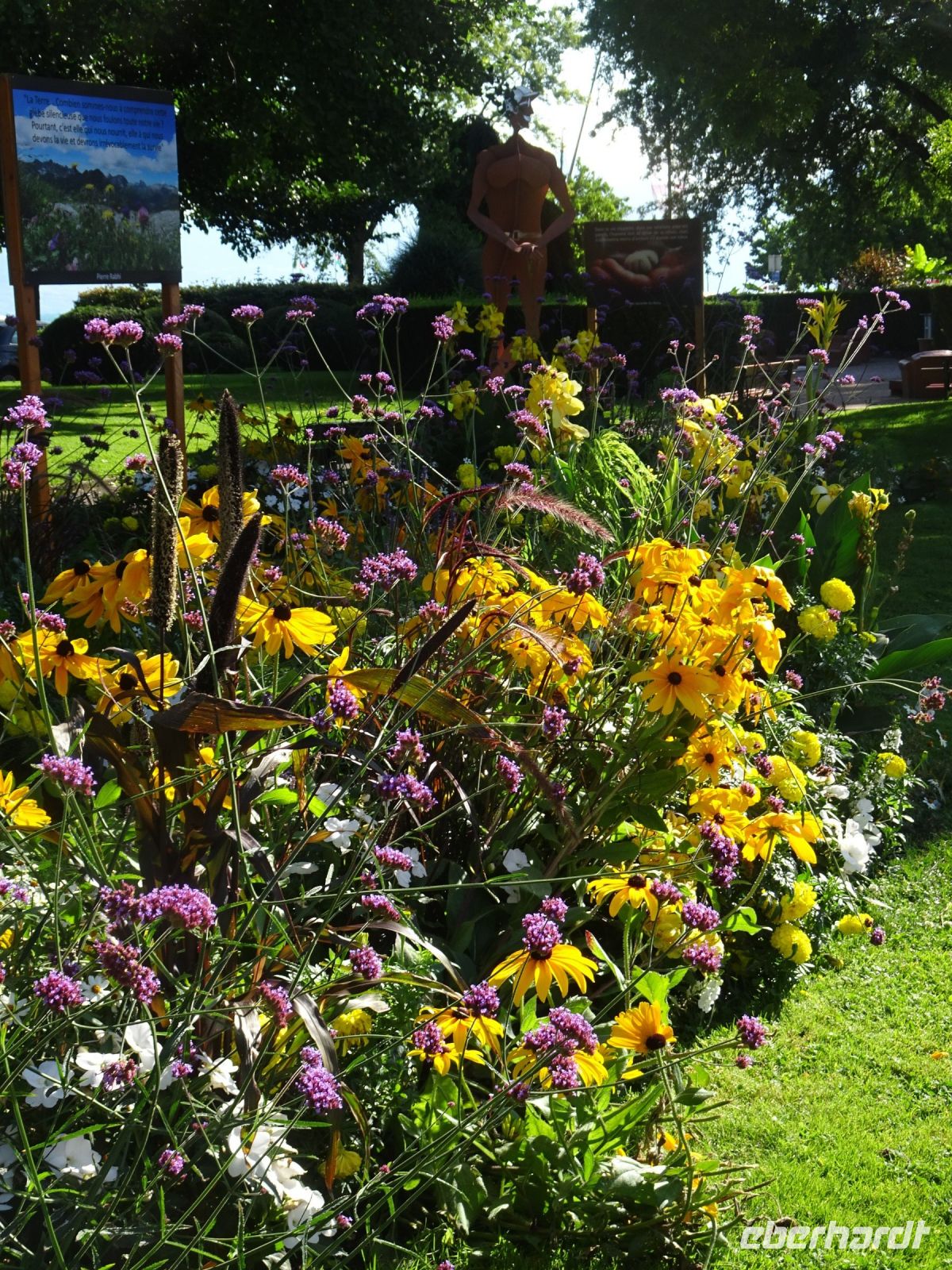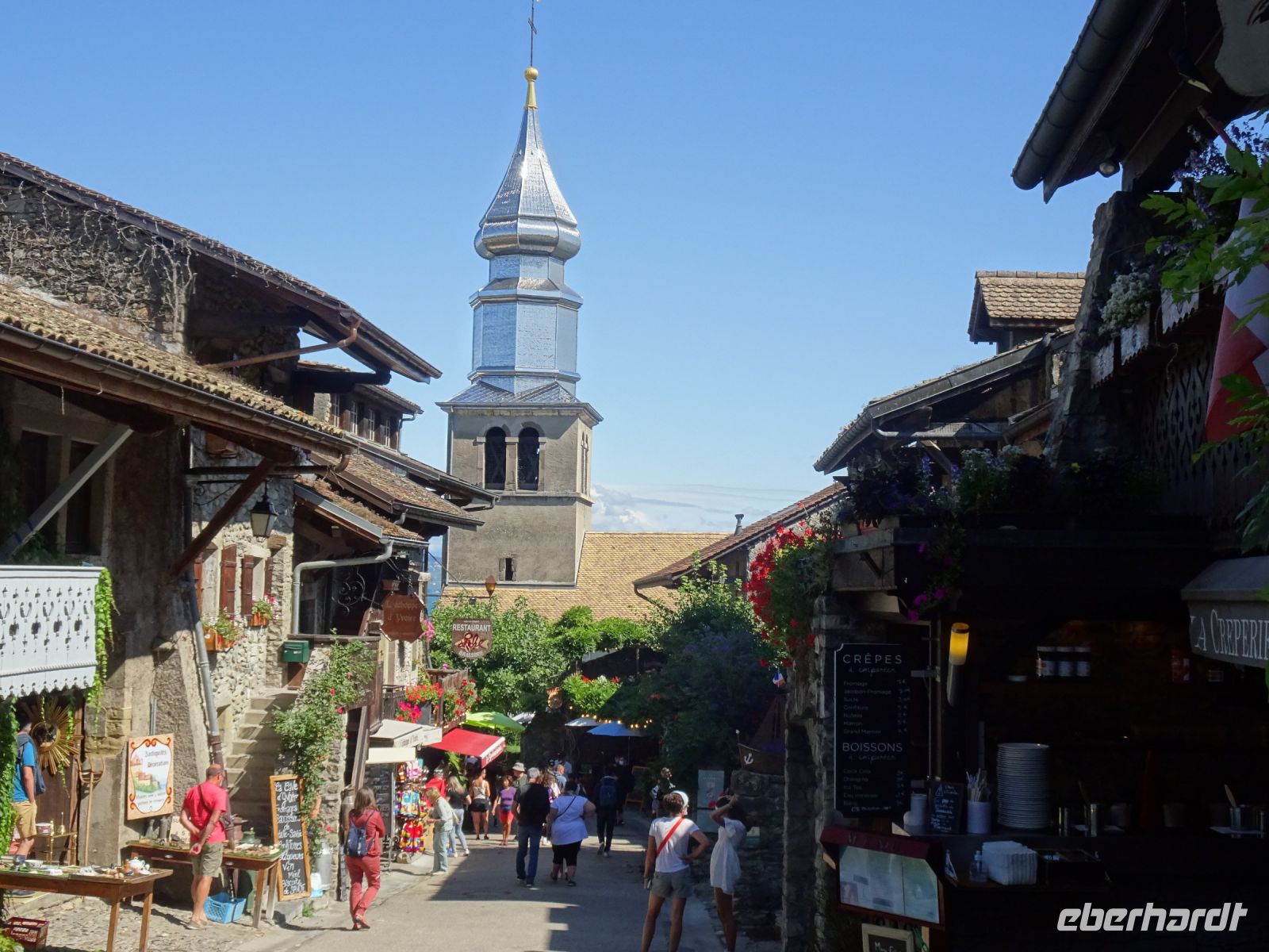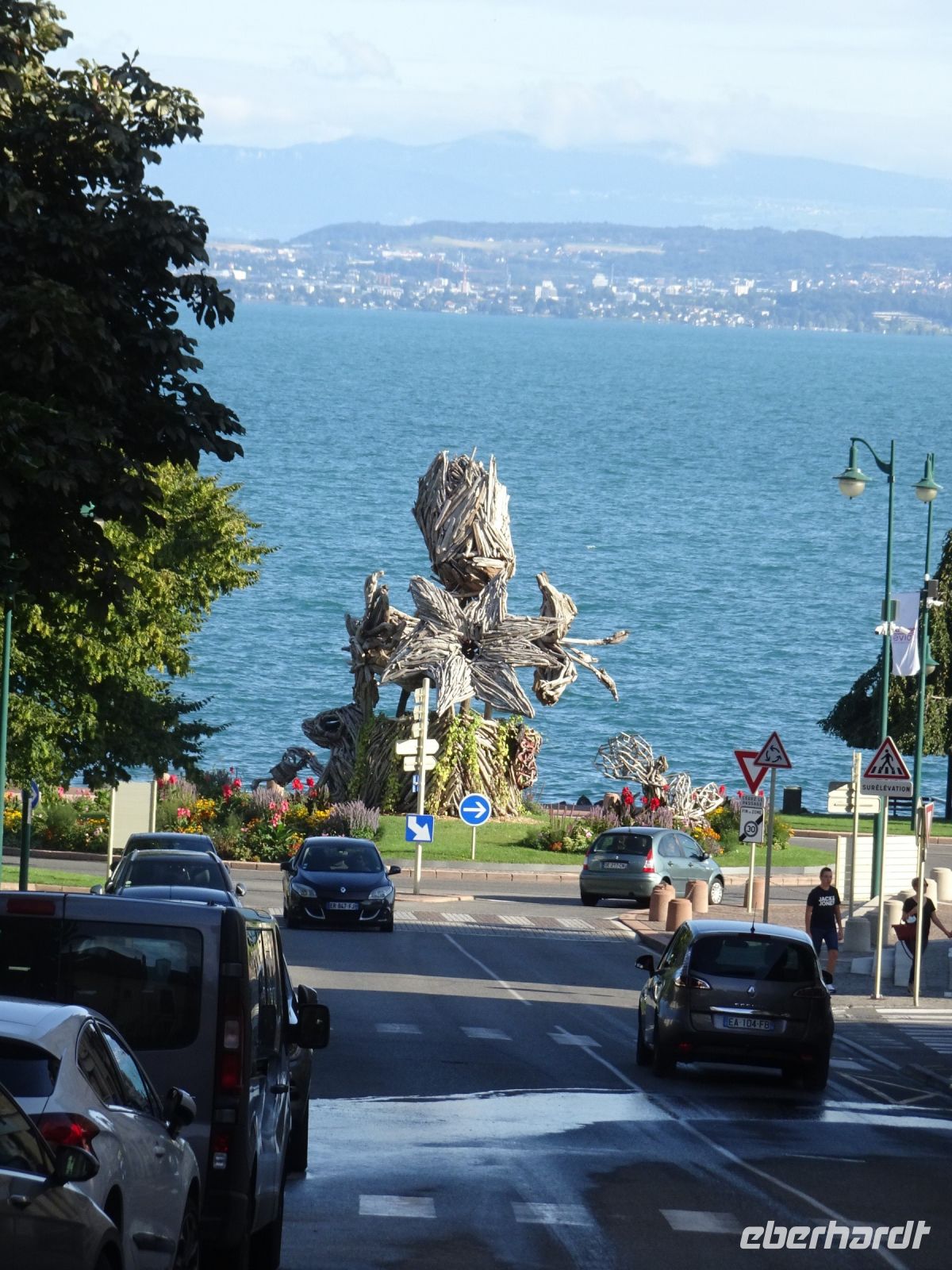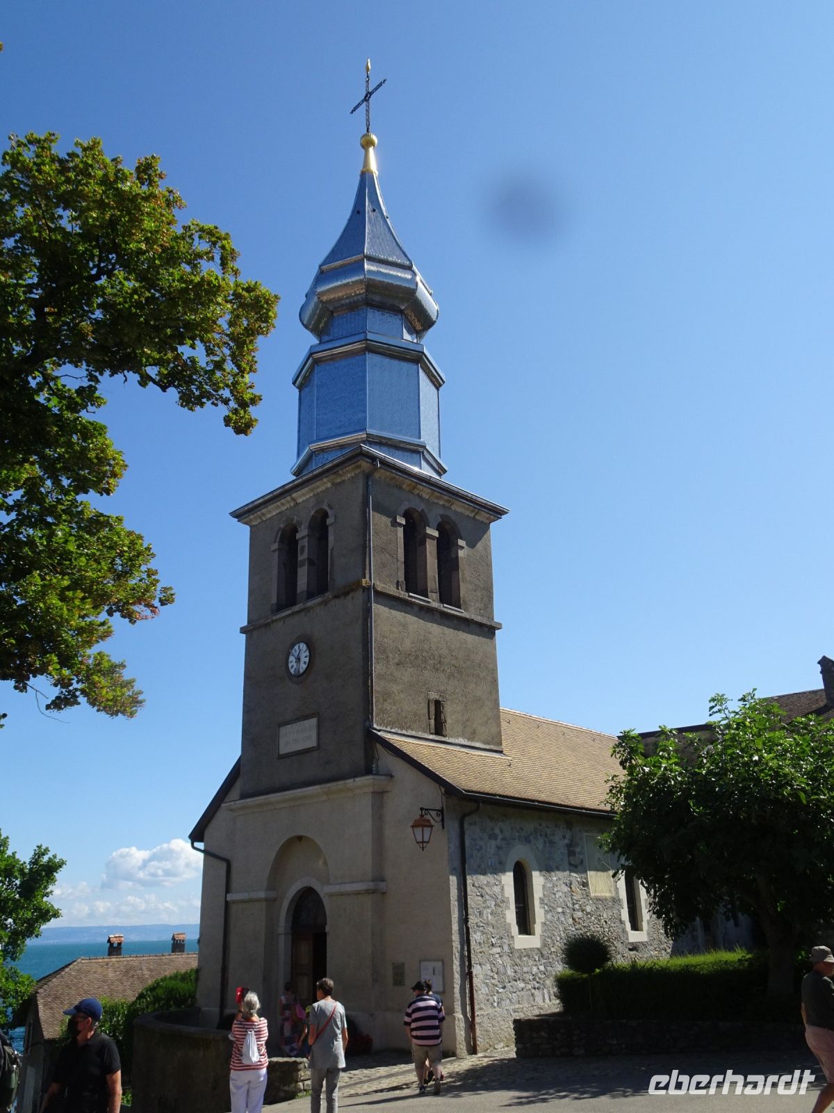 Wir waren begeistert von den alten Gassen und dem Blick auf das Schloss, wo die Savoyer residierten. Die Kirche mit dem eigenwillig gedeckten Zwiebelturm und der davorliegende Lindenplatz strahlen Flair aus. Eisstände und Andenkengeschäfte wurden rege genutzt. Selbstverständlich freuten wir uns auch an dem überbordenden Blumenschmuck, der dem Ort schon viele Auszeichnungen gebracht hat. Einige folgten der Empfehlung unseres Reiseleiters und wanderten zur Schiffsanlegestelle auf der Halbinsel Leman. Ein wunderbarer Blick über den See war der Lohn.