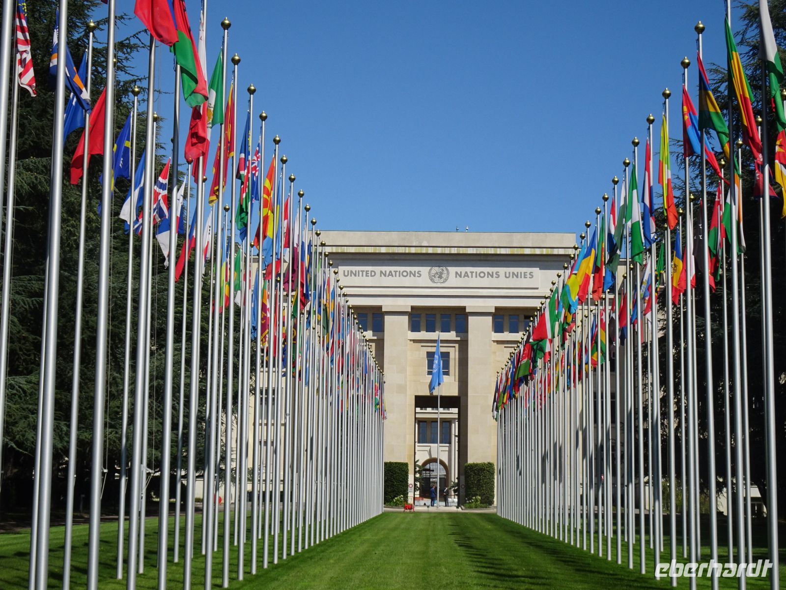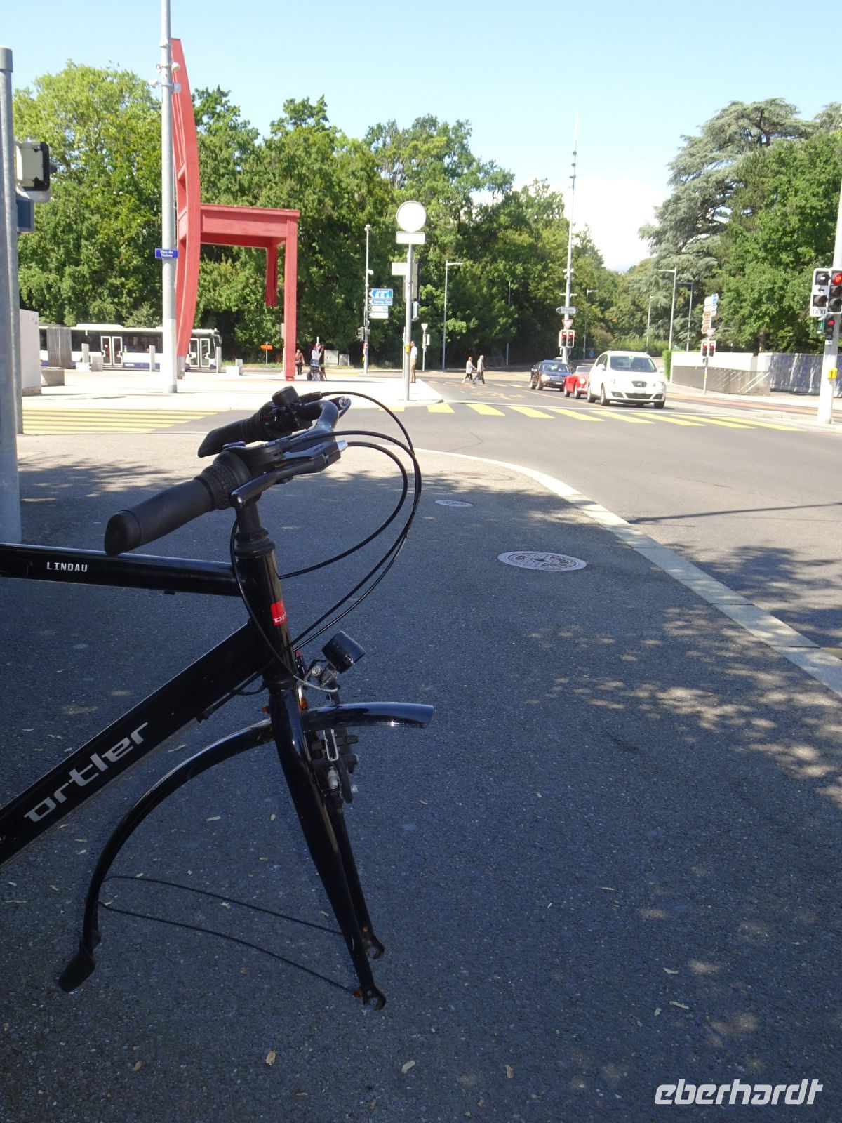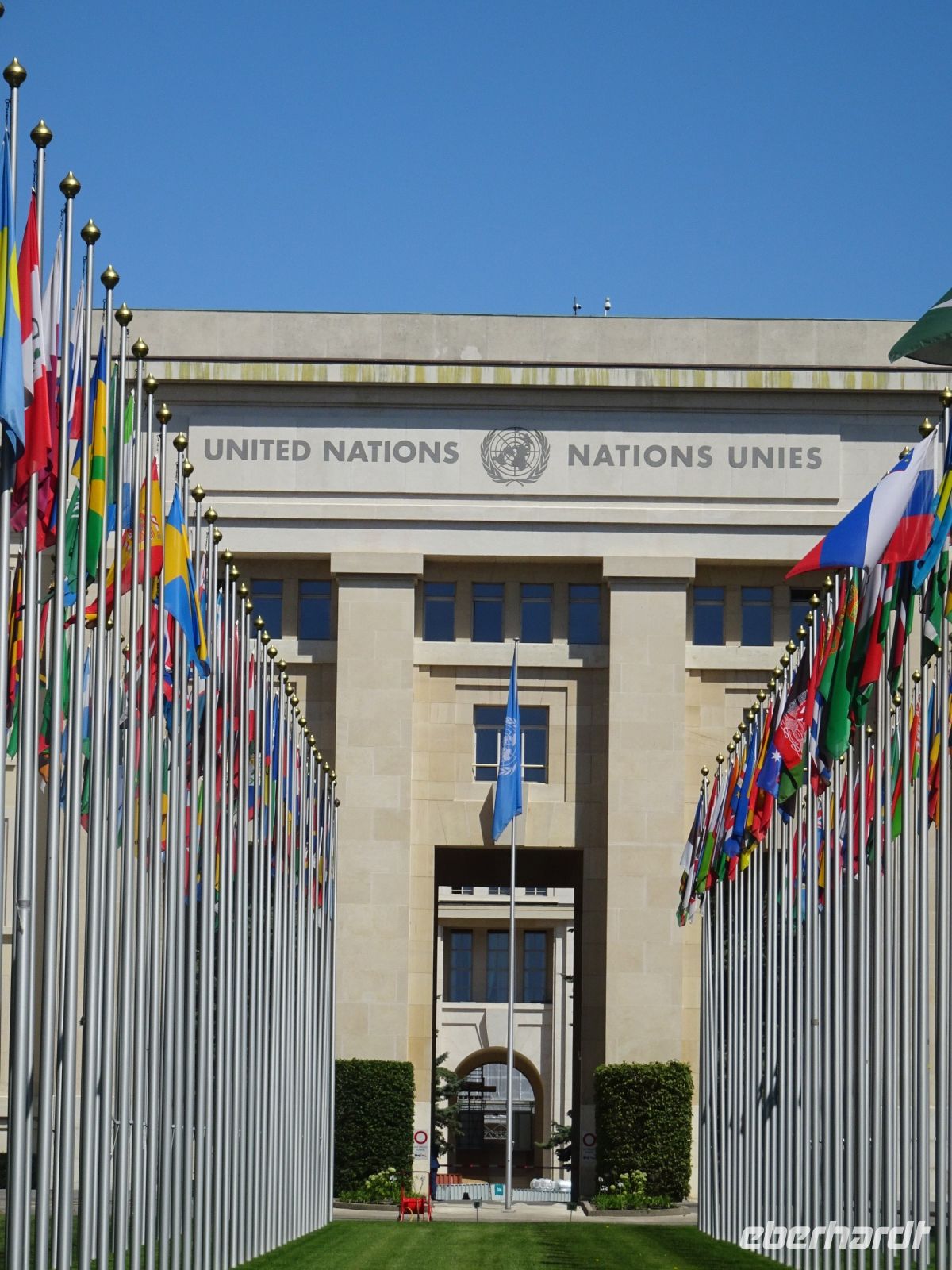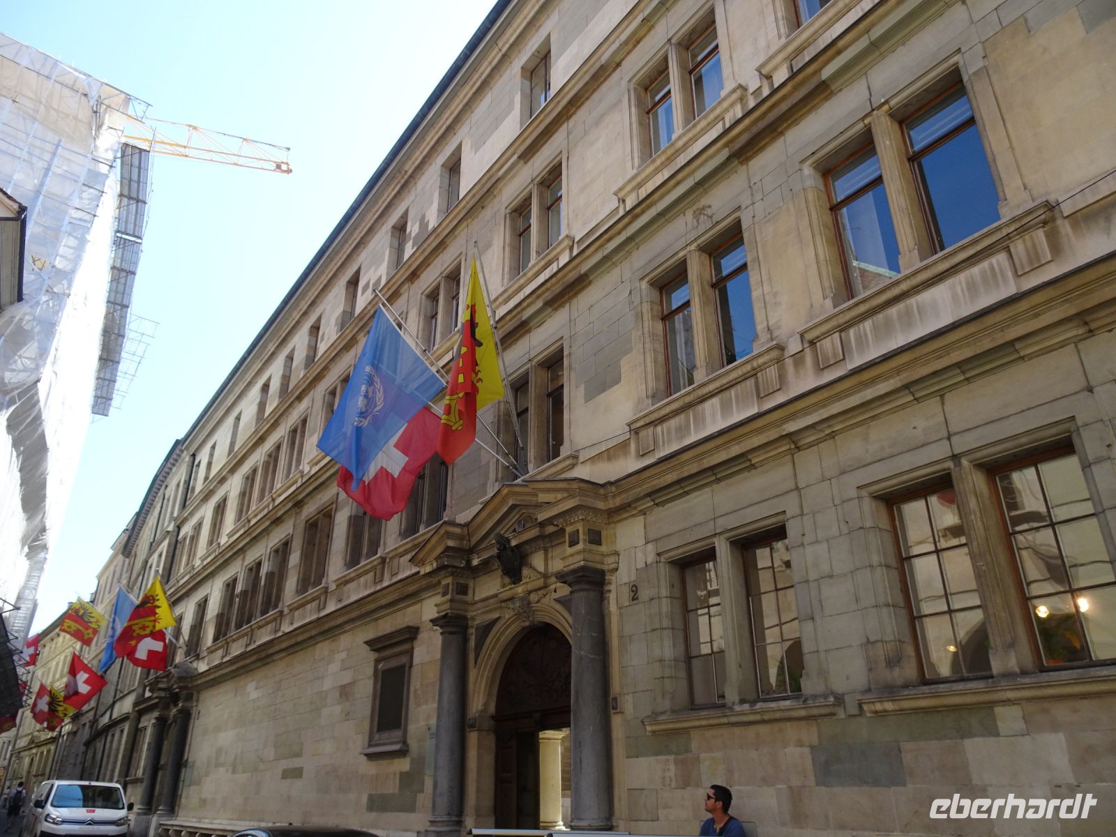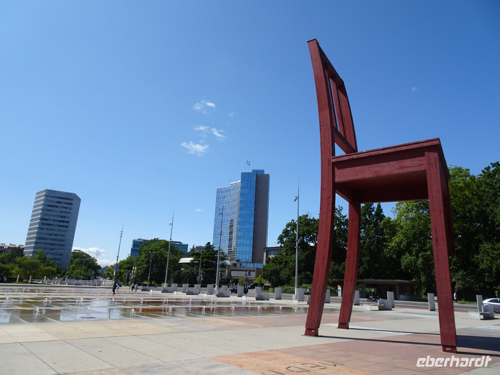 Die übrigen Reisegäste setzten ihre Fahrt nach Genf fort. Nachdem wir durch einen Tunnel Genf erreicht hatten, begrüßte uns die 140 Meter hohe Wasserfontäne Jet ´d Eau. Wir hatten Glück, denn wenig später wurde diese auf Grund heftiger Stürme abgestellt. Danach gab es eine Fahrt durch das UNO Viertel. Am Platz der Nationen konnten wir für einen Fotostopp halten und uns das Denkmal des „Gebrochenen Stuhls“ ansehen. Dies soll als Mahnmal gegen den Einsatz von Landminen dienen. Auch das Gebäude – Palast der Nationen – als Sitz der UNO in Europa sowie weitere umliegende UNO-Organisationen bestaunten wir. Weiter ging es zum Museum des Roten Kreuzes und des Roten Halbmondes. Der Zufall brachte uns auch am Gebäude der WHO vorbei, wo Bauarbeiten für eine Erweiterung erfolgen.