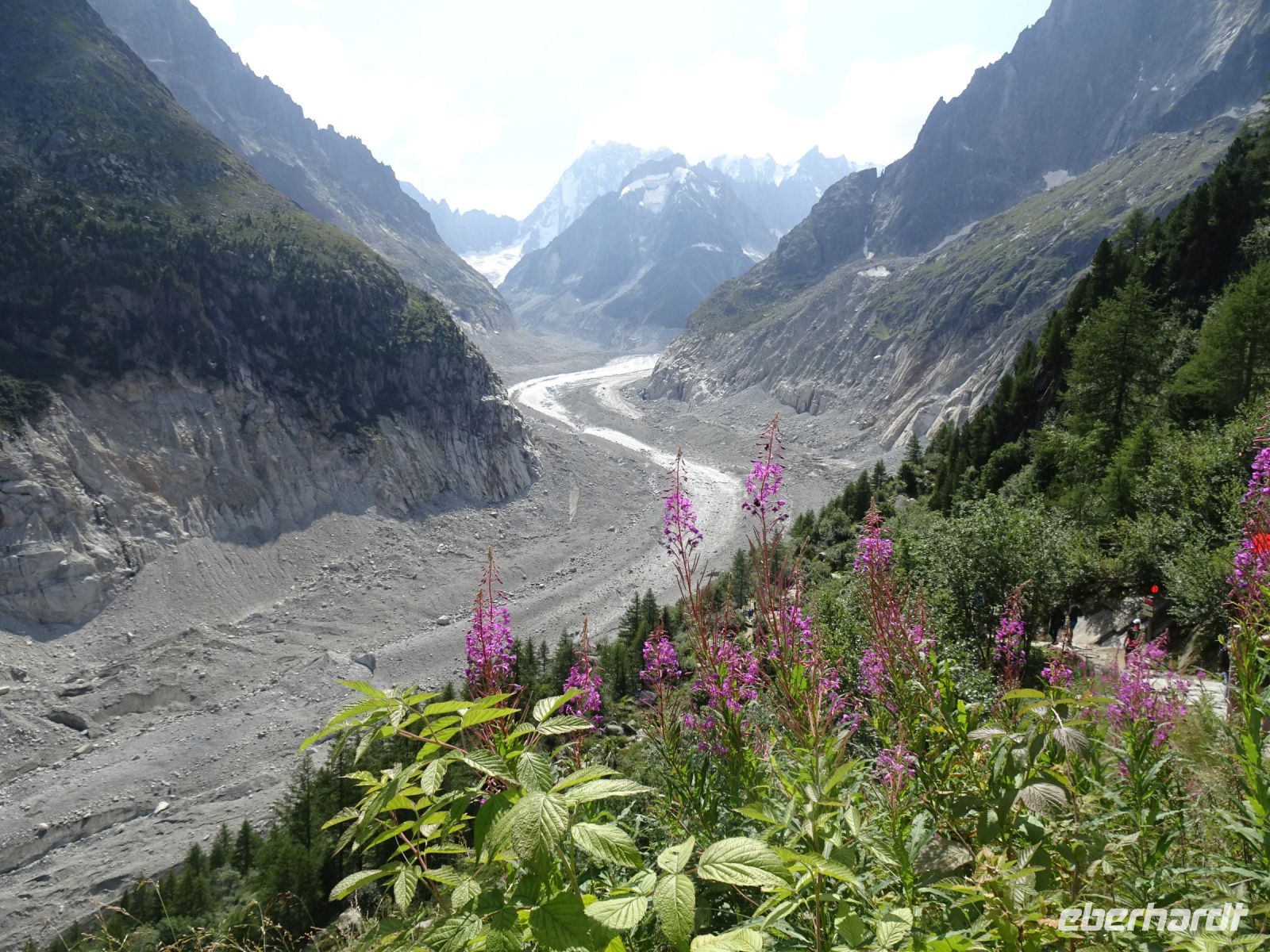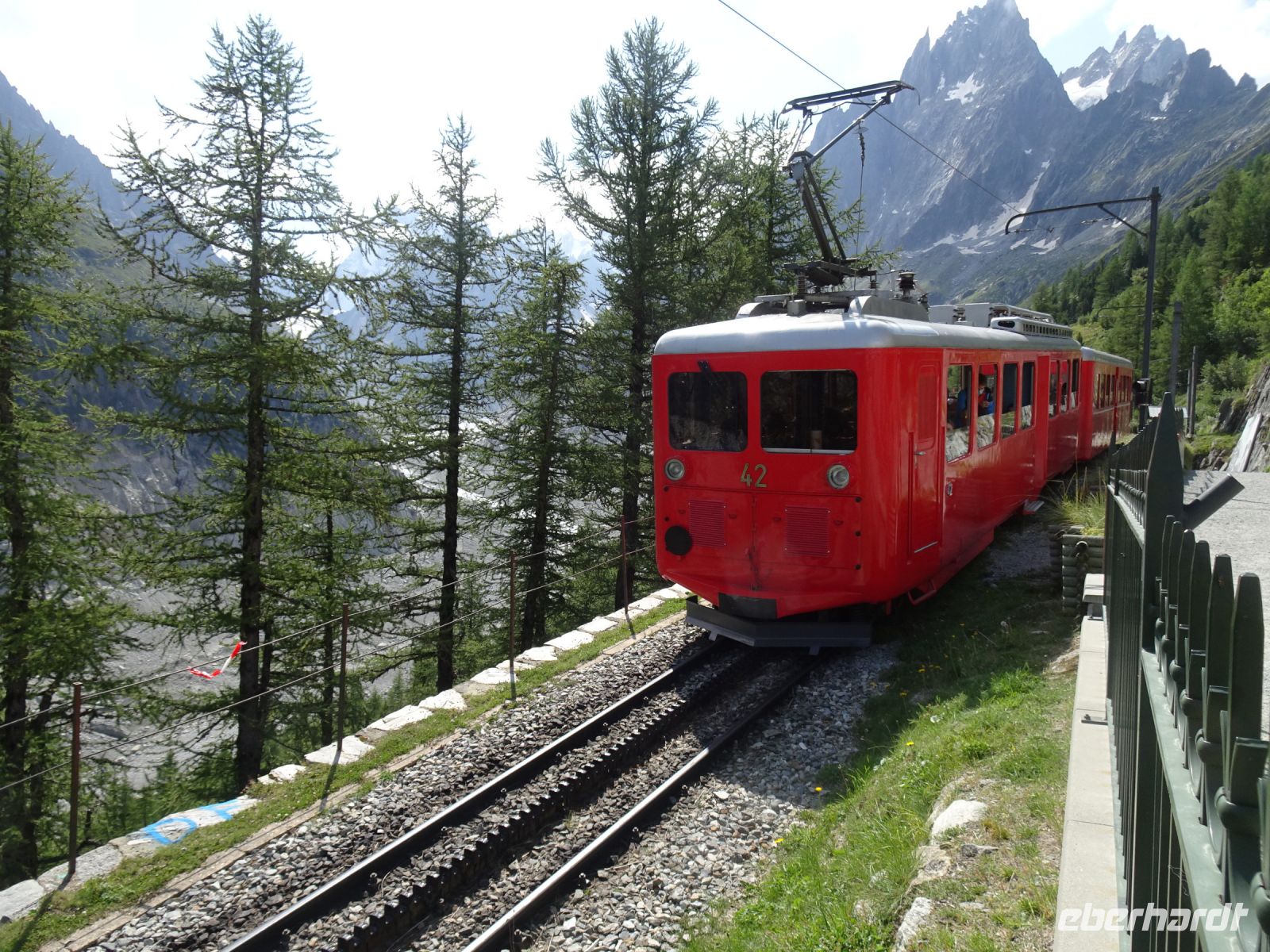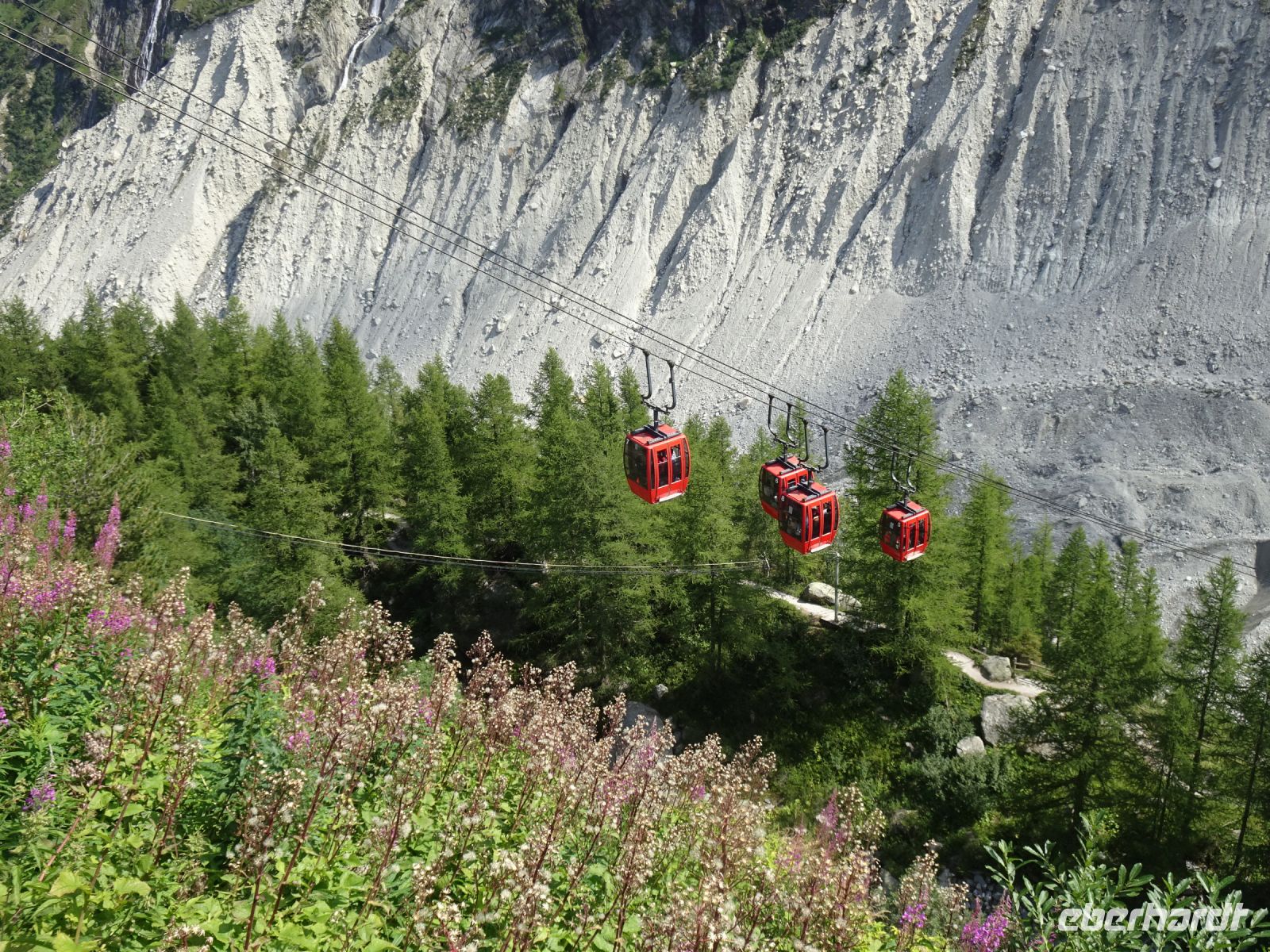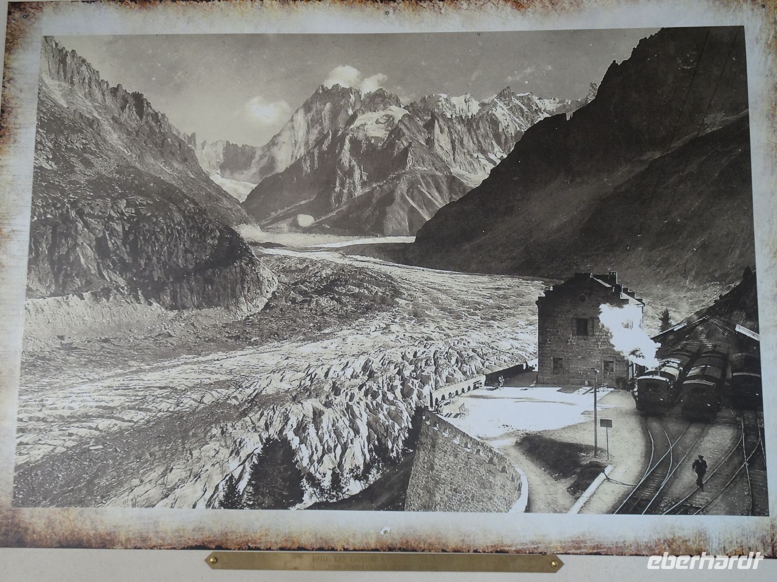 Von Chatel ging es dabei durch das Wintersportgebiet Portes de Soleil vorbei an Morzine in das Arvetal. Die Anfahrt nach Chamonix war grandios, da wir bei bestem Wetter ein herrliches Panorama der Berge und Gletscher hatten. Unser Ziel war für die Wandergruppe die Auffahrt zum Aiguille du Midi mit Blick auf das Mont Blanc-Massiv. Weitere Reisegäste schlossen sich den „Gipfelstürmern“ an. Ziel der anderen Reisegäste mit Reiseleiter Hartwig war die Auffahrt auf den Montenvers mit Blick auf den Eismeergletscher, den größten Gletscher der Mont Blanc-Gruppe. Die Auffahrt mit der Zahnradbahn war beeindruckend. An der Bergstation Montenvers angekommen, bot sich uns zwar ein wunderbares Panorama, von dem Eismeergletscher sind im Tal aber nur noch spärliche Reste zu sehen. Das Bild des Gletschers auf einer alten Fotoaufnahme zeigte uns den Wandel innerhalb von etwa 100 Jahren beeindruckend und zum Nachdenken anregend. Die Abfahrt mit einer sporadisch fahrenden Kabinenbahn sowie anschließender Abstieg über Treppen zum Gletscher ist prinzipiell möglich, dafür muss man aber ausreichend Zeit einplanen. Trotzdem ist Montenvers mit seiner Terrasse, der wunderbaren Vegetation und den vielfältigen Ausblicken einen Besuch wert. Mineralienfreunde sollten die Kristallgrotte, einen etwa 50 m langen Gang durch den Berg, mit prächtigen Mineralienstufen aus der Gegend des Mont Blanc-Massivs, nicht verpassen.