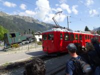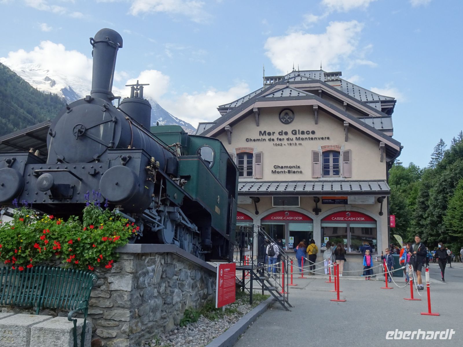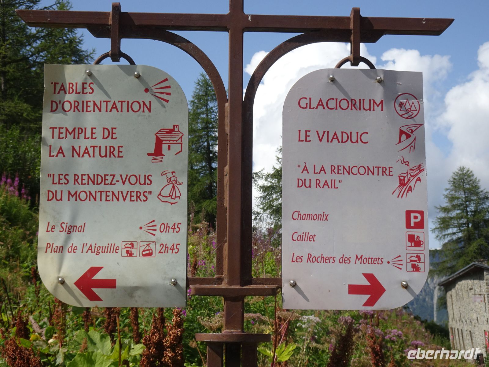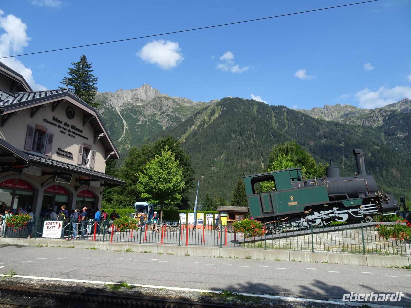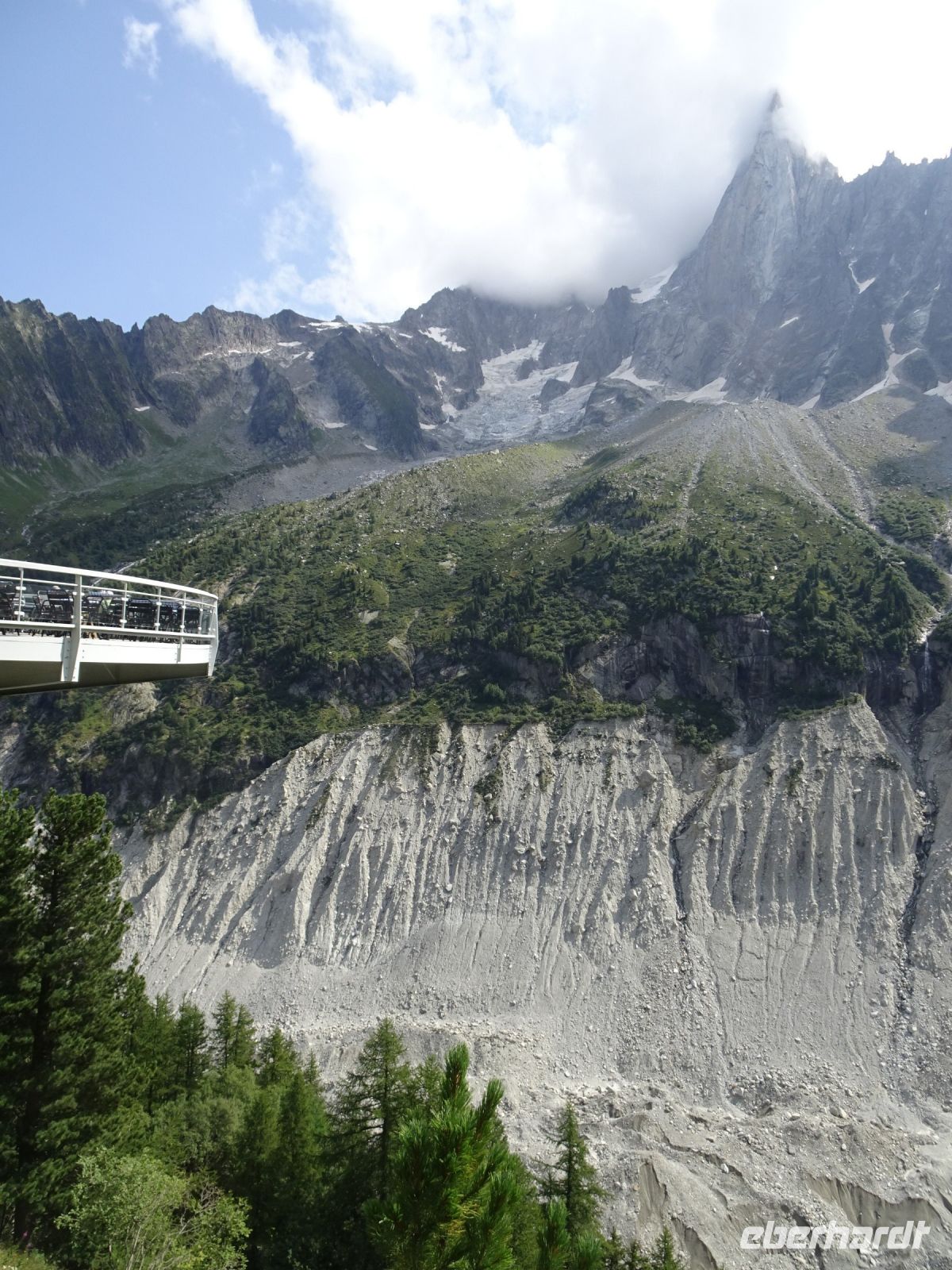 Von Chatel ging es dabei durch das Wintersportgebiet Portes de Soleil vorbei an Morzine in das Arvetal. Die Anfahrt nach Chamonix war grandios, da wir bei bestem Wetter ein herrliches Panorama der Berge und Gletscher hatten. Unser Ziel war für die Wandergruppe die Auffahrt zum Aiguille du Midi mit Blick auf das Mont Blanc-Massiv. Weitere Reisegäste schlossen sich den „Gipfelstürmern“ an. Ziel der anderen Reisegäste mit Reiseleiter Hartwig war die Auffahrt auf den Montenvers mit Blick auf den Eismeergletscher, den größten Gletscher der Mont Blanc-Gruppe. Die Auffahrt mit der Zahnradbahn war beeindruckend. An der Bergstation Montenvers angekommen, bot sich uns zwar ein wunderbares Panorama, von dem Eismeergletscher sind im Tal aber nur noch spärliche Reste zu sehen. Das Bild des Gletschers auf einer alten Fotoaufnahme zeigte uns den Wandel innerhalb von etwa 100 Jahren beeindruckend und zum Nachdenken anregend. Die Abfahrt mit einer sporadisch fahrenden Kabinenbahn sowie anschließender Abstieg über Treppen zum Gletscher ist prinzipiell möglich, dafür muss man aber ausreichend Zeit einplanen. Trotzdem ist Montenvers mit seiner Terrasse, der wunderbaren Vegetation und den vielfältigen Ausblicken einen Besuch wert. Mineralienfreunde sollten die Kristallgrotte, einen etwa 50 m langen Gang durch den Berg, mit prächtigen Mineralienstufen aus der Gegend des Mont Blanc-Massivs, nicht verpassen.
